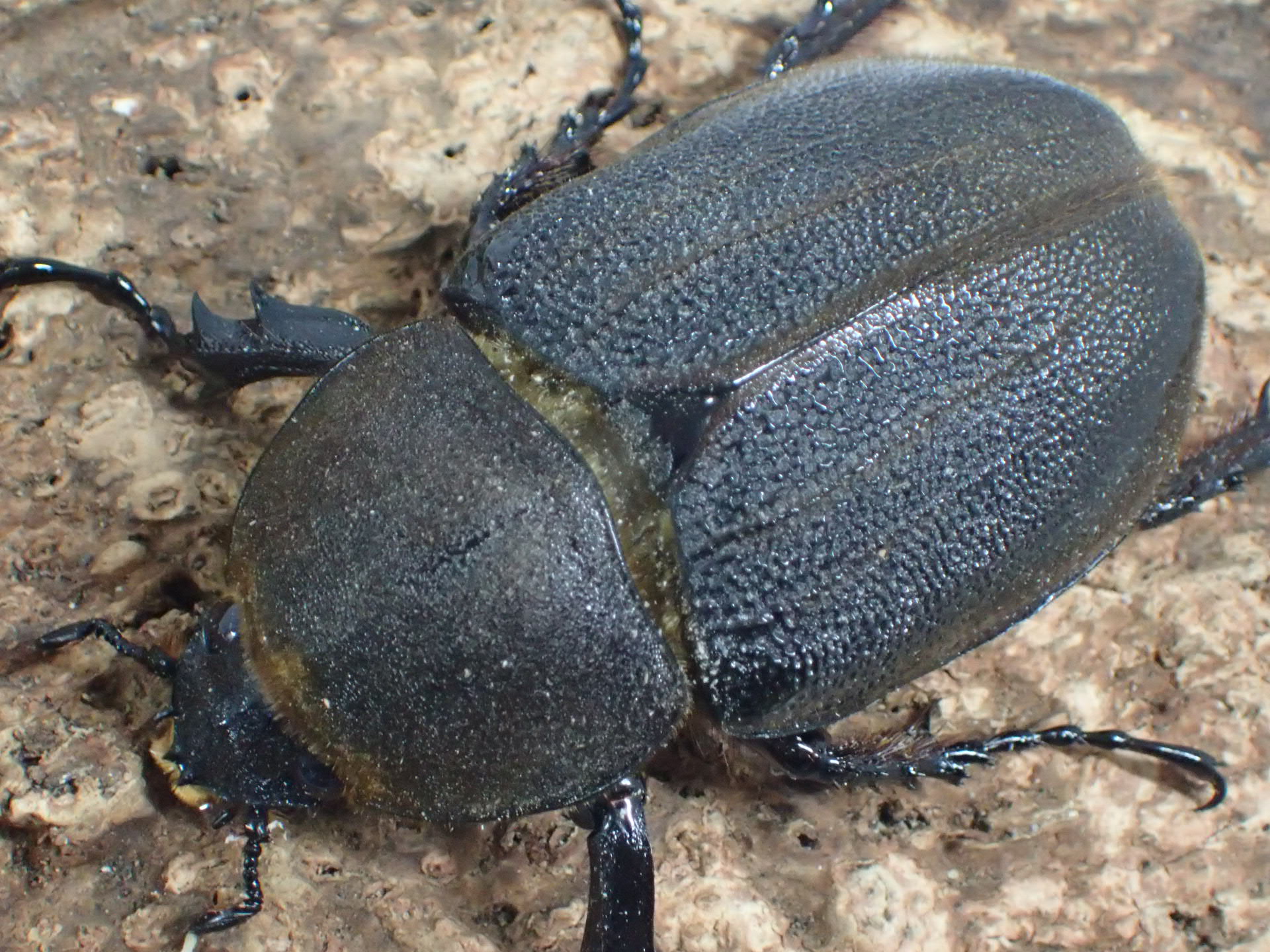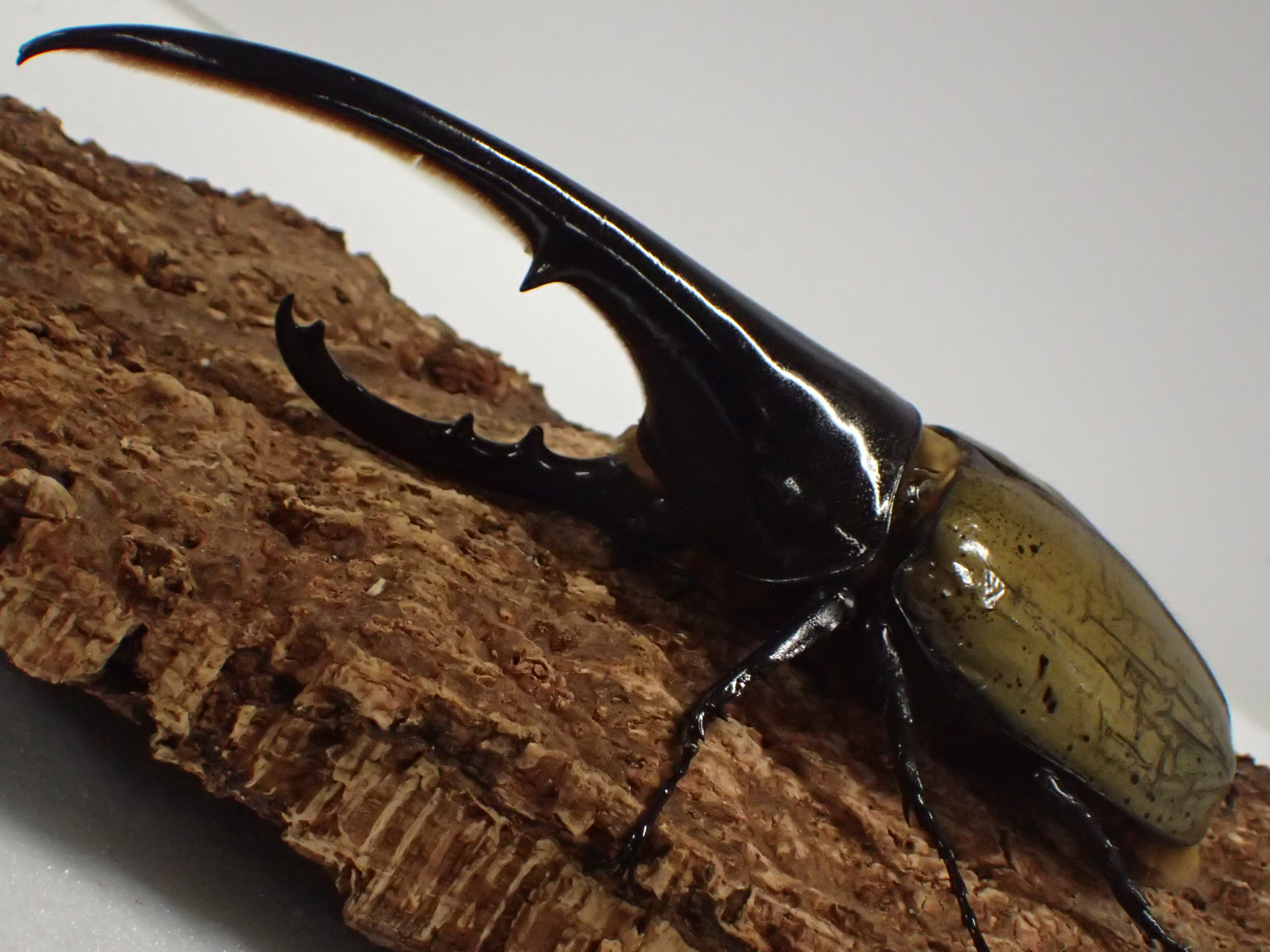 長い頭角と胸角をもち、黄色い上翅の世界最大のカブトムシ。