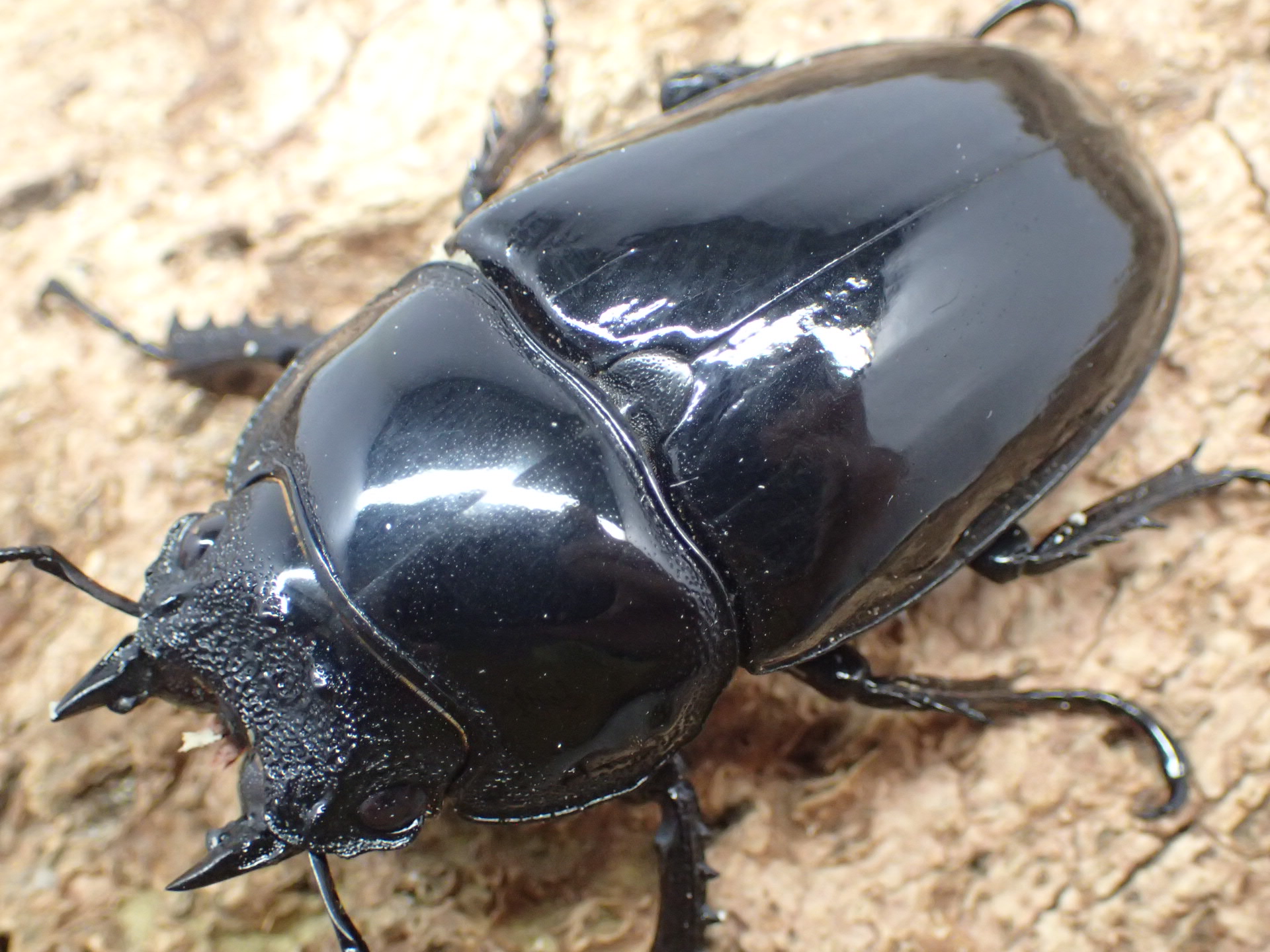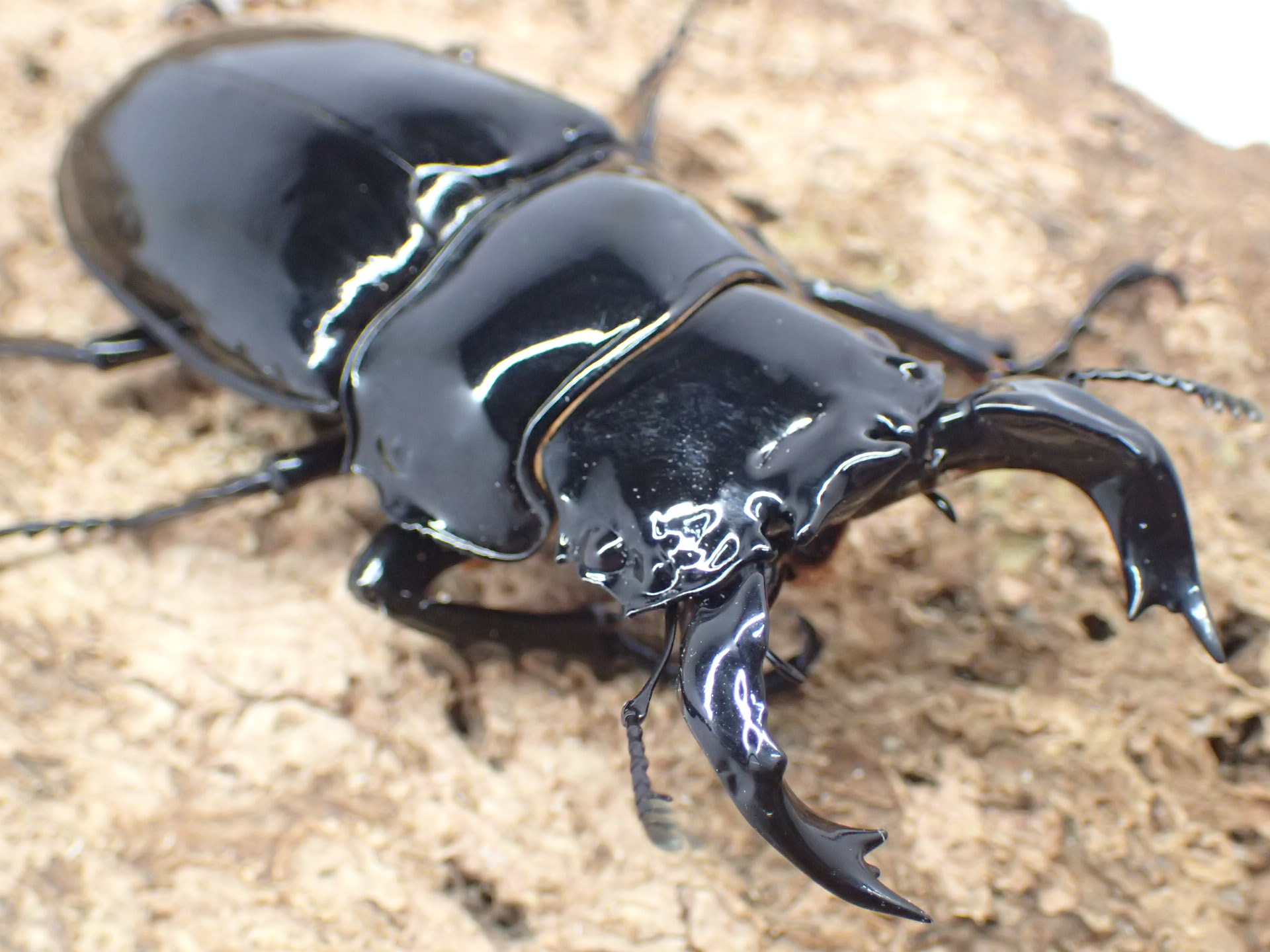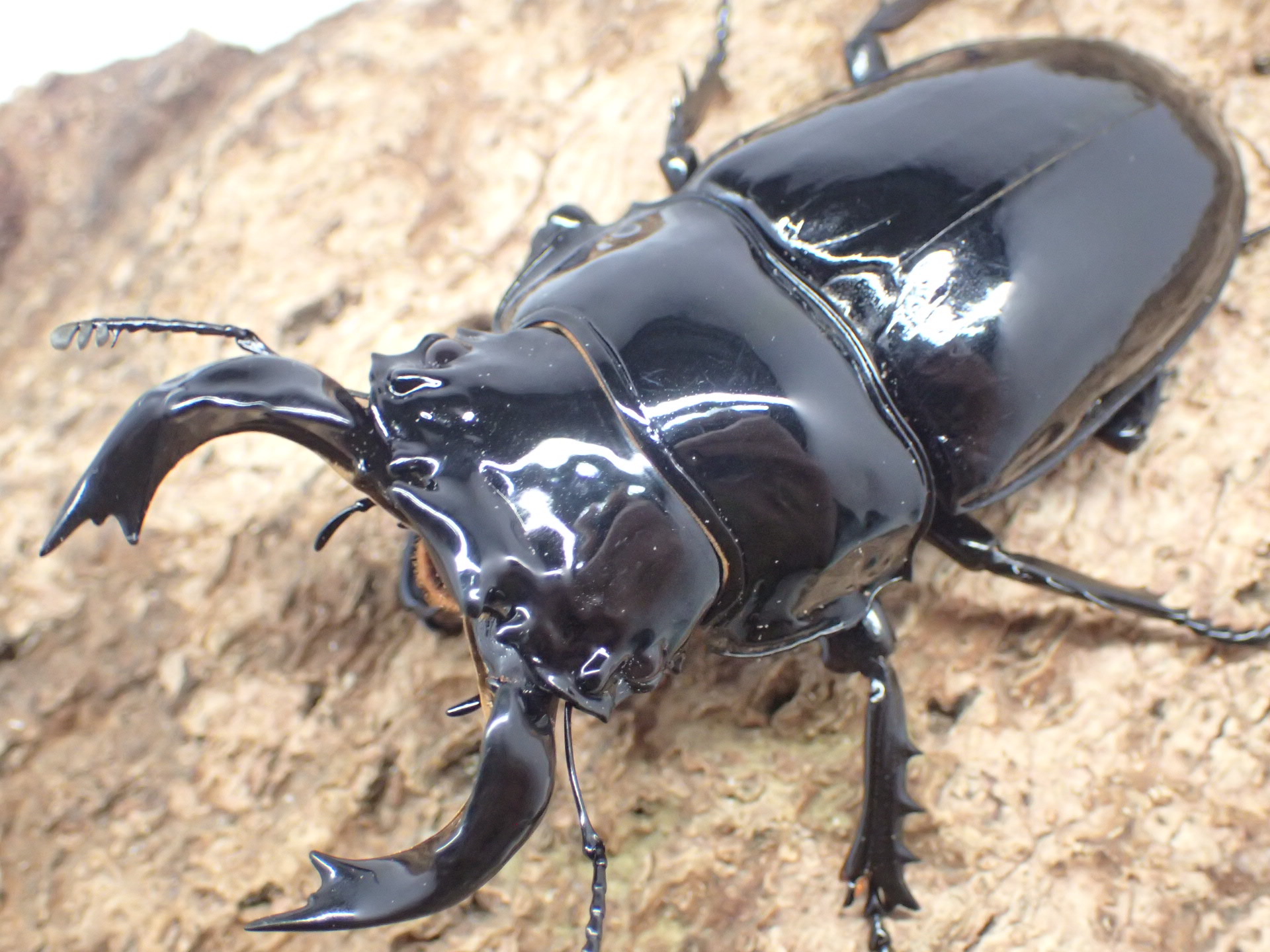 全身漆黒色でエナメルのような強い光沢をもち、レギウスオオツヤクワガタと並んでアフリカ最大級のクワガタです。
