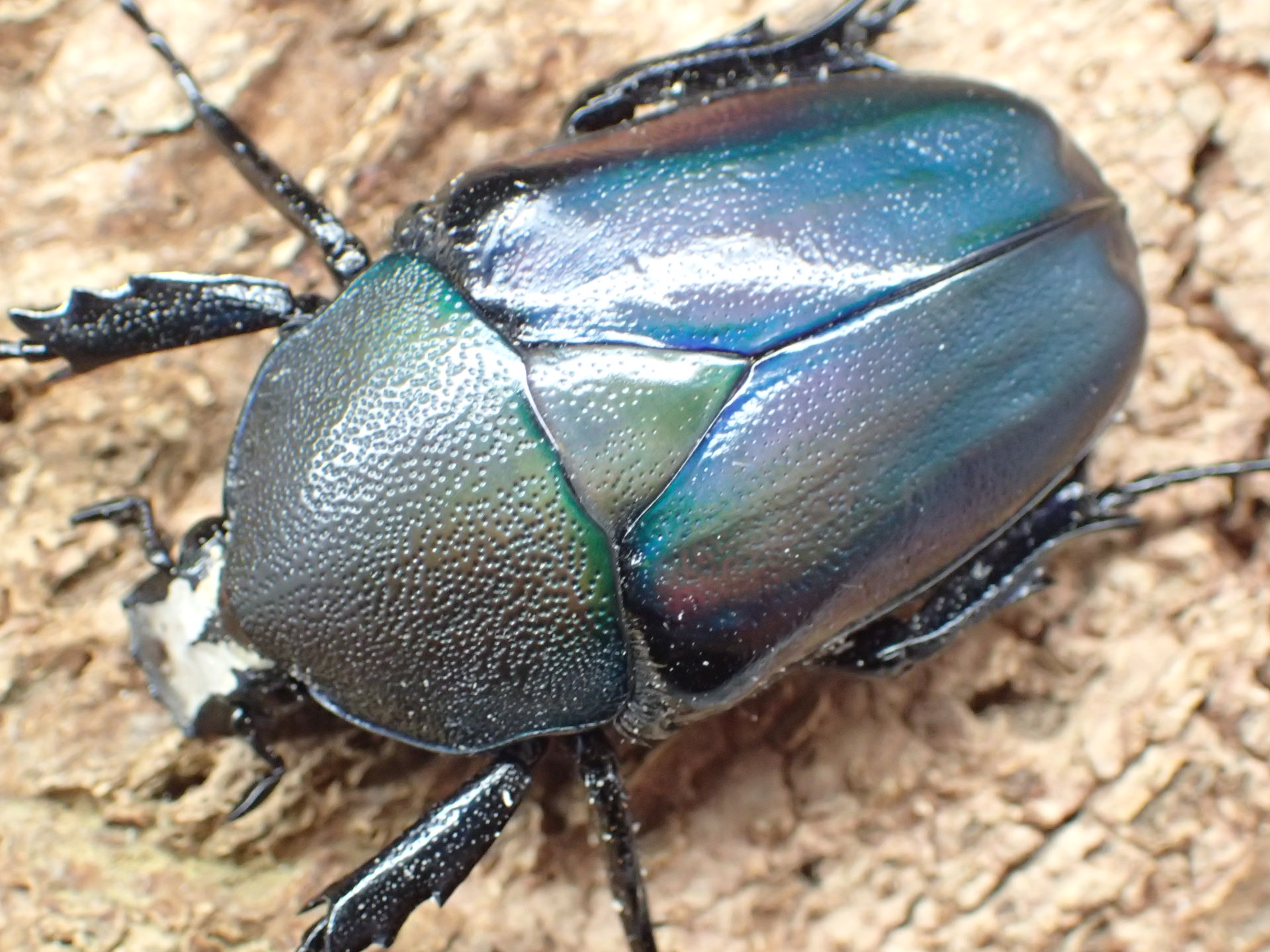 上翅の側縁や中央部に白い帯状の紋があり、シロスジオオツノカナブンとも呼ばれます。