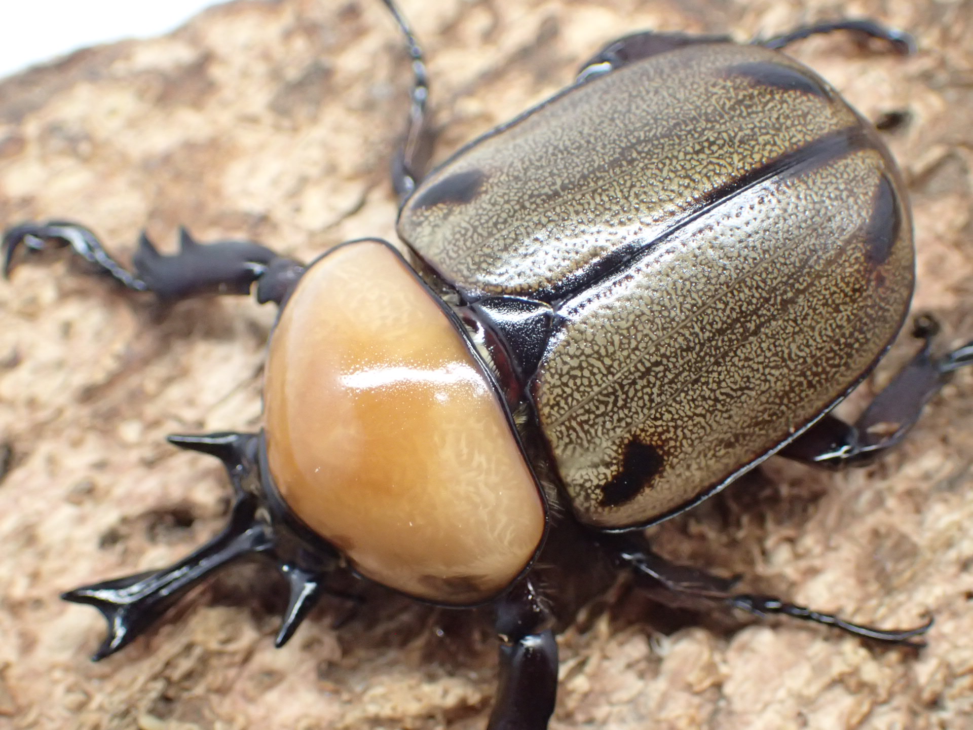 上翅の前方肩部と後方中央部に4つの小さな黒紋があり、頭角は長く伸びて先端が二又に分かれ、頭部の側縁前方は大きく尖って斜め前方に突出します。