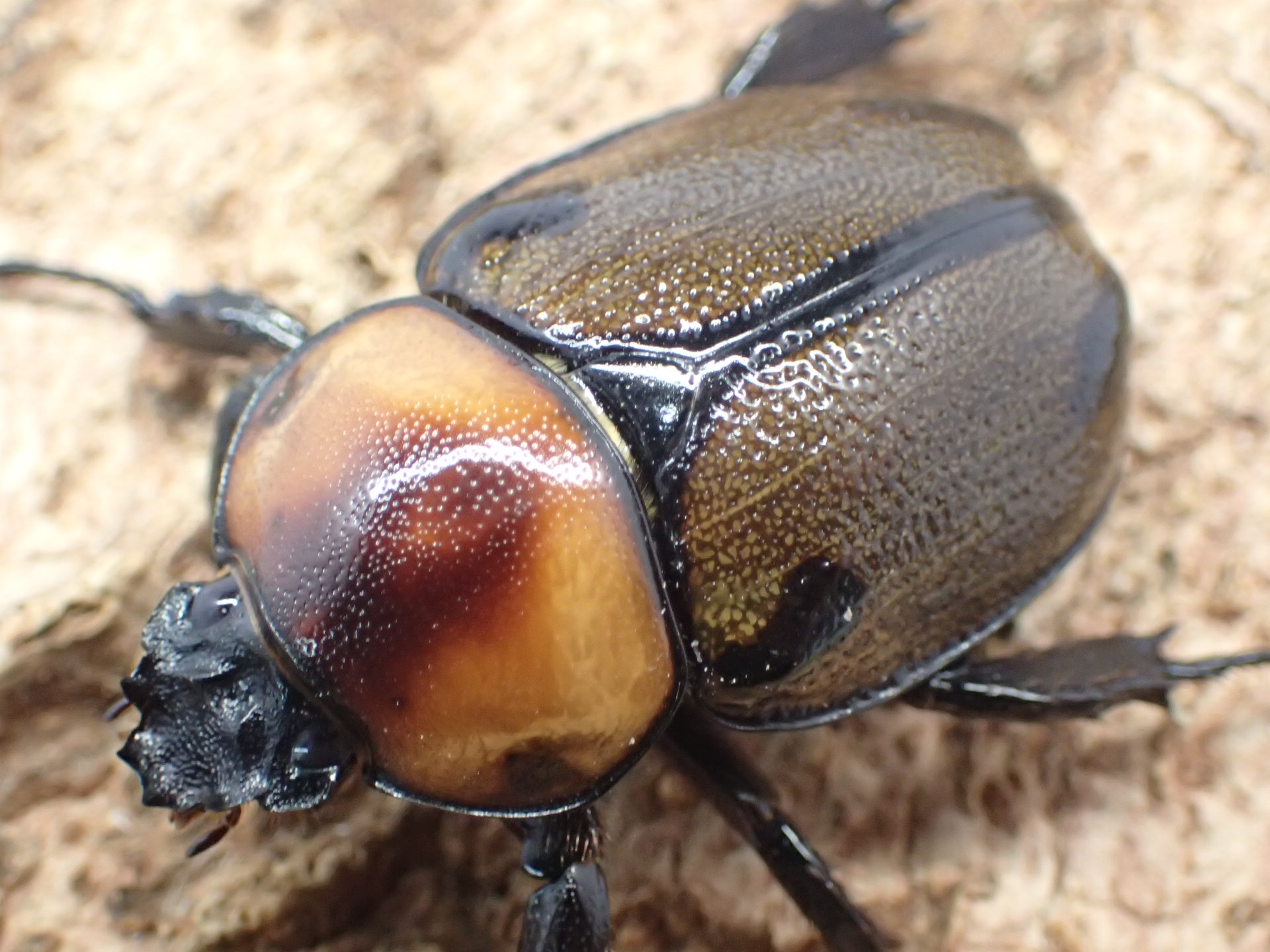 体は幅広く、前胸背は明るい褐色で、中央部に褐色の紋がでる個体や、メスでは前胸背の全体が黒化する個体もいます。