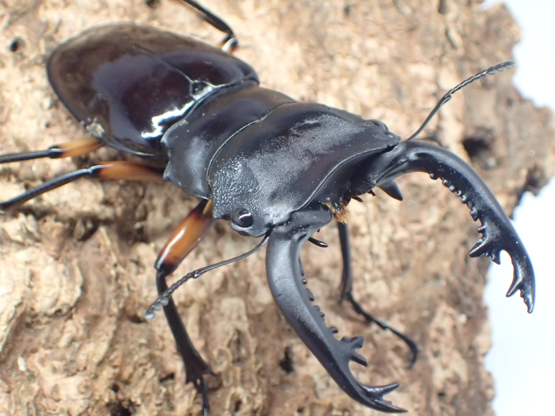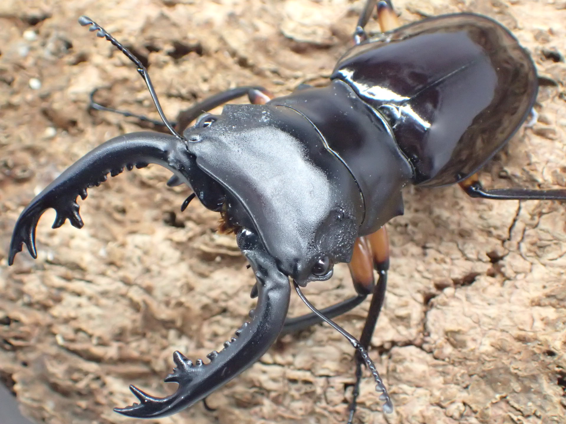 前胸背板と上翅に強い光沢をもち、全身の黒色に黄褐色~褐色の腿節が映えるツヤクワガタです。