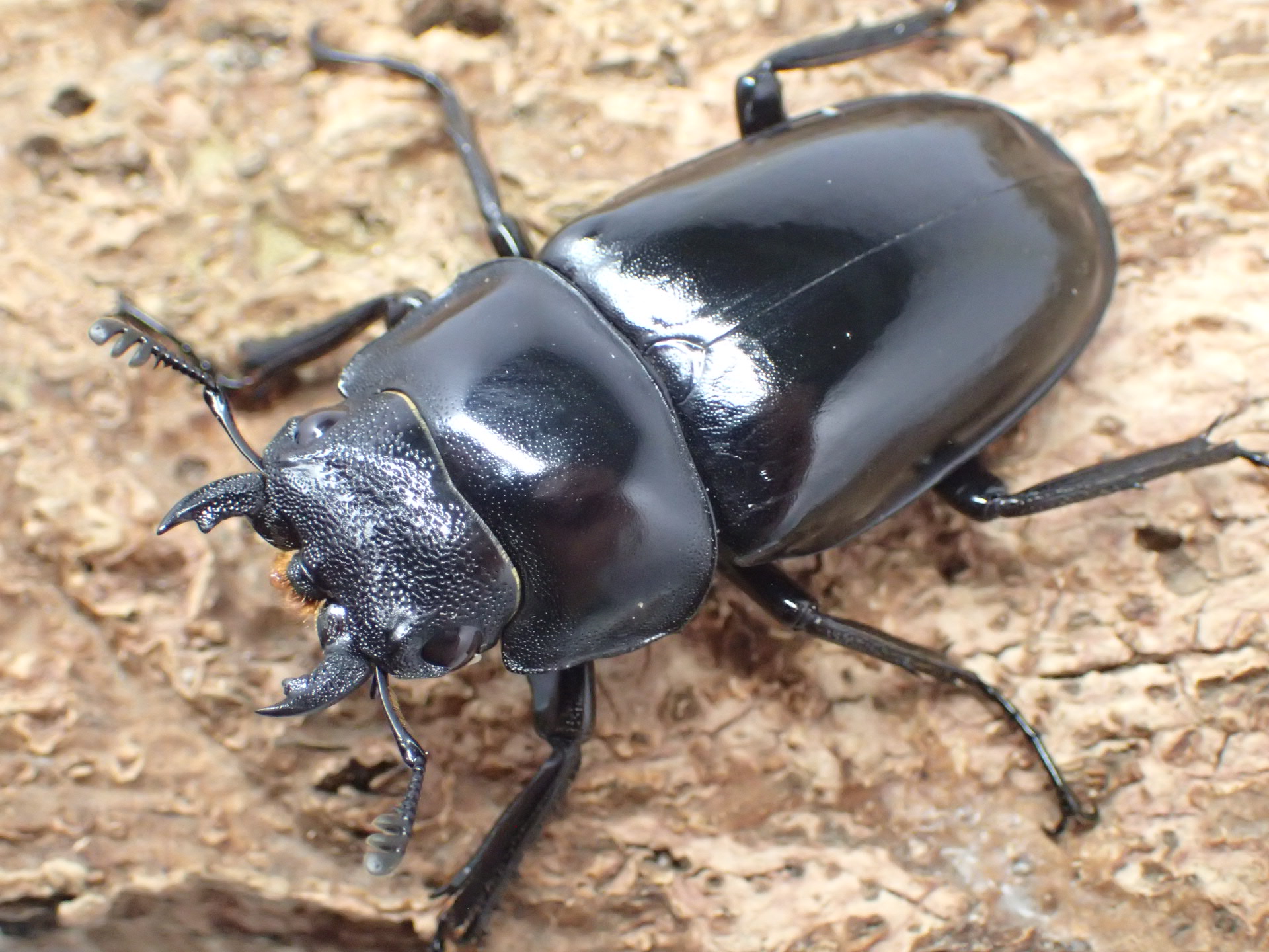 光沢が強く、大アゴは長く前方に伸び、基部にはやや基方を向いた大きな内歯があり、中央の内歯から少し間をあけて先端部まで鋸歯状に小さな内歯が並びます。