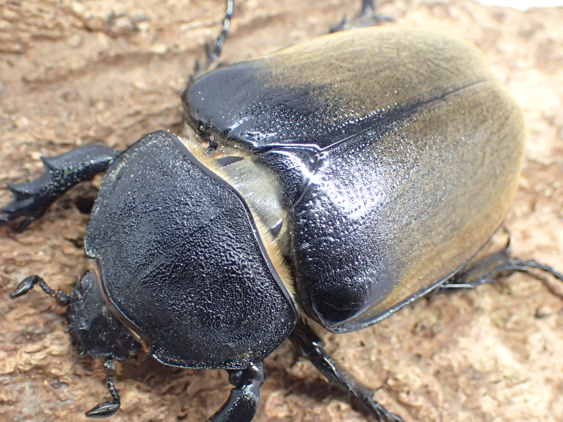 ギアスゾウカブトなどに見られる前胸中央の胸角はなく、痕跡のようにコブ状に盛り上がります。