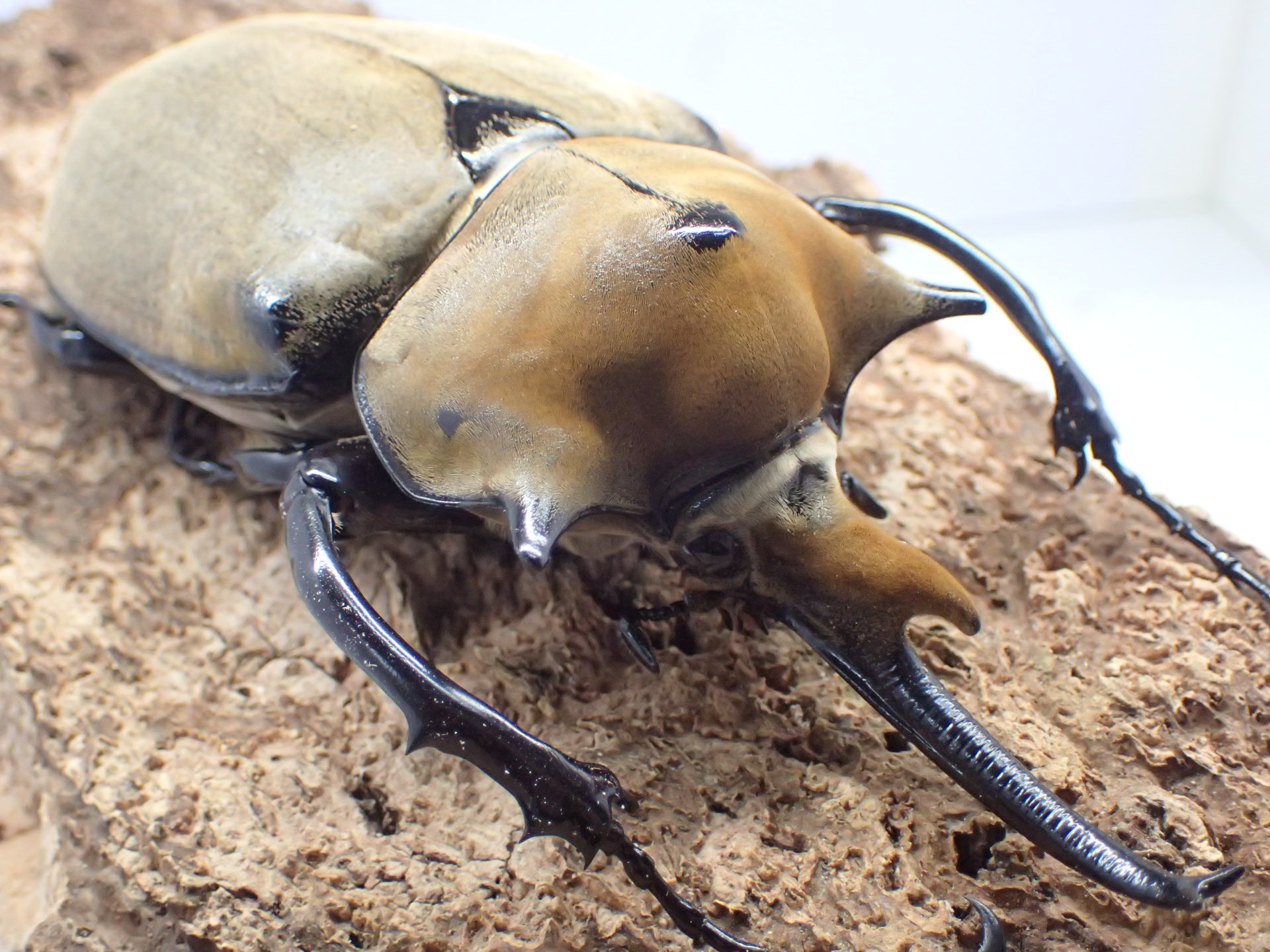 種名の「elephas」は「象」を意味し、大きな体と象の鼻のように長い頭角、全身の微毛などまさに「ゾウカブト」と呼ぶにふさわしいカブトムシです。