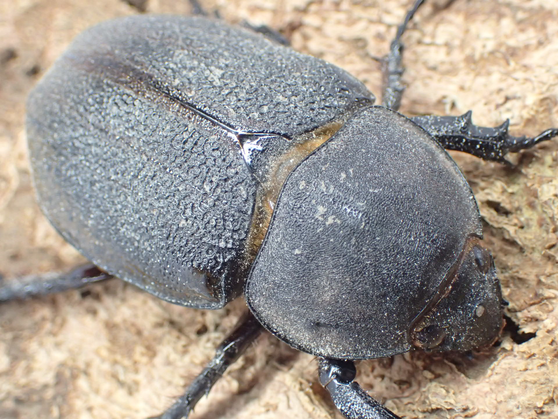 長い頭角と胸角をもち、黄色い上翅の世界最大のカブトムシ。