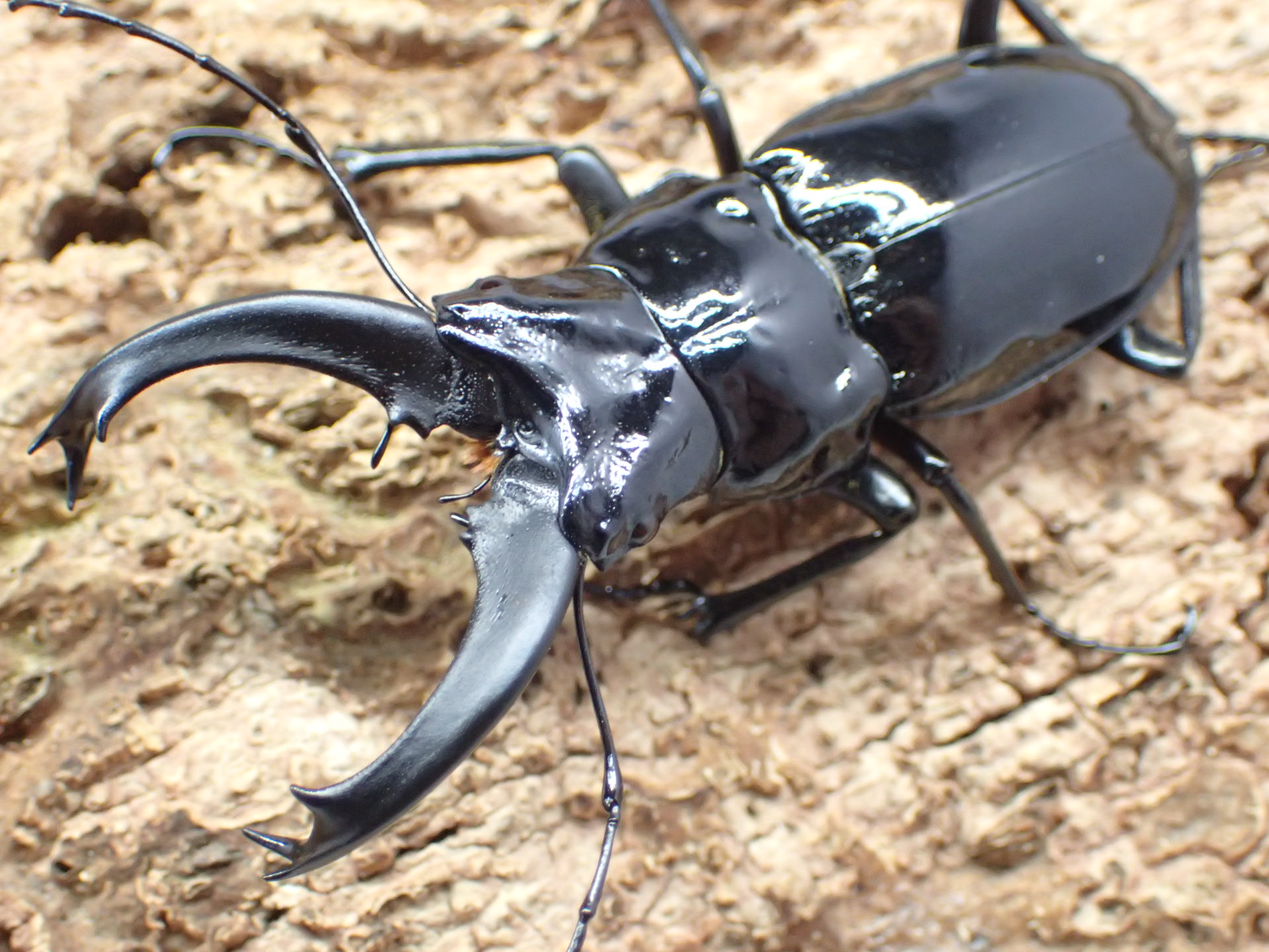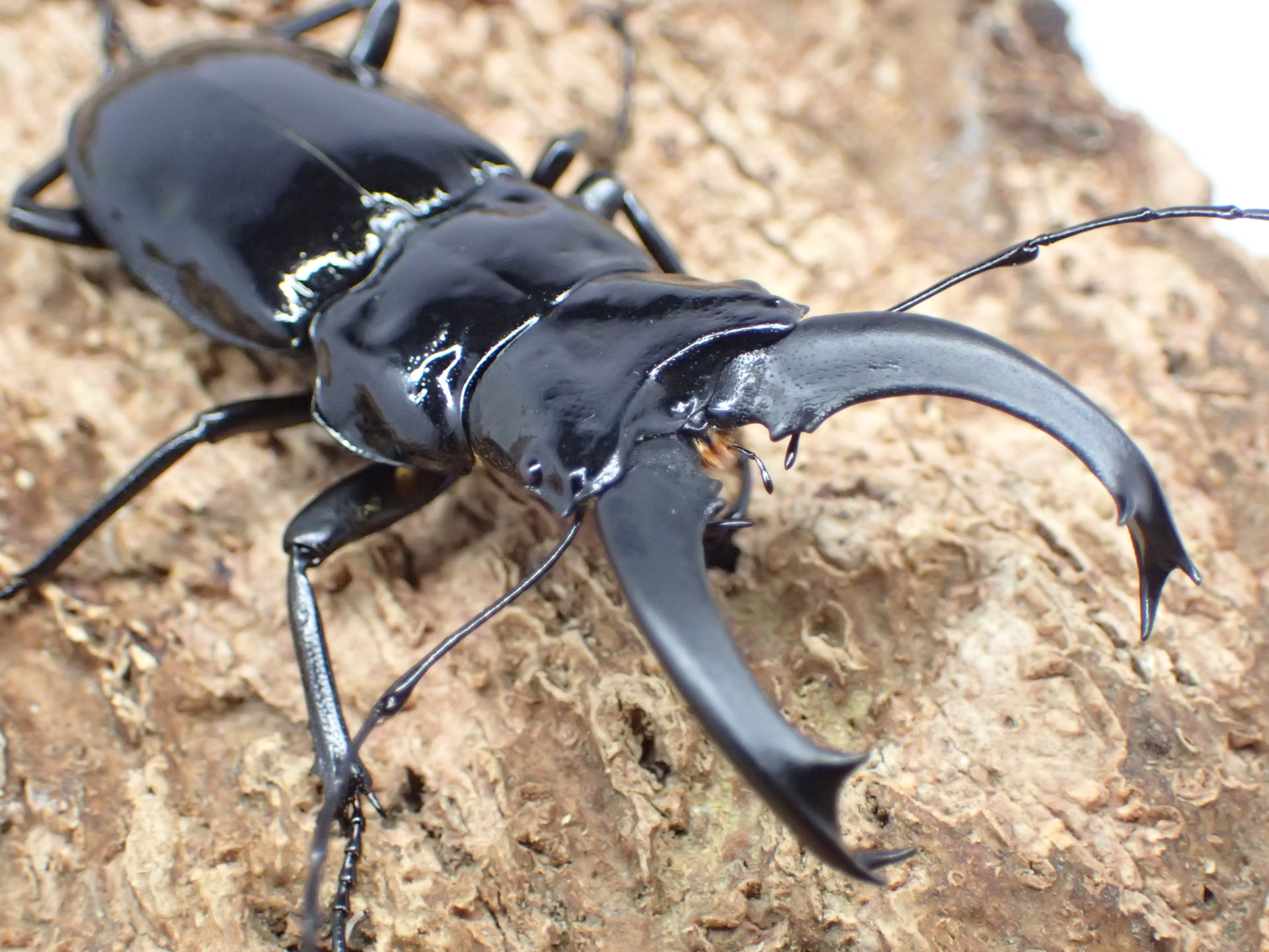 オオツヤクワガタのように黒色でエナメルを塗ったような強い光沢があるクビボソツヤクワガタ属の1種。