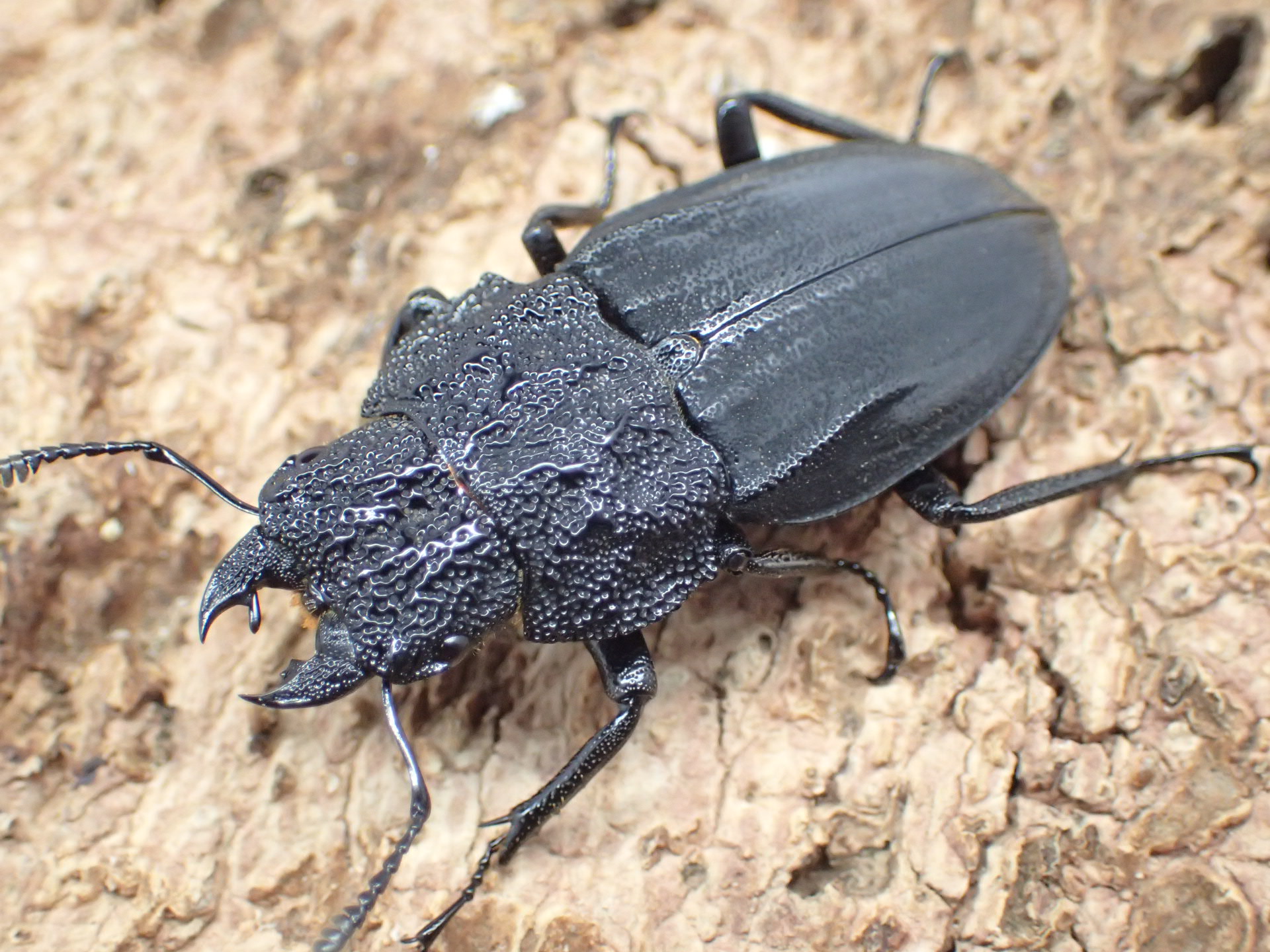 メスの頭部と前胸背板は点刻が大きく、凹凸の多い著しいアバタ状で、上翅はツヤ消しのビロード状で、オスとは似つかない姿をしています。