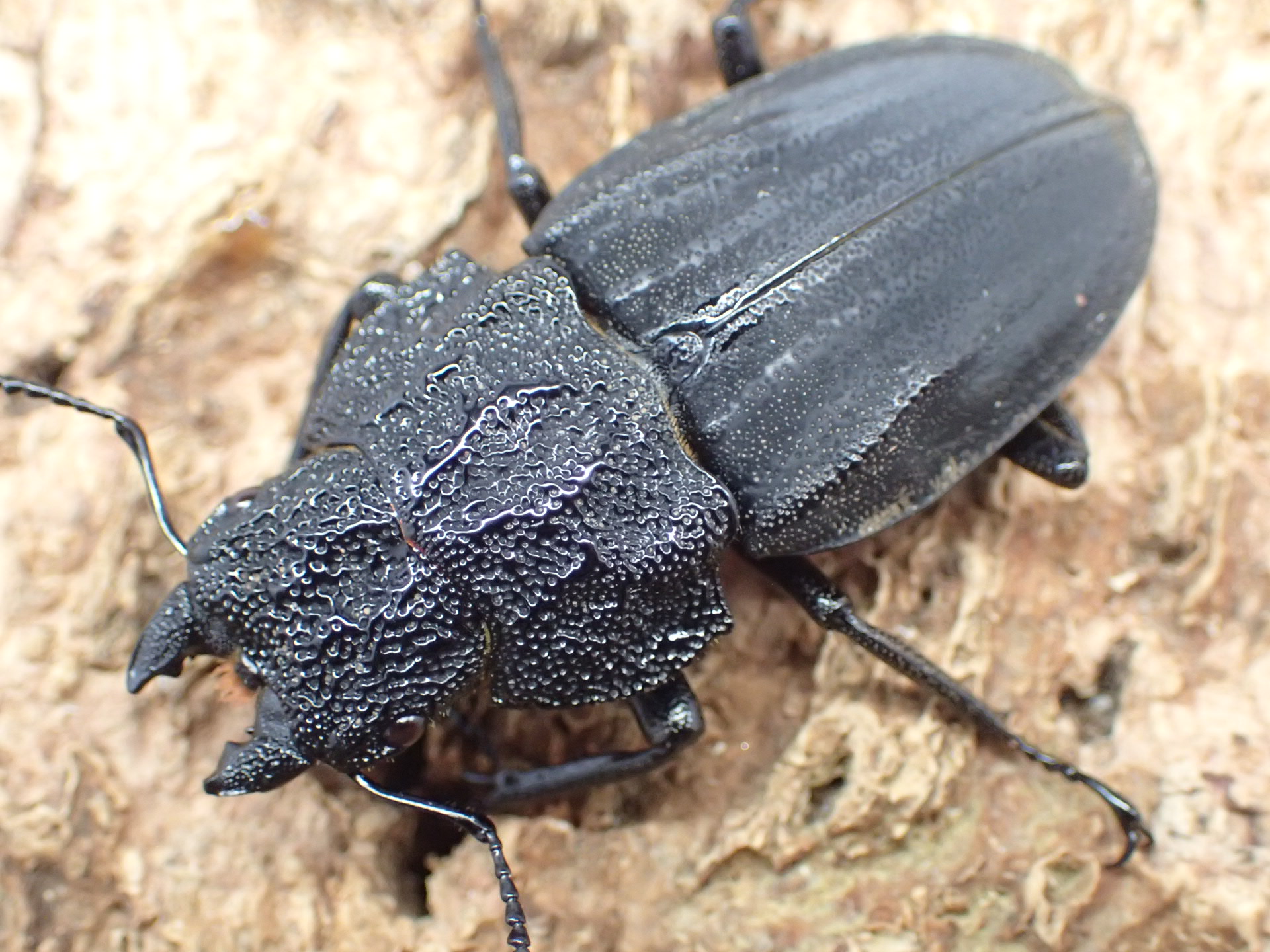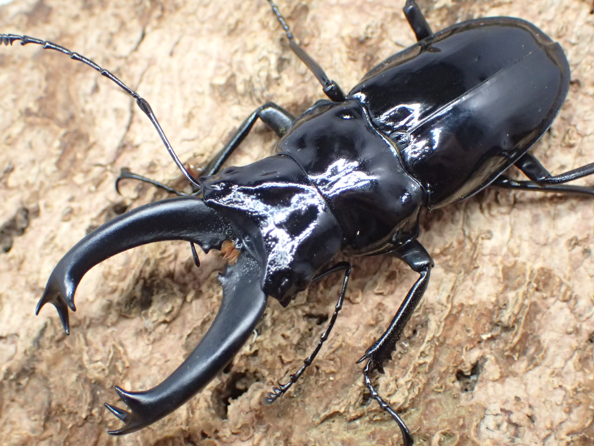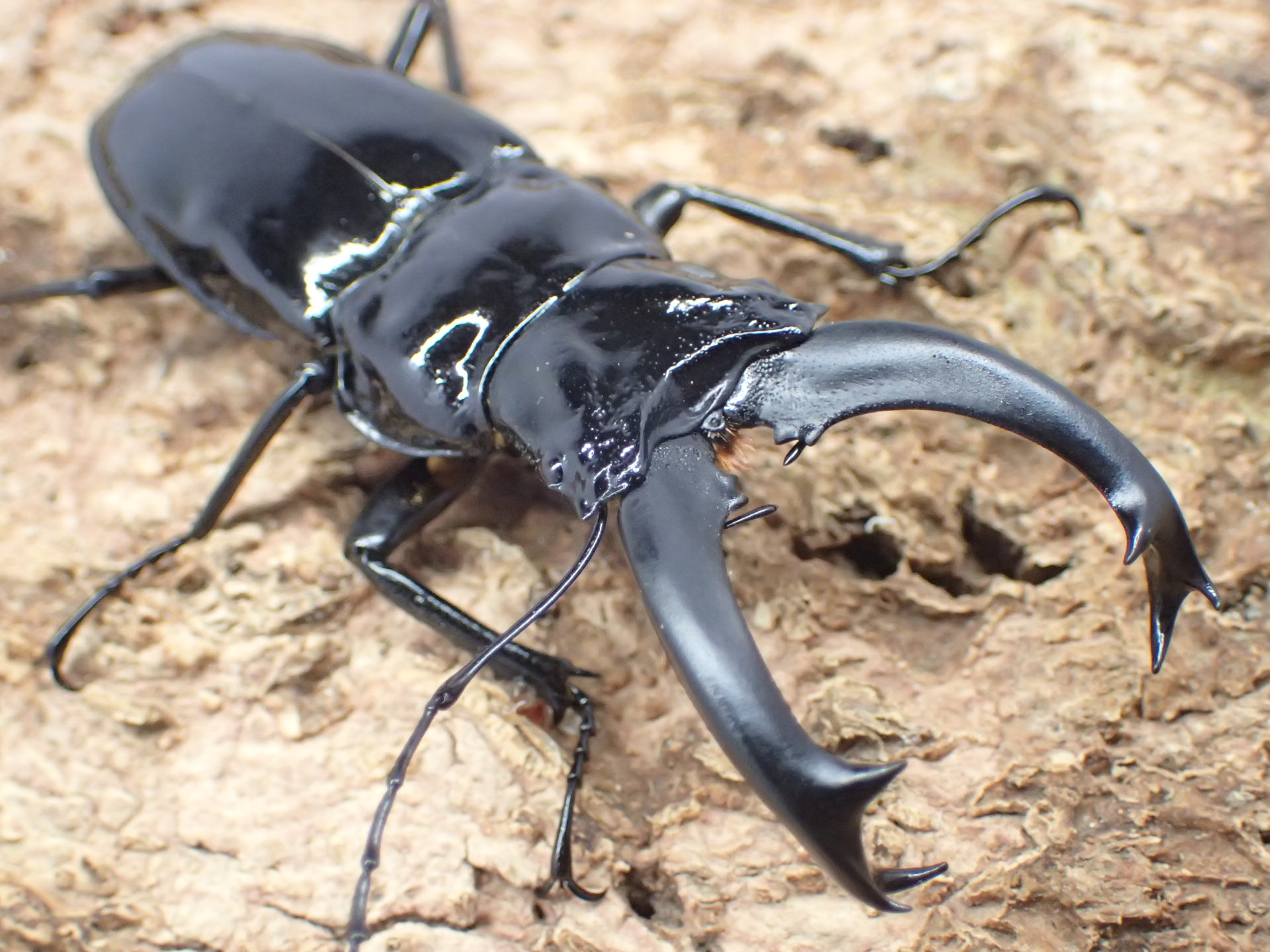 オオツヤクワガタのように黒色でエナメルを塗ったような強い光沢があるクビボソツヤクワガタ属の1種。