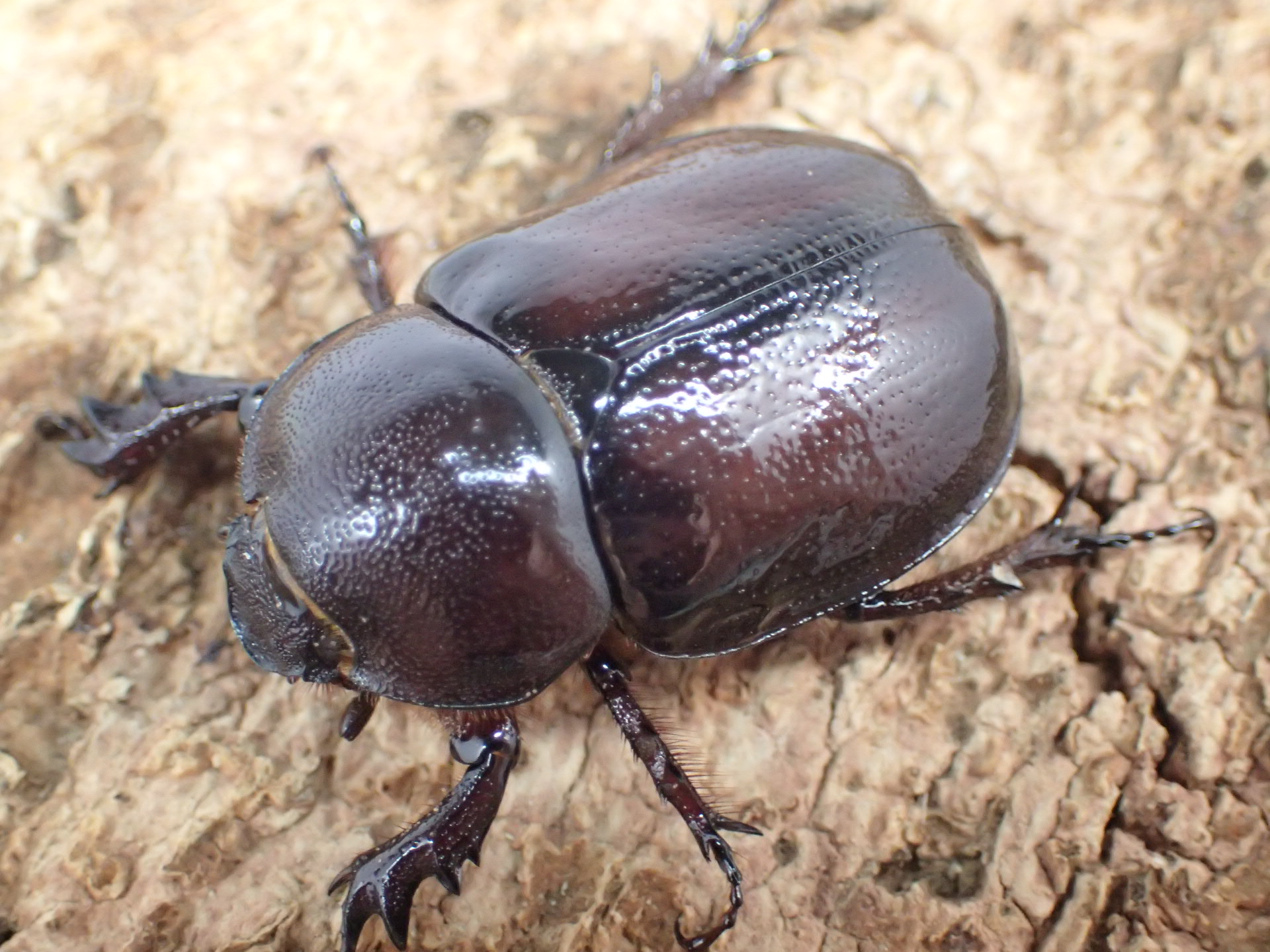 体は黒~褐色で光沢が強く、頭角は長く前方に伸びて、胸角も大きく発達します。
