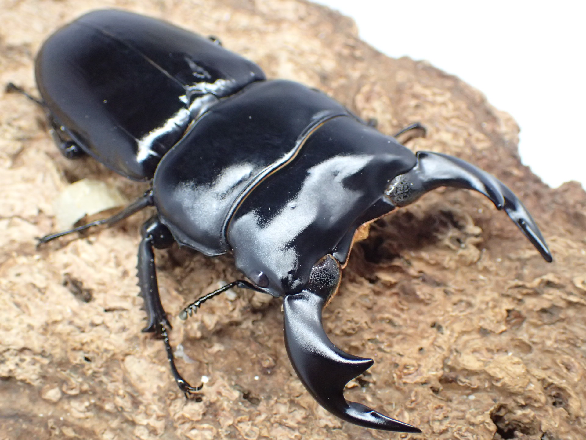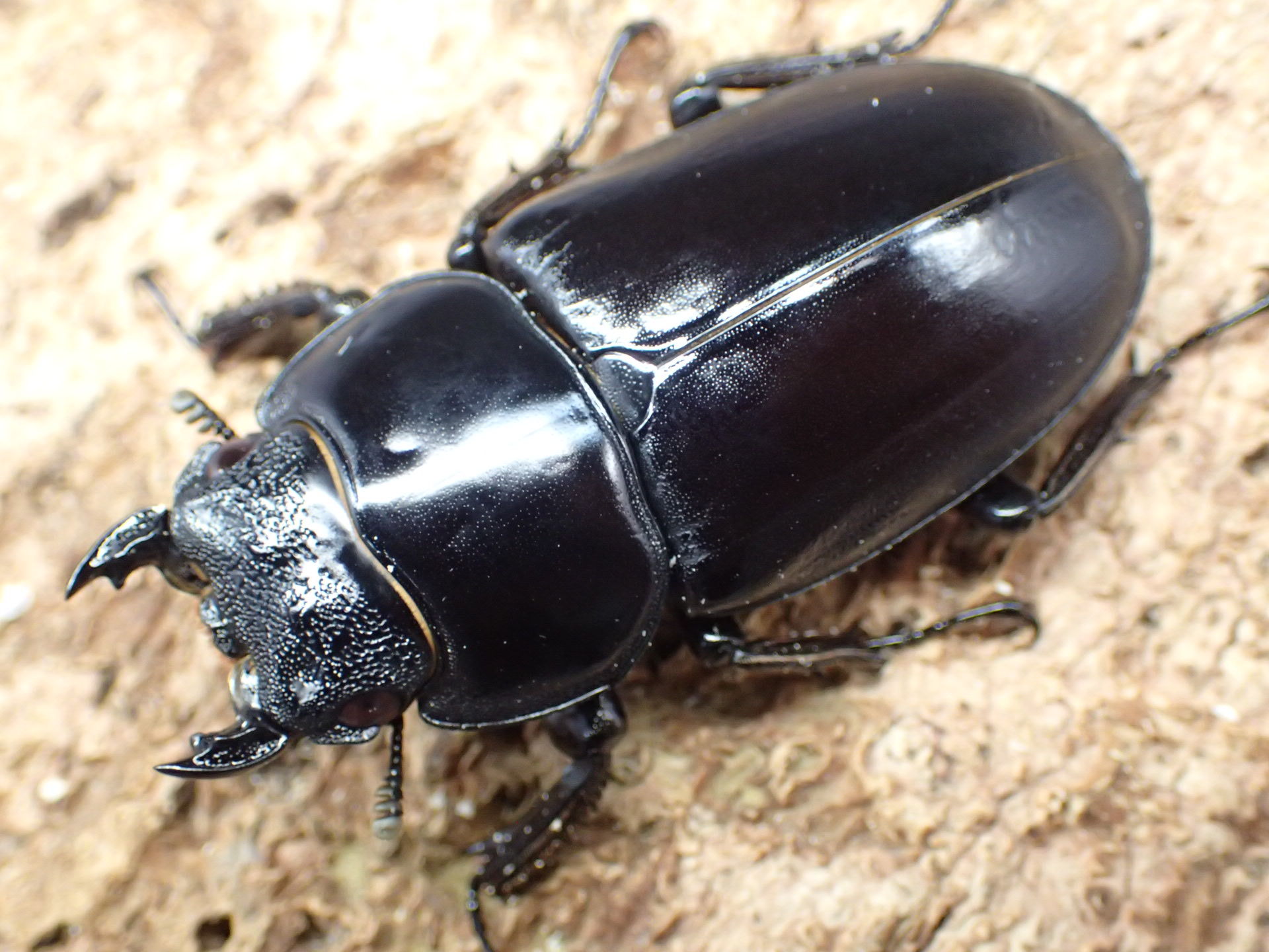 体が幅広く光沢があり、大アゴは太短く、「く」の字に屈曲します。