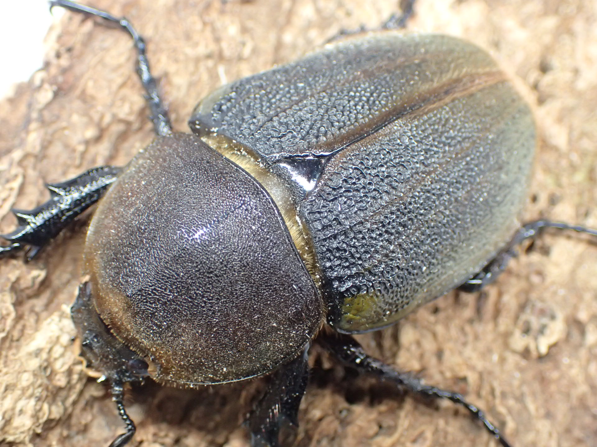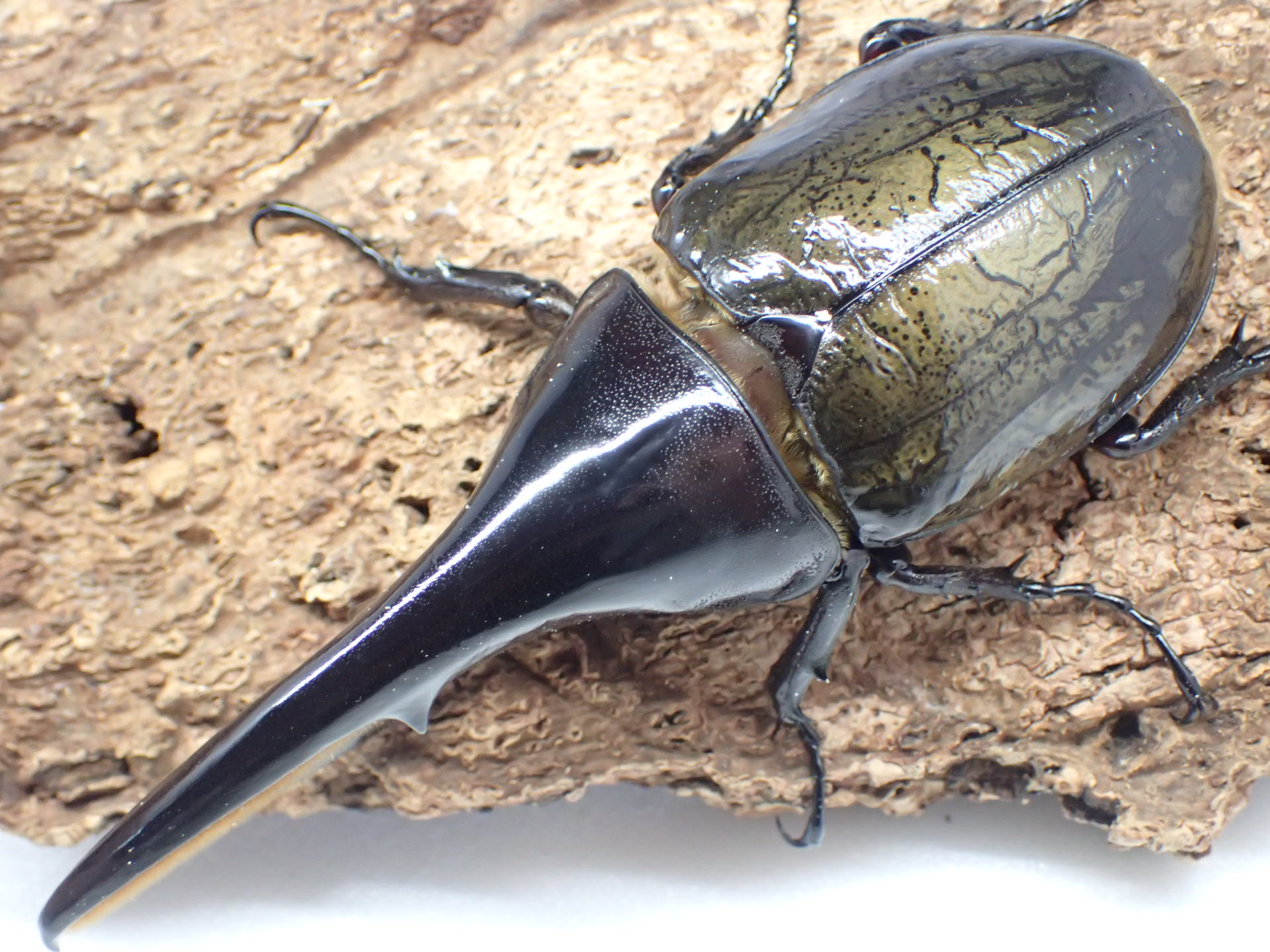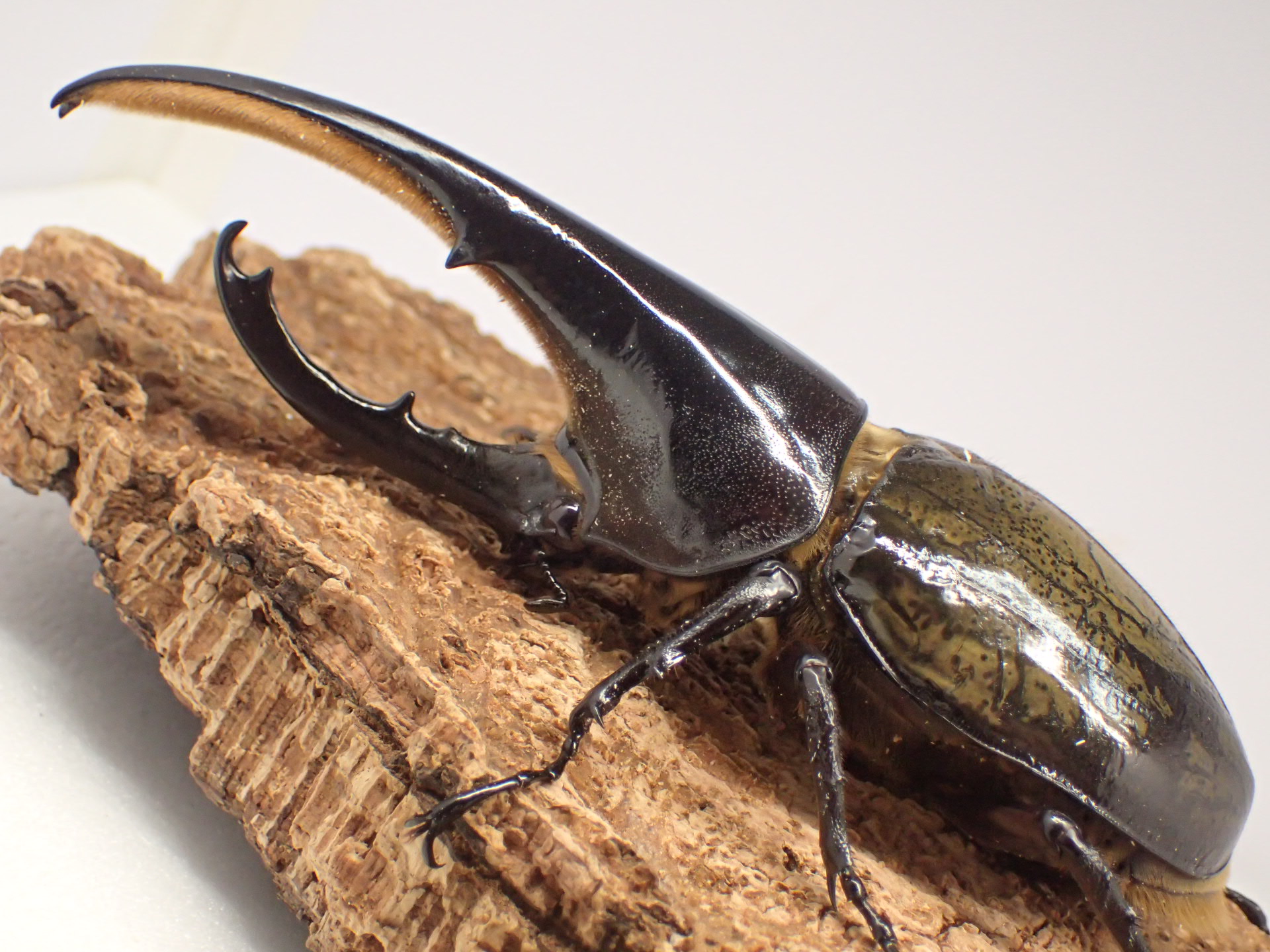 長い頭角と胸角をもち、黄色い上翅の世界最大のカブトムシ。
