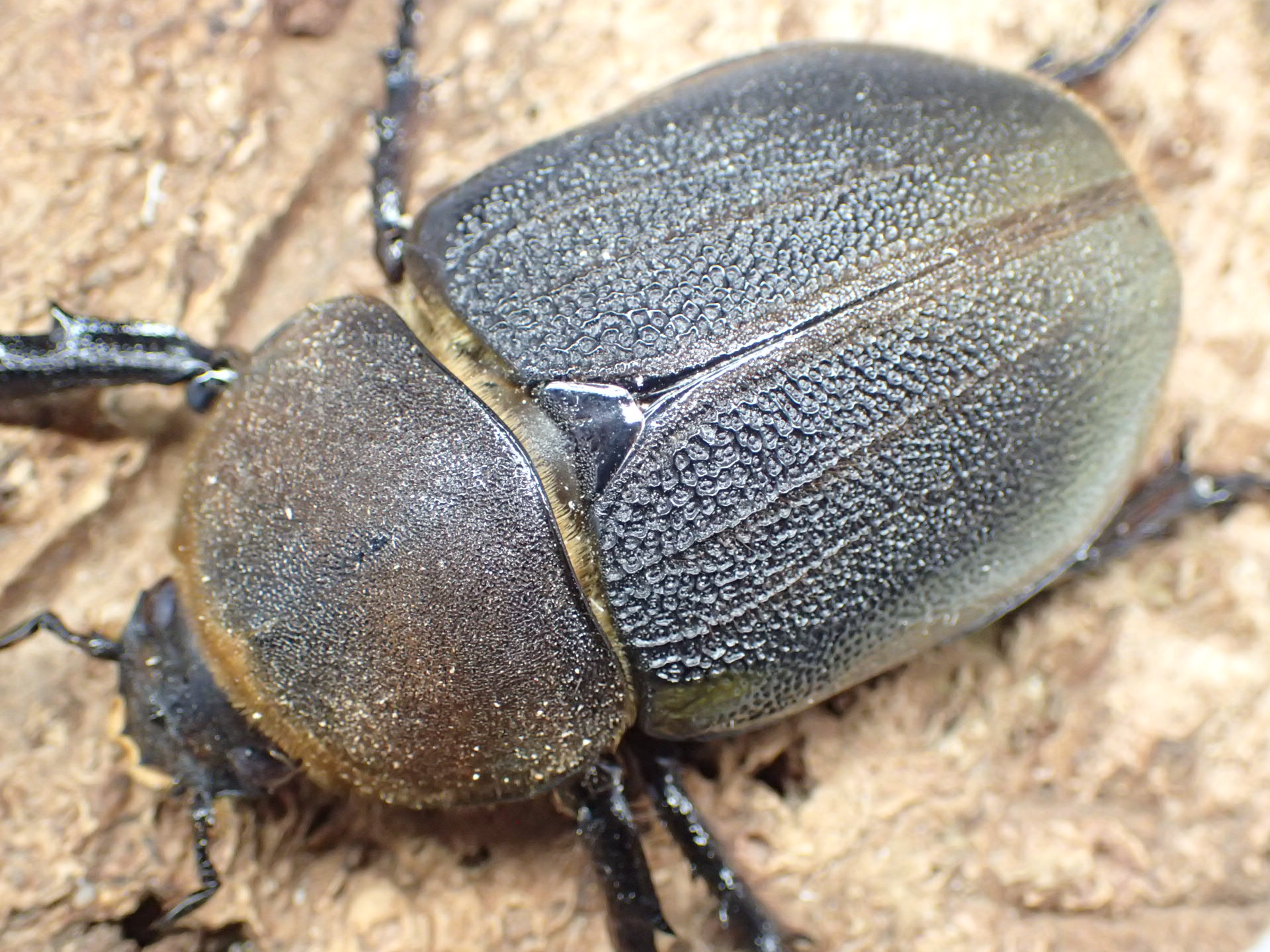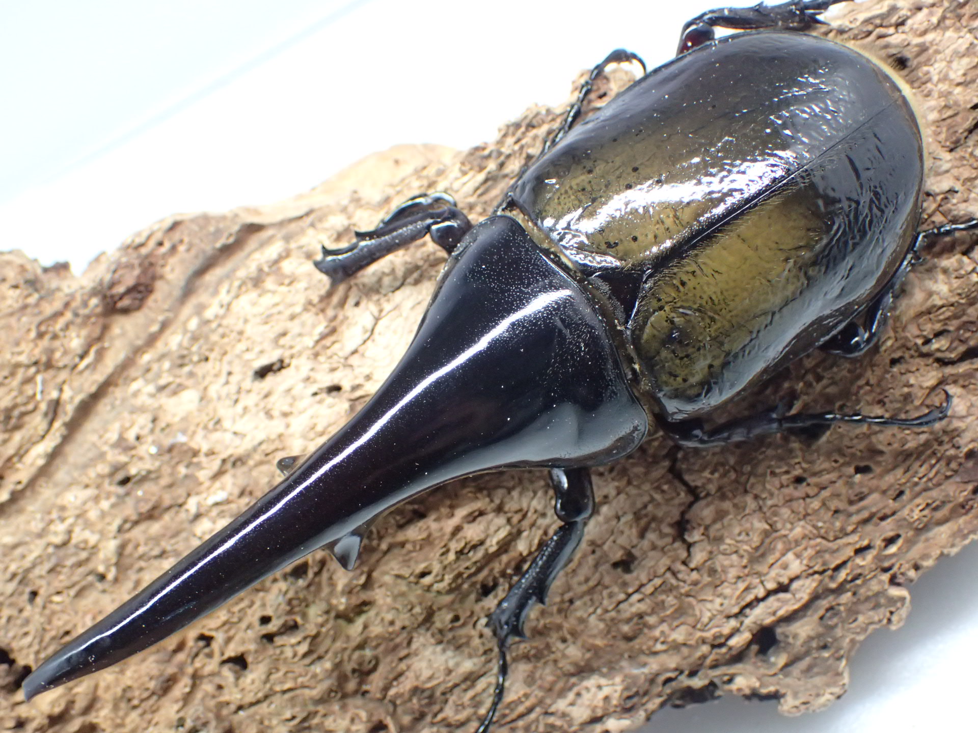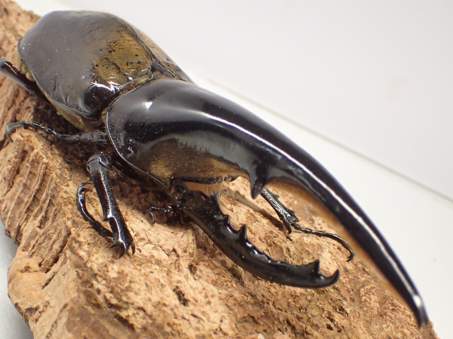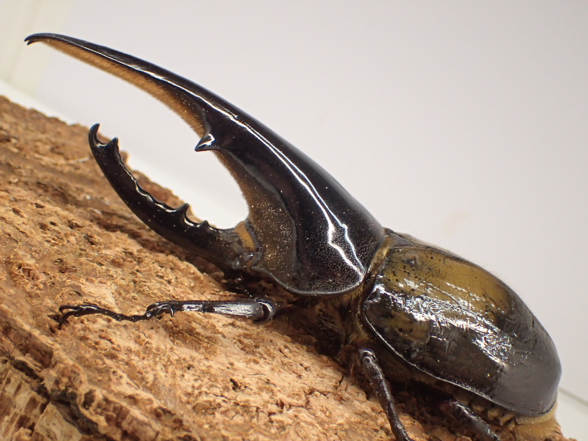 長い頭角と胸角をもち、黄色い上翅の世界最大のカブトムシ。