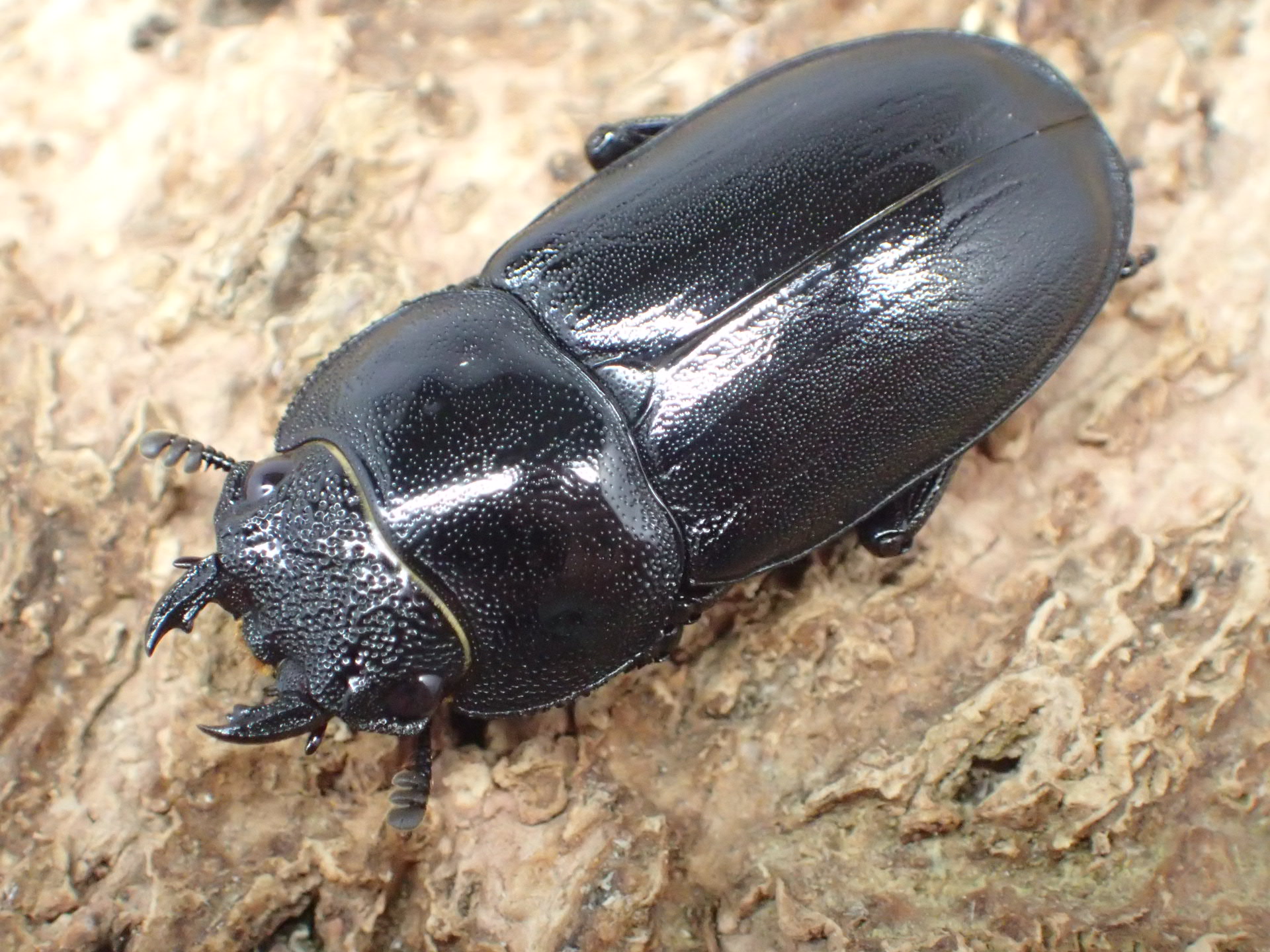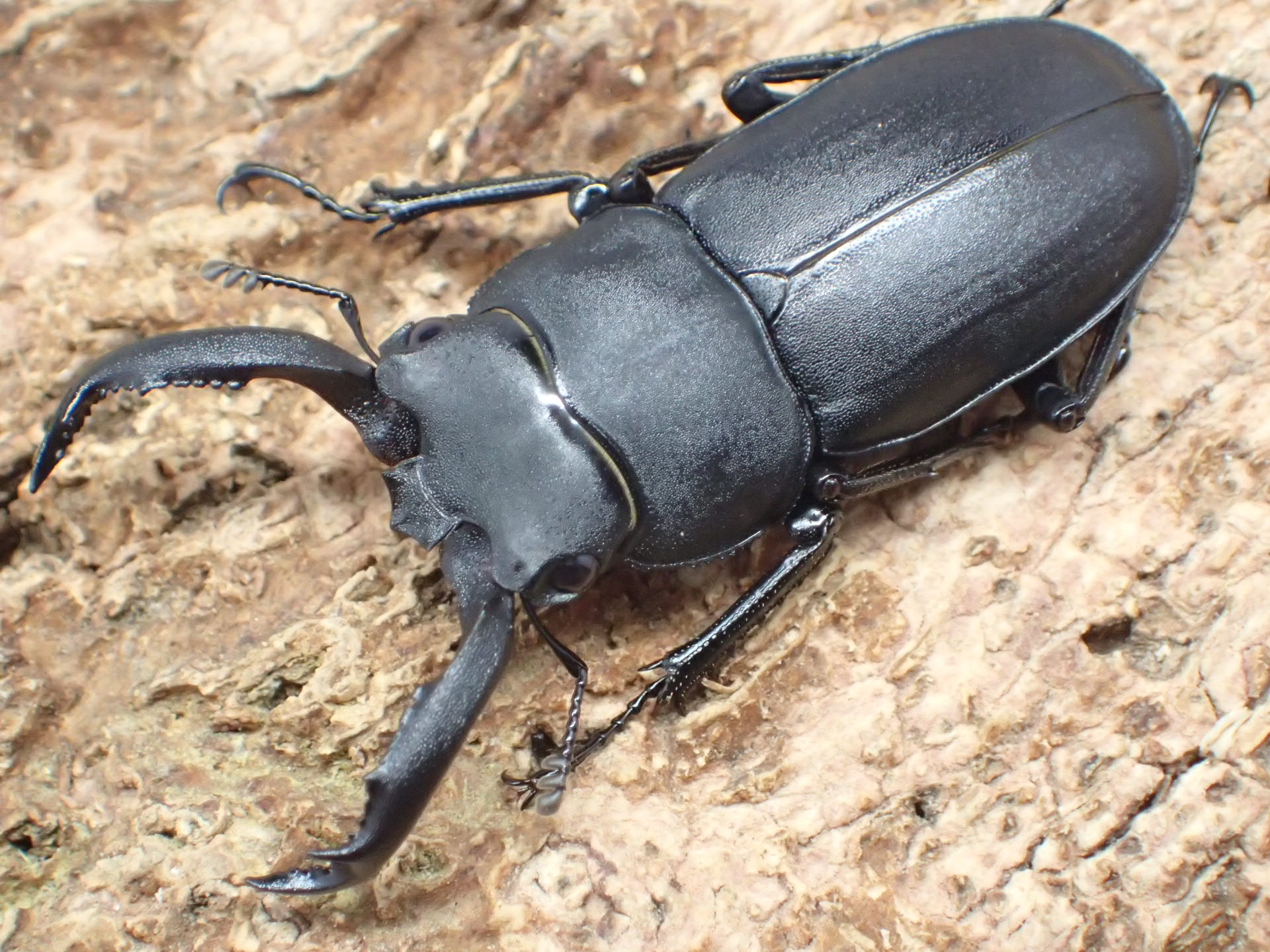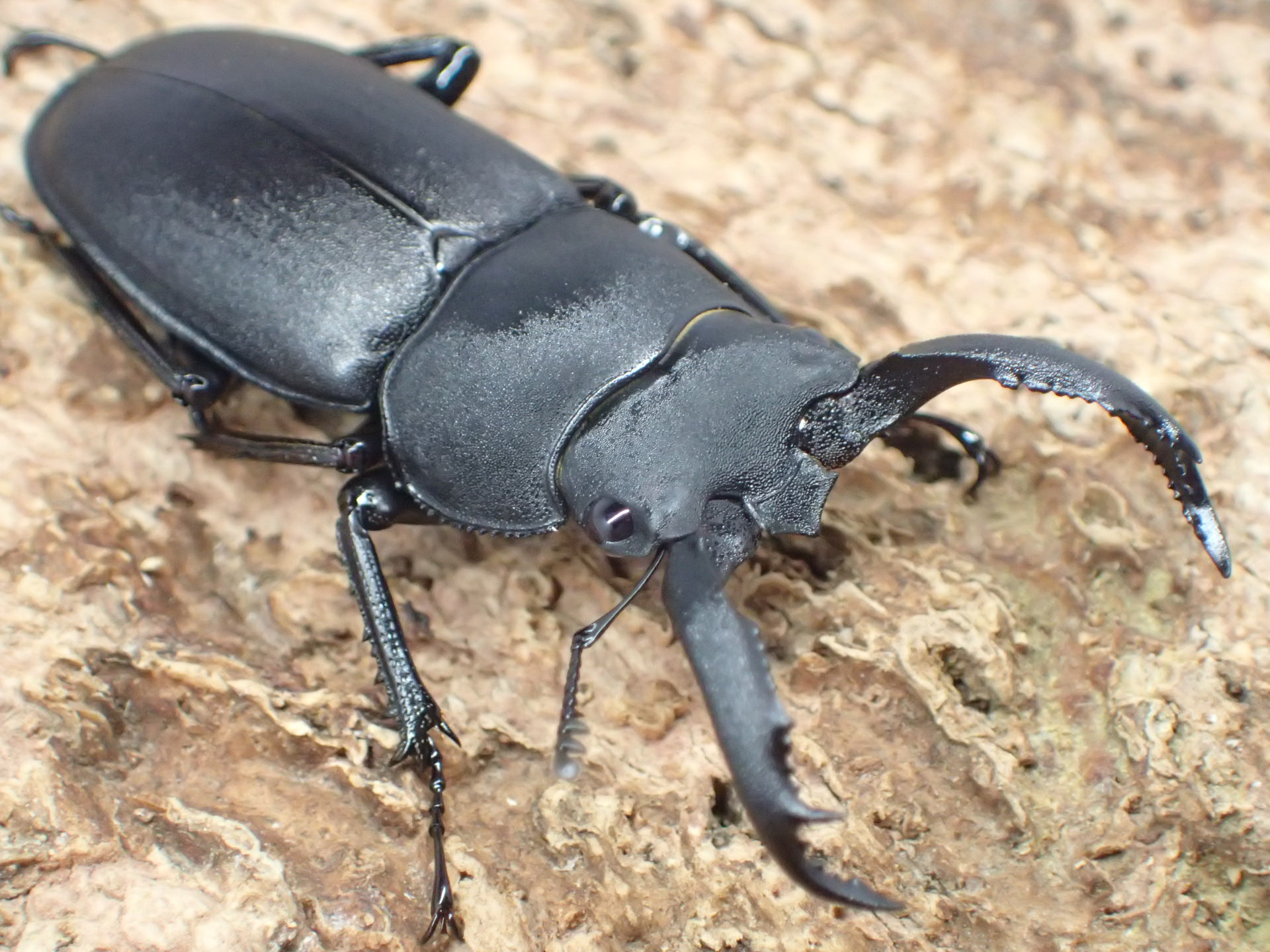 体はツヤ消し状の黒色で、大アゴは基部で斜め前方を向いて上反して、角張って曲がって下方に湾曲しながら前方へ伸びて先端は大きく上下に二又に分かれます。