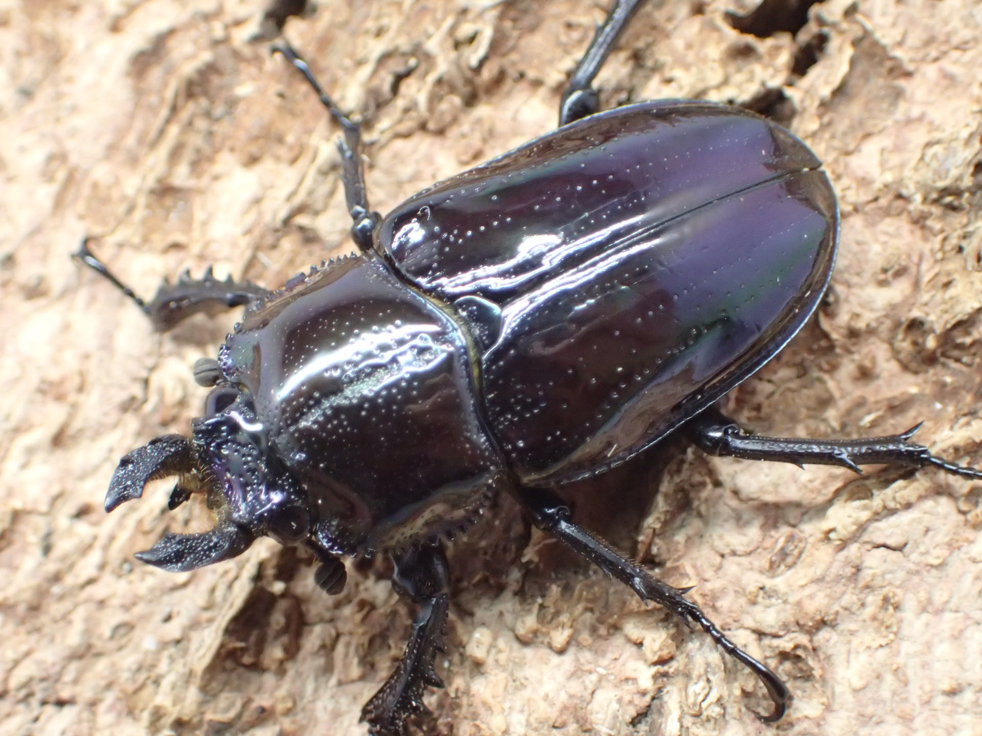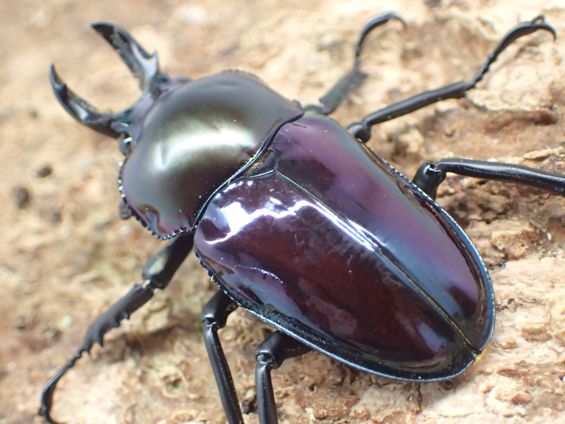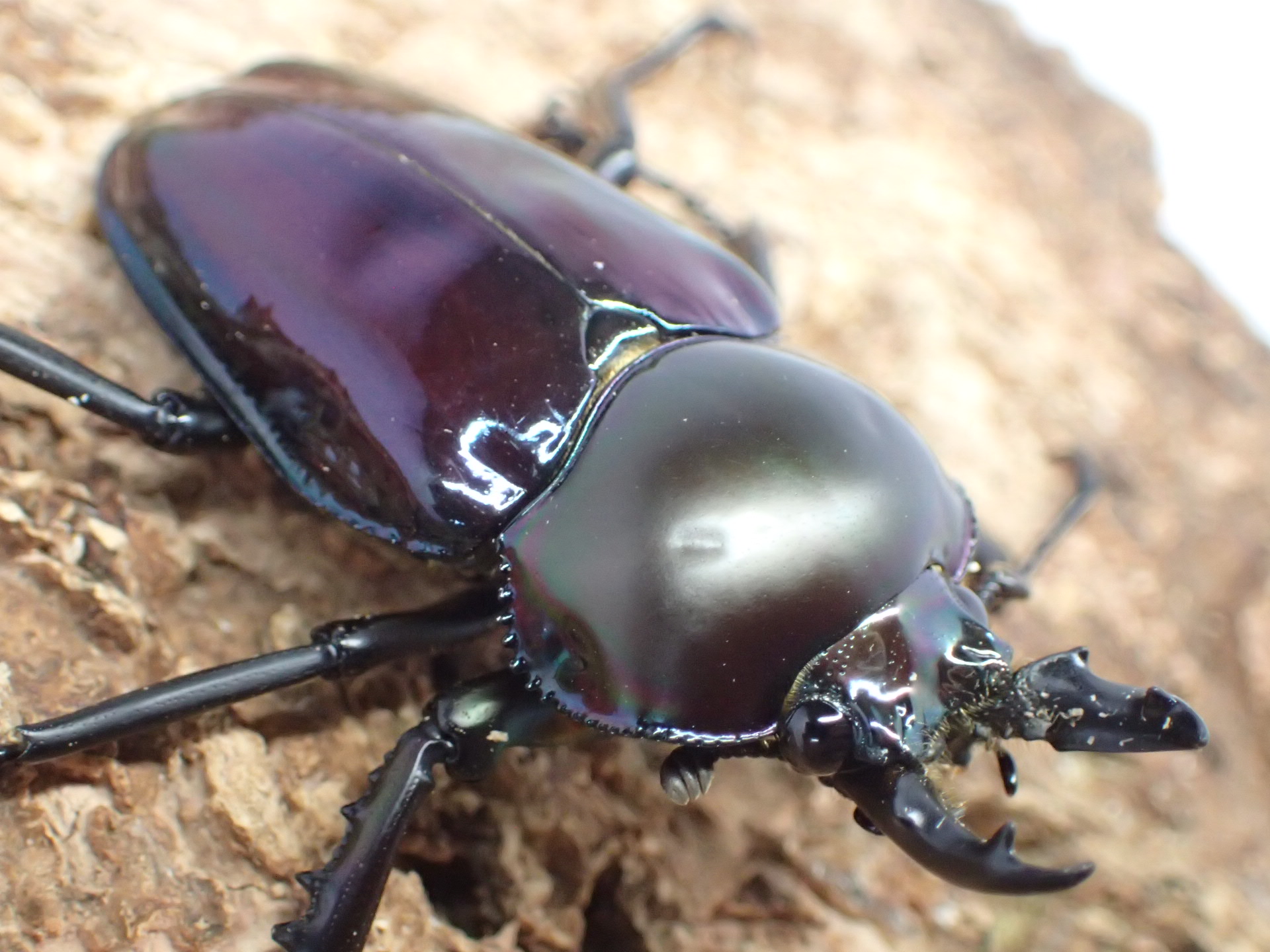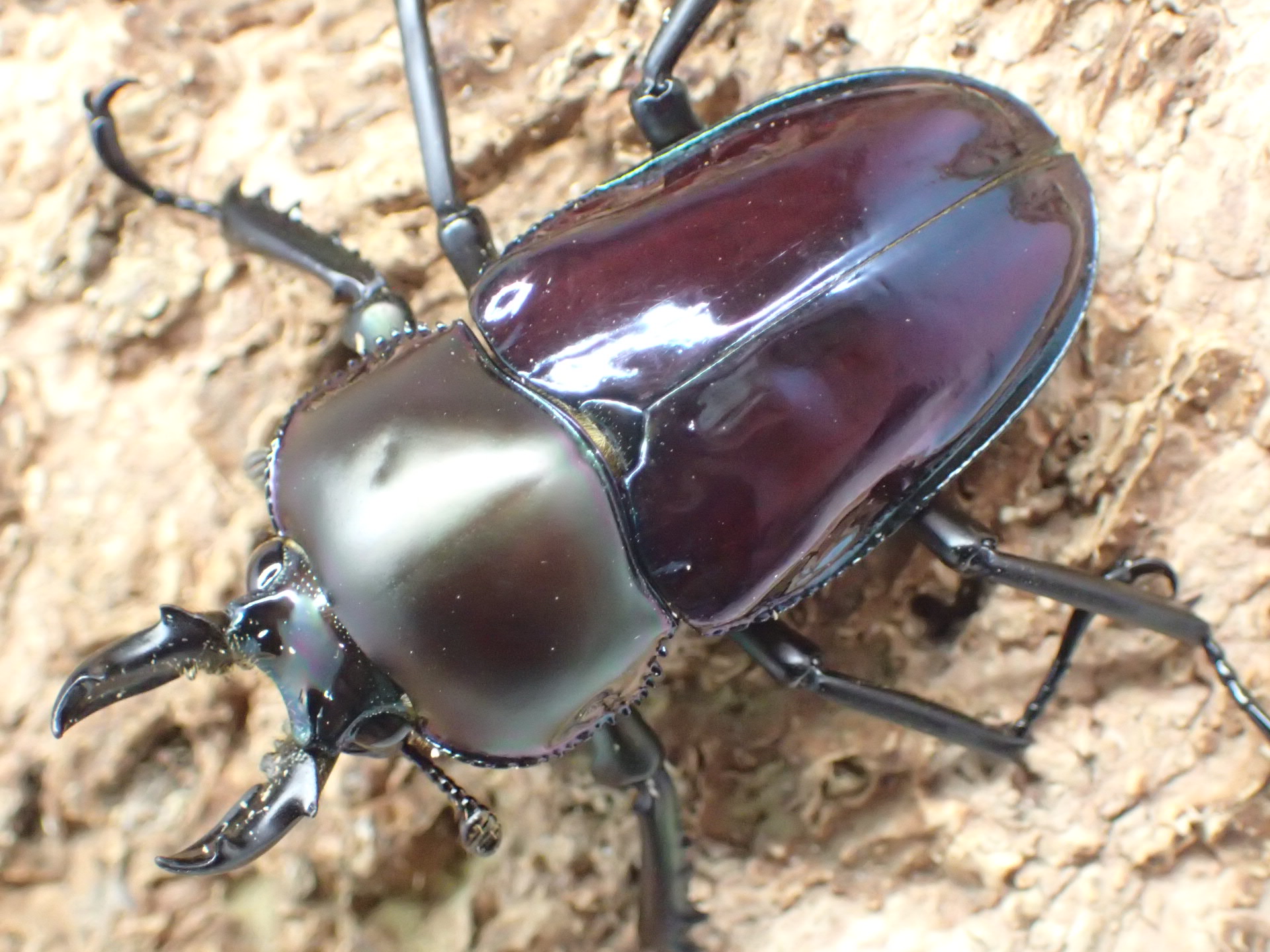 前胸背板は通常ツヤ消しですが、光沢を伴う個体も出現するなど、変異の多いクワガタです。