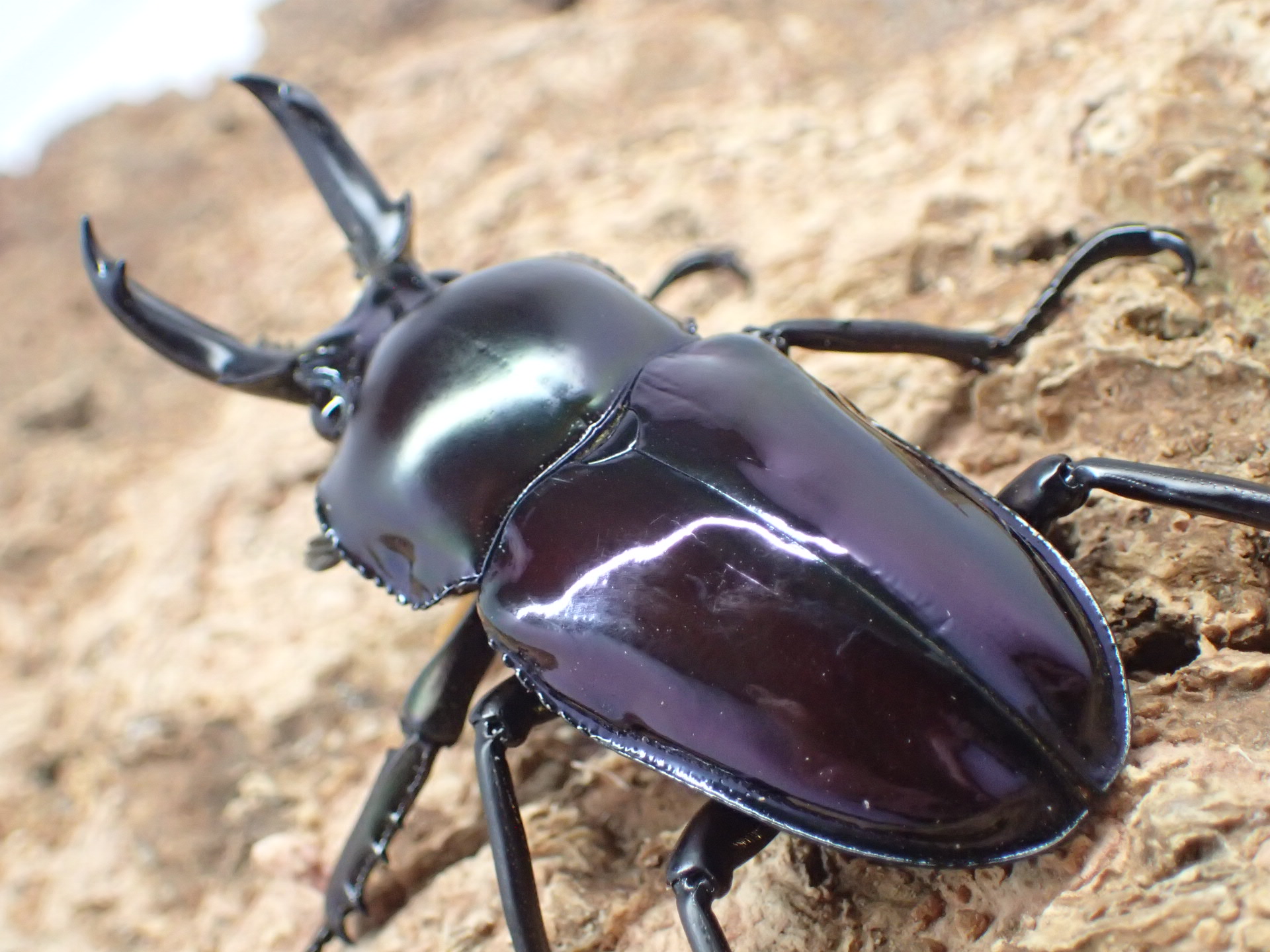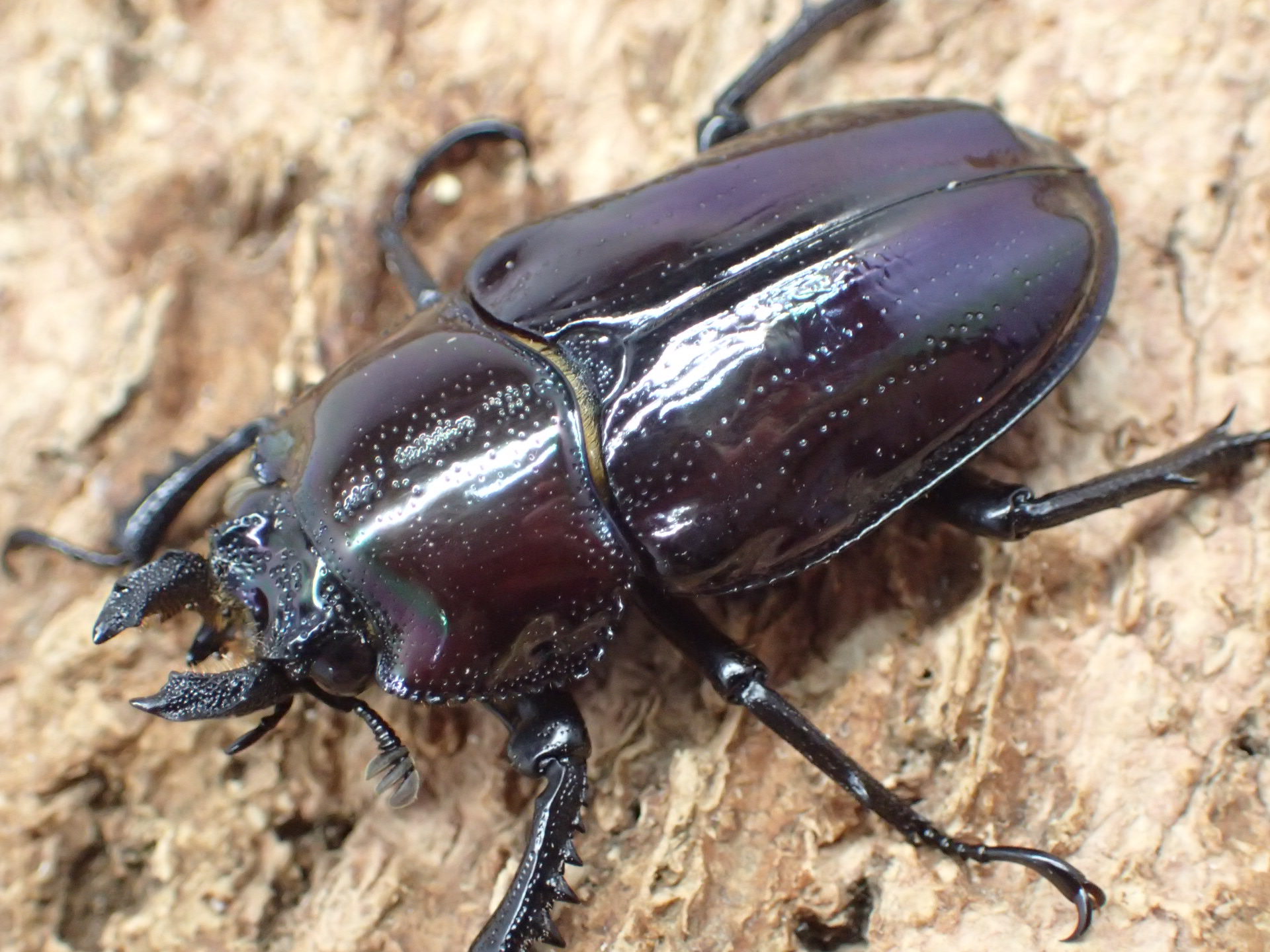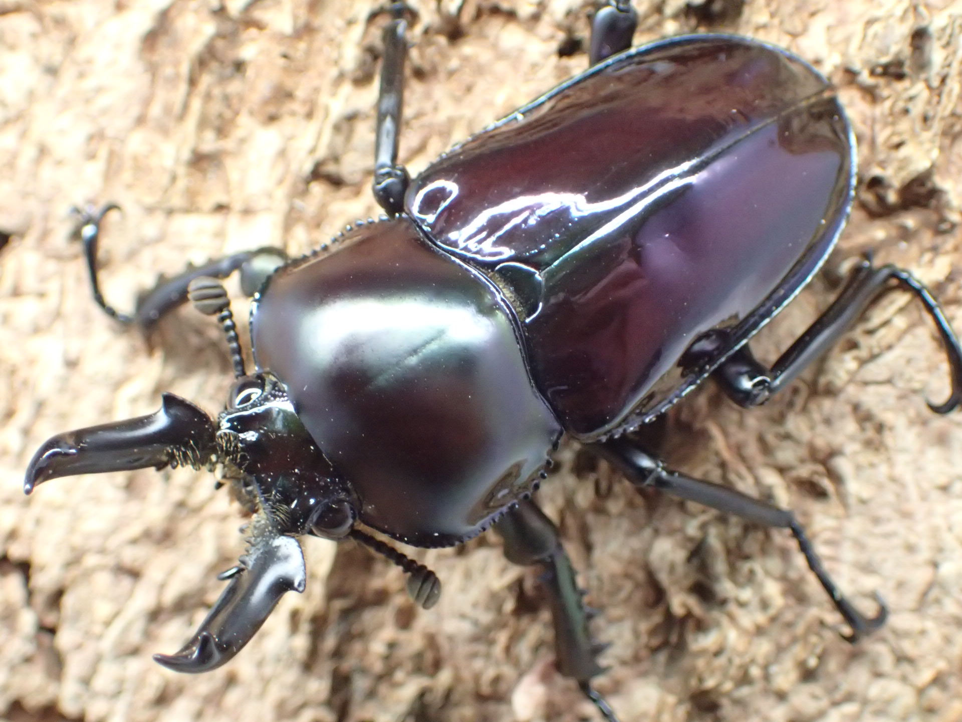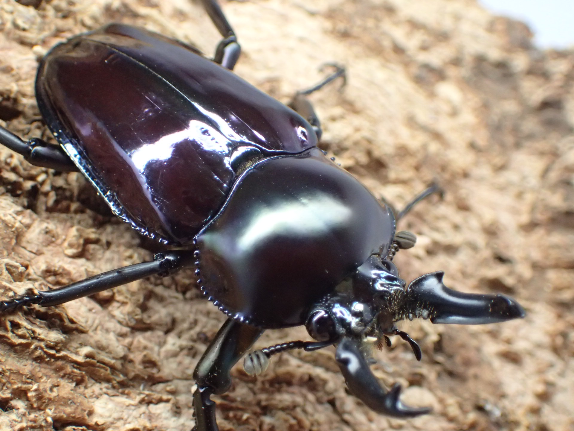 前胸背板は通常ツヤ消しですが、光沢を伴う個体も出現するなど、変異の多いクワガタです。