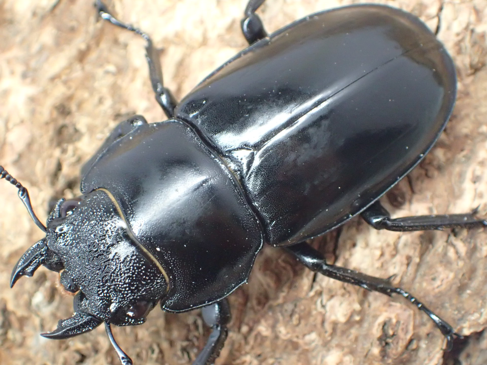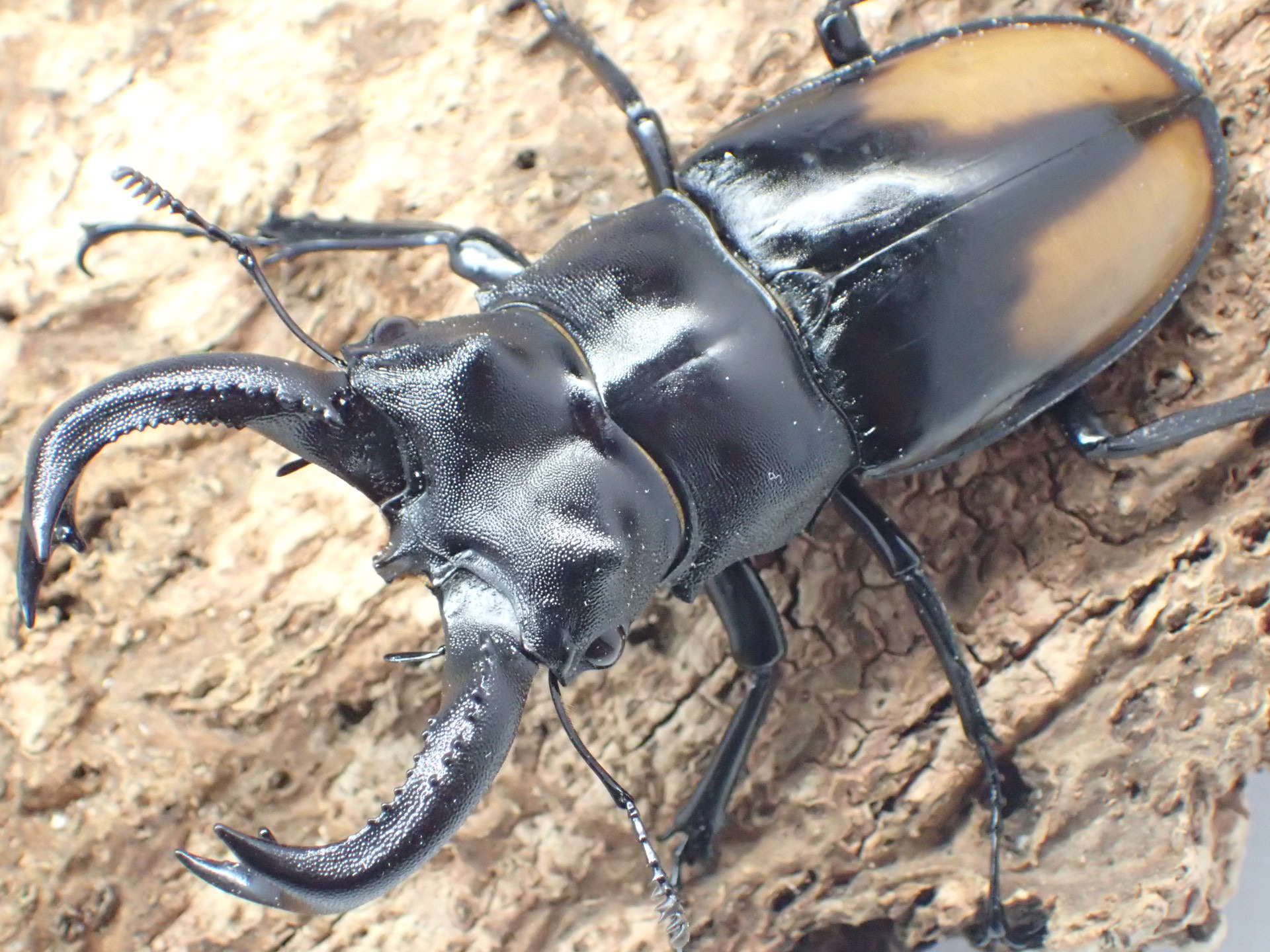 頭部中央が一対の大きなコブ状に隆起して、大アゴは太く、前方で強く湾曲して先端で大きく上下の二又に分かれます。