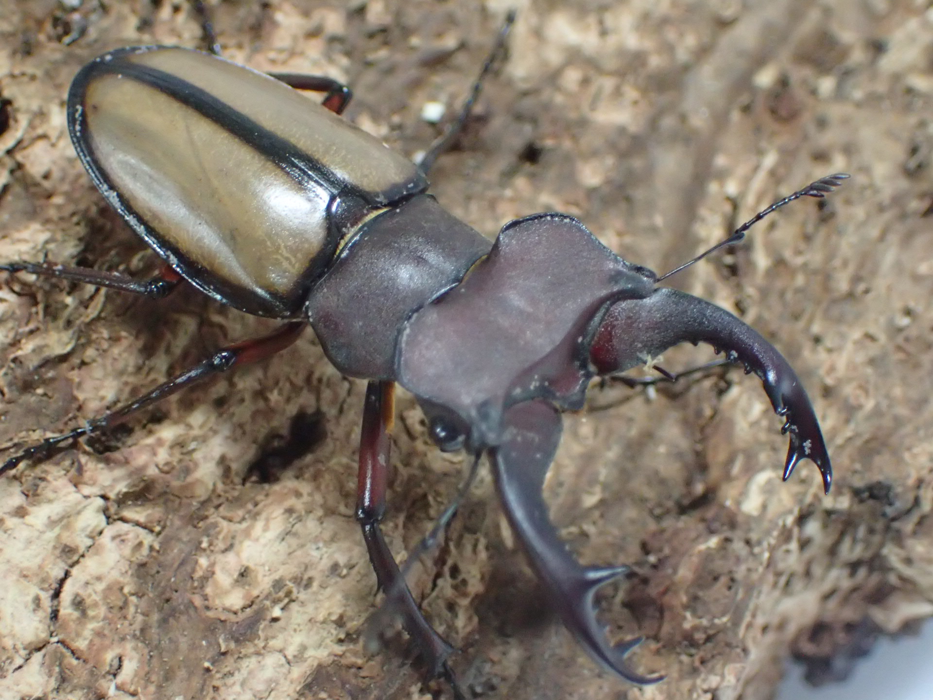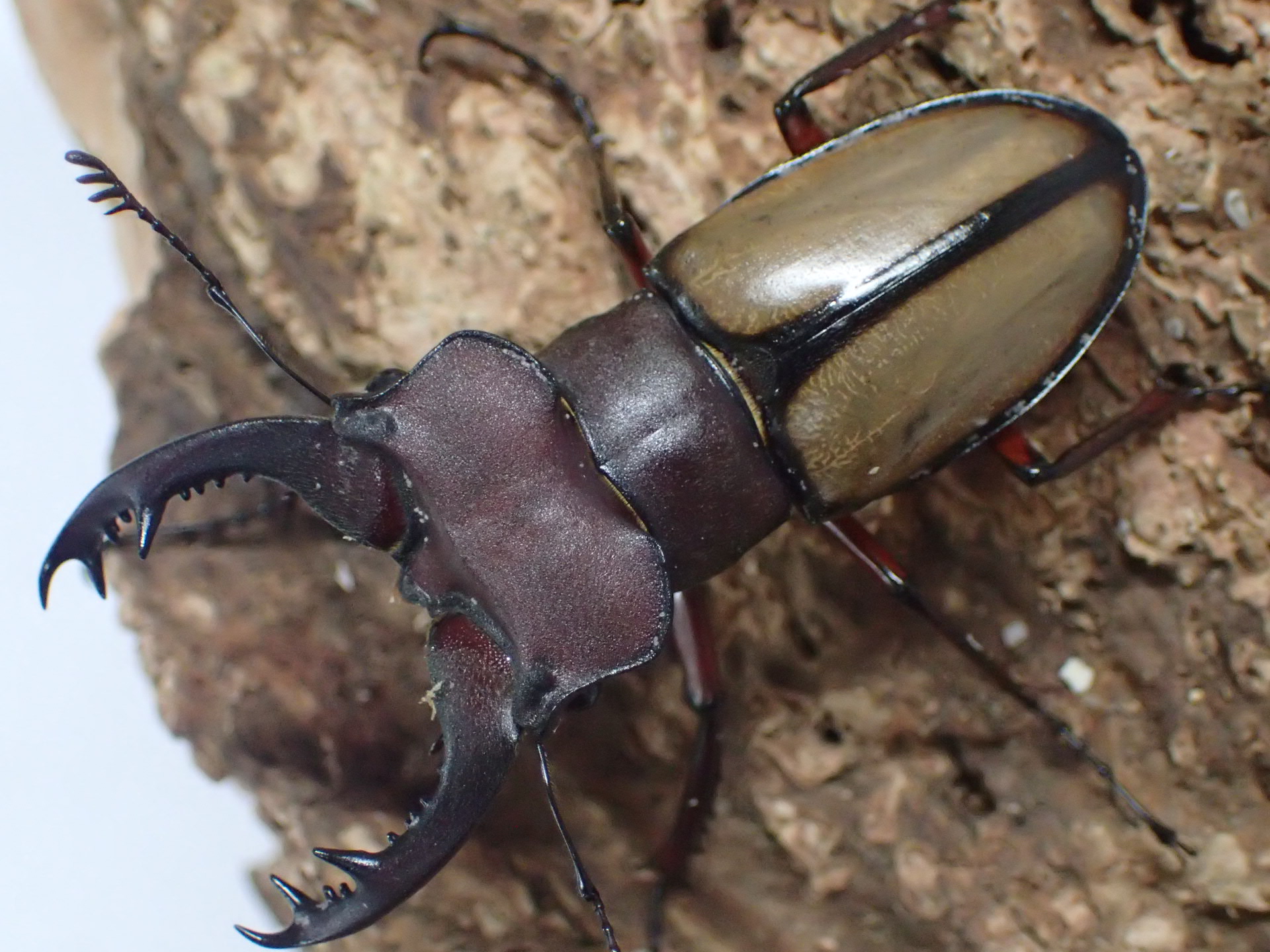 褐色の大アゴ・頭部・胸部に明るい黄褐色の上翅が映える美麗ミヤマクワガタです。