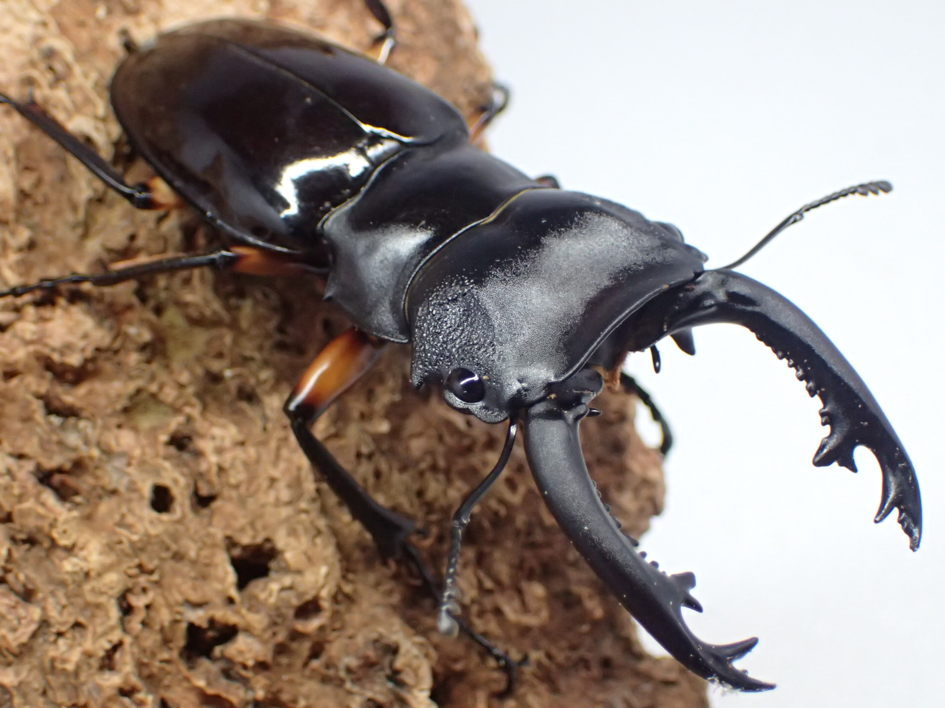 前胸背板と上翅に強い光沢をもち、全身の黒色に黄褐色~褐色の腿節が映えるツヤクワガタです。