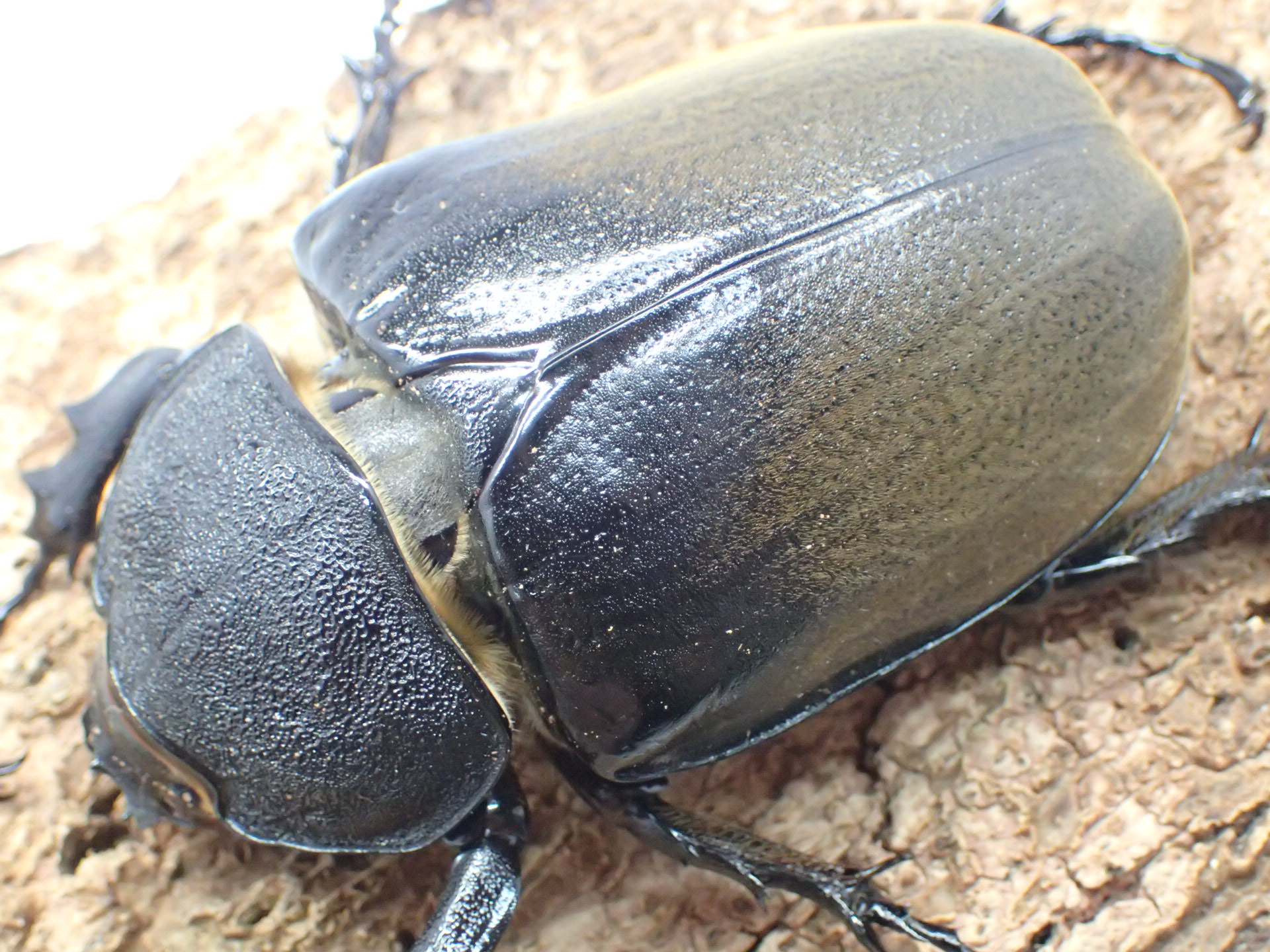 ギアスゾウカブトなどに見られる前胸中央の胸角はなく、痕跡のようにコブ状に盛り上がります。