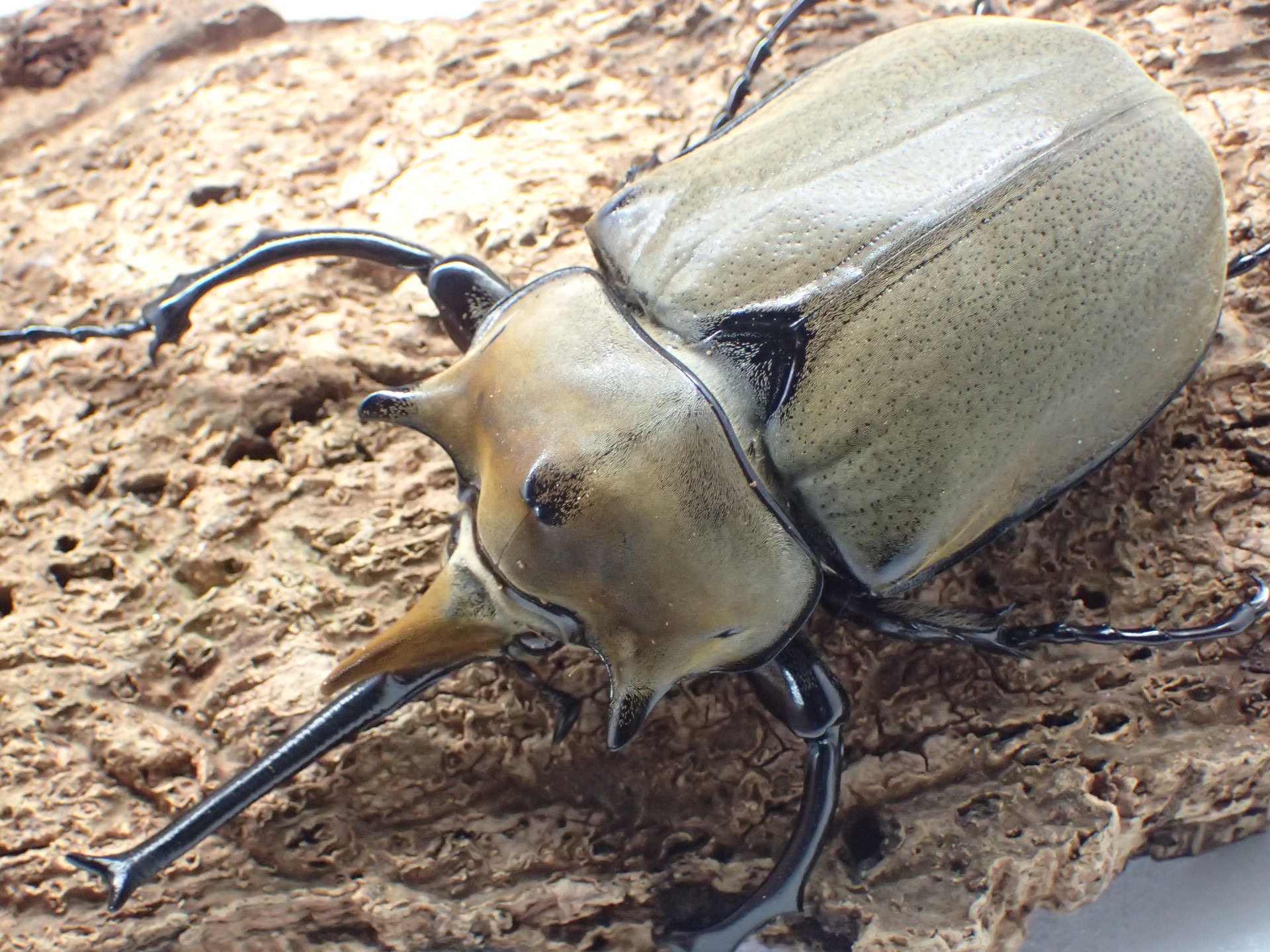 種名の「elephas」は「象」を意味し、大きな体と象の鼻のように長い頭角、全身の微毛などまさに「ゾウカブト」と呼ぶにふさわしいカブトムシです。