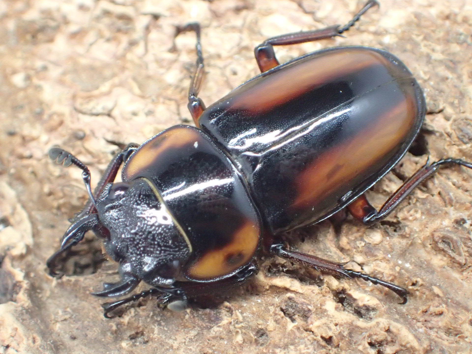 大アゴ・頭部は褐色~黒褐色で、前胸背板は中央部が黒色で側縁部が黄褐色、上翅は黄褐色で周縁部が黒く縁どられて会合部にも帯状の黒色部があります。