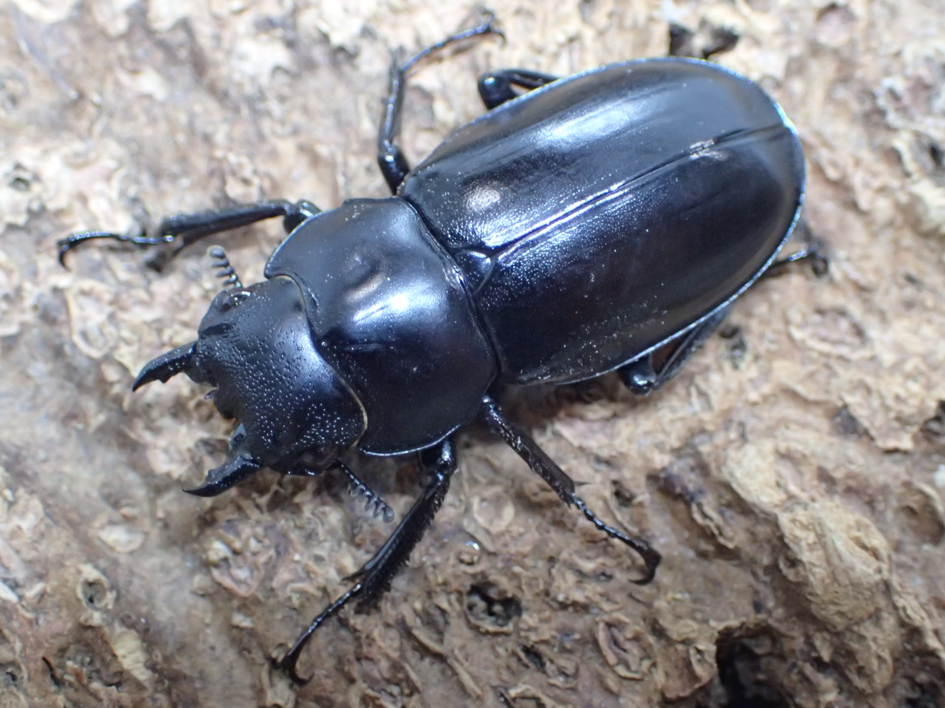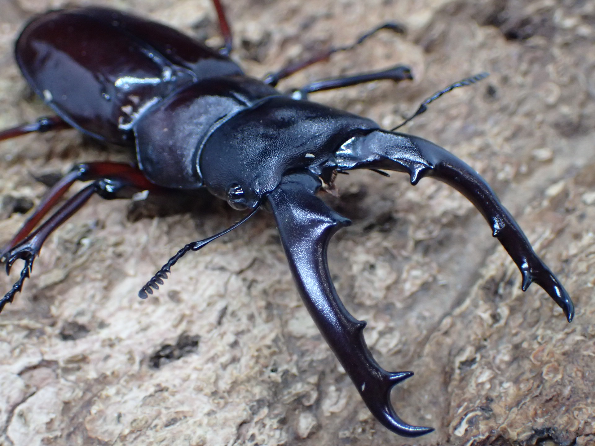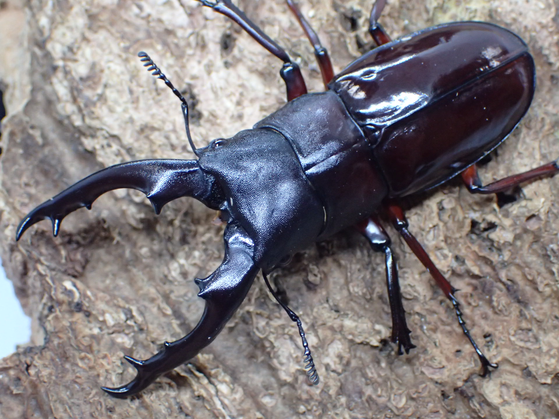 大アゴ・頭部・前胸背板はややツヤ消し状の黒褐色で、上翅と脚は褐色~黒褐色で、上翅には光沢があります。