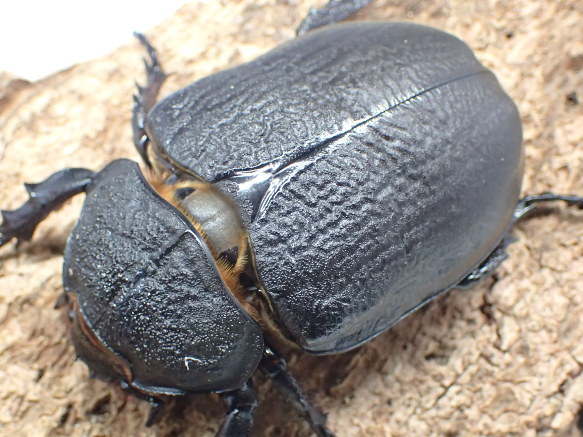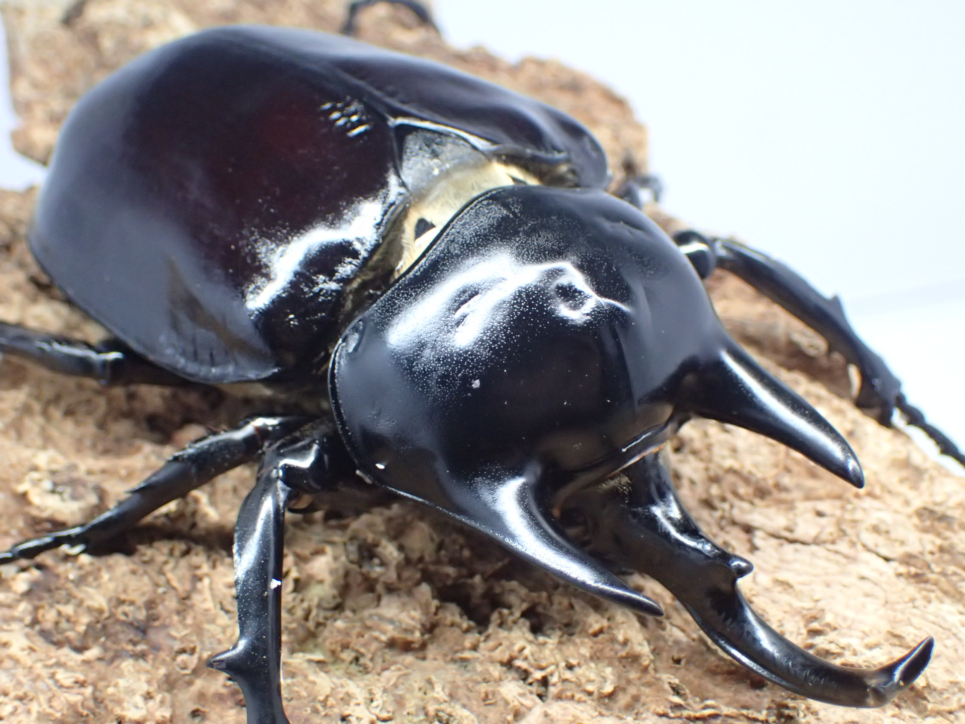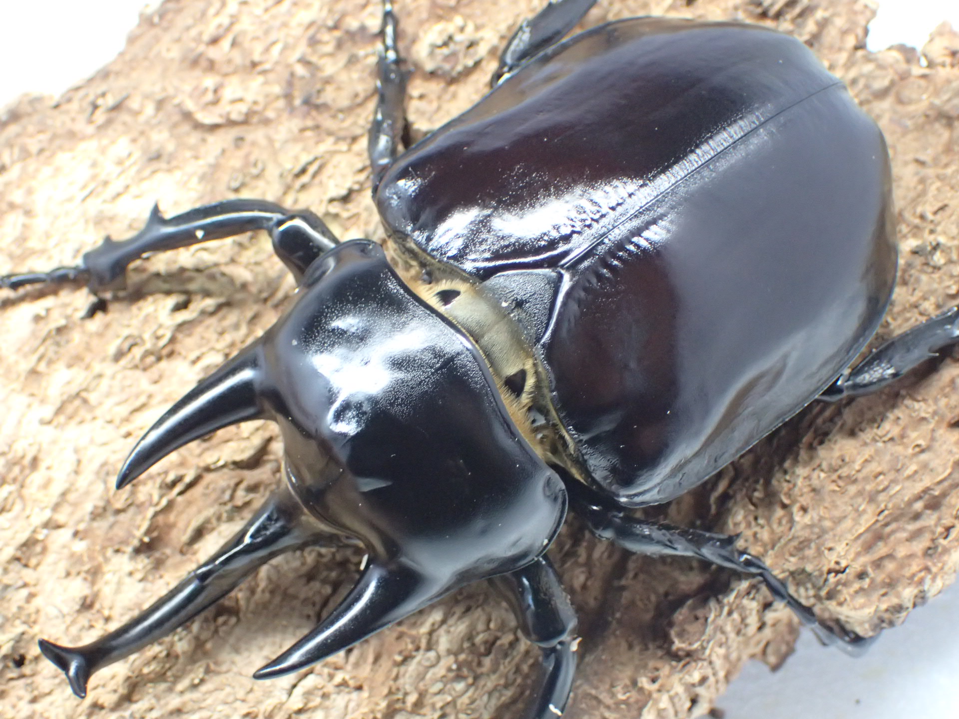 太短い頭角と、発達した胸部前縁胸角、重量感あふれる巨体で、最も力強さを感じさせるゾウカブトです。 マルスゾウカブトに次ぐ体長で、「有毛のエレファス」・「無毛のアクティオン」と、ゾウカブトを二分する人気のカブトムシです。