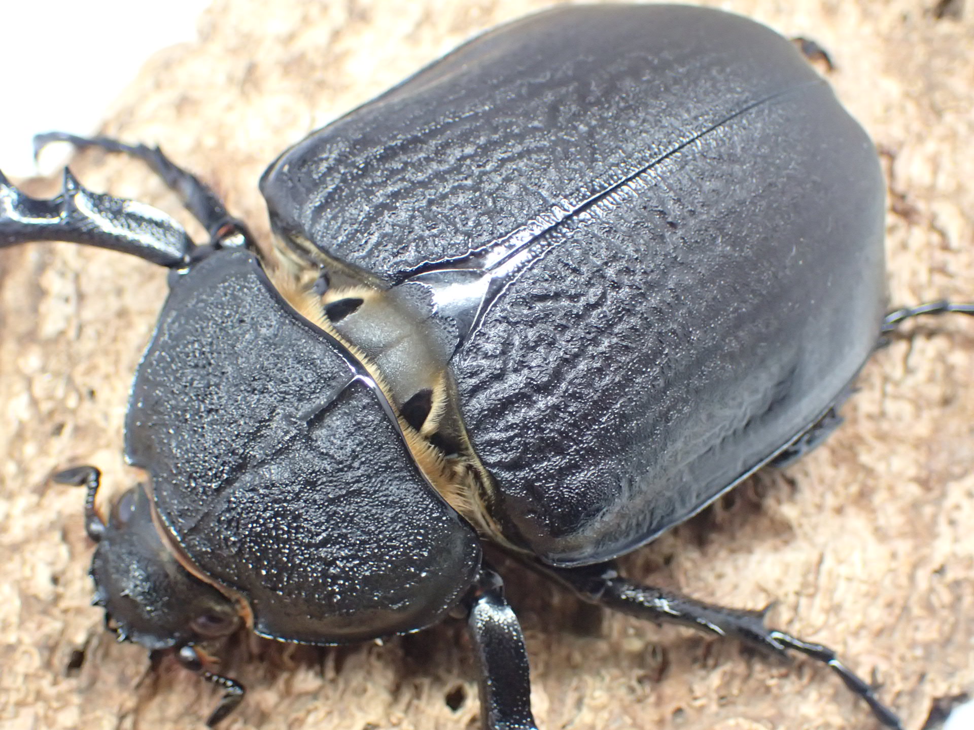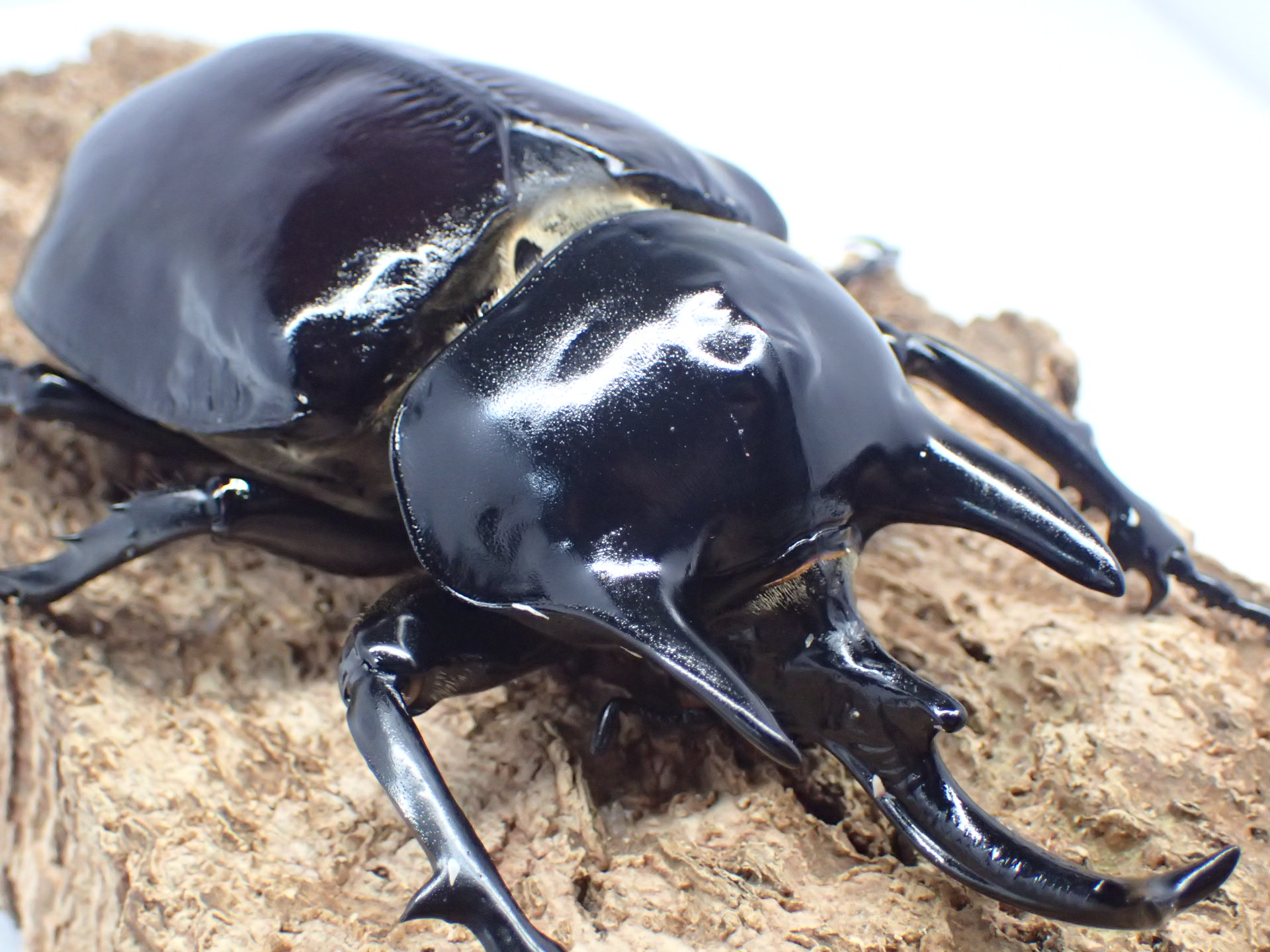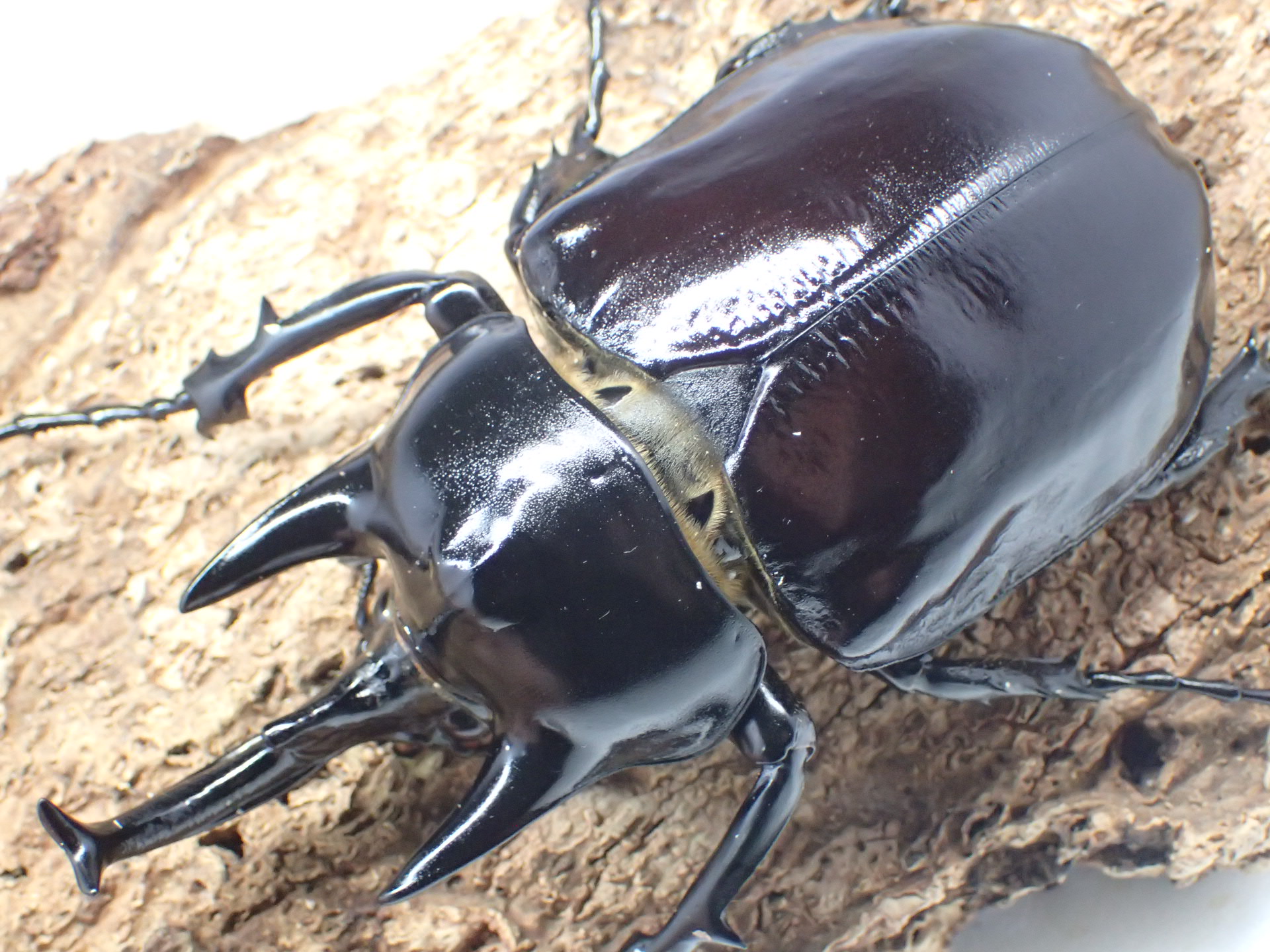 太短い頭角と、発達した胸部前縁胸角、重量感あふれる巨体で、最も力強さを感じさせるゾウカブトです。 マルスゾウカブトに次ぐ体長で、「有毛のエレファス」・「無毛のアクティオン」と、ゾウカブトを二分する人気のカブトムシです。