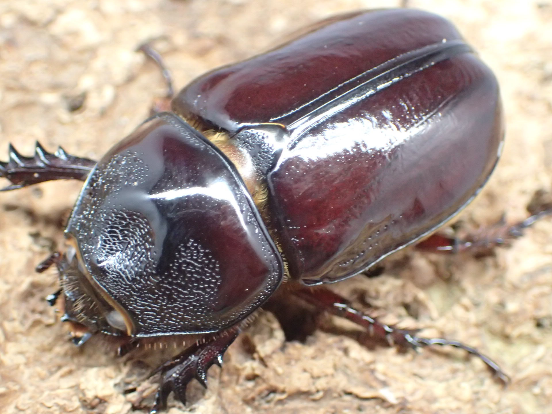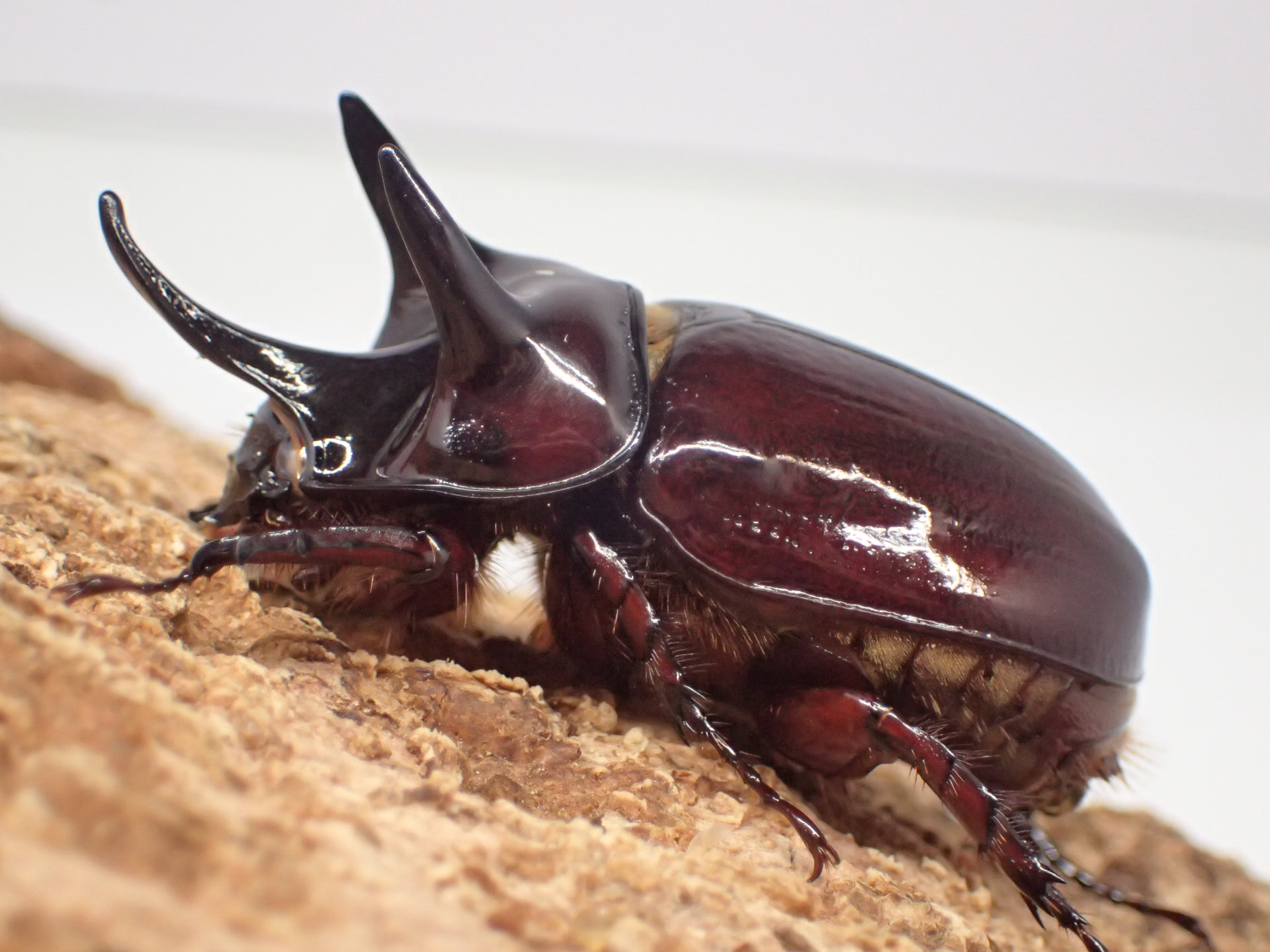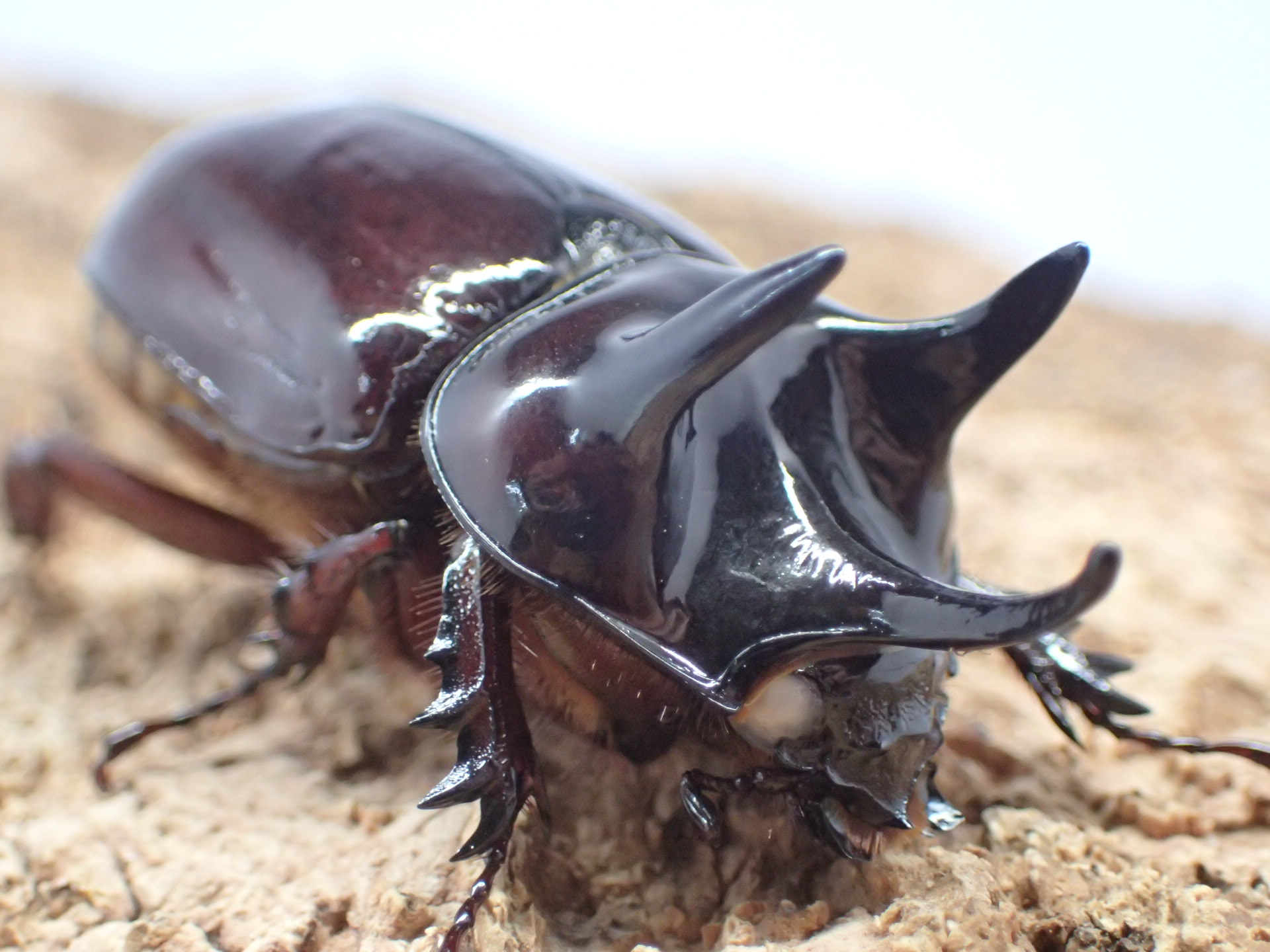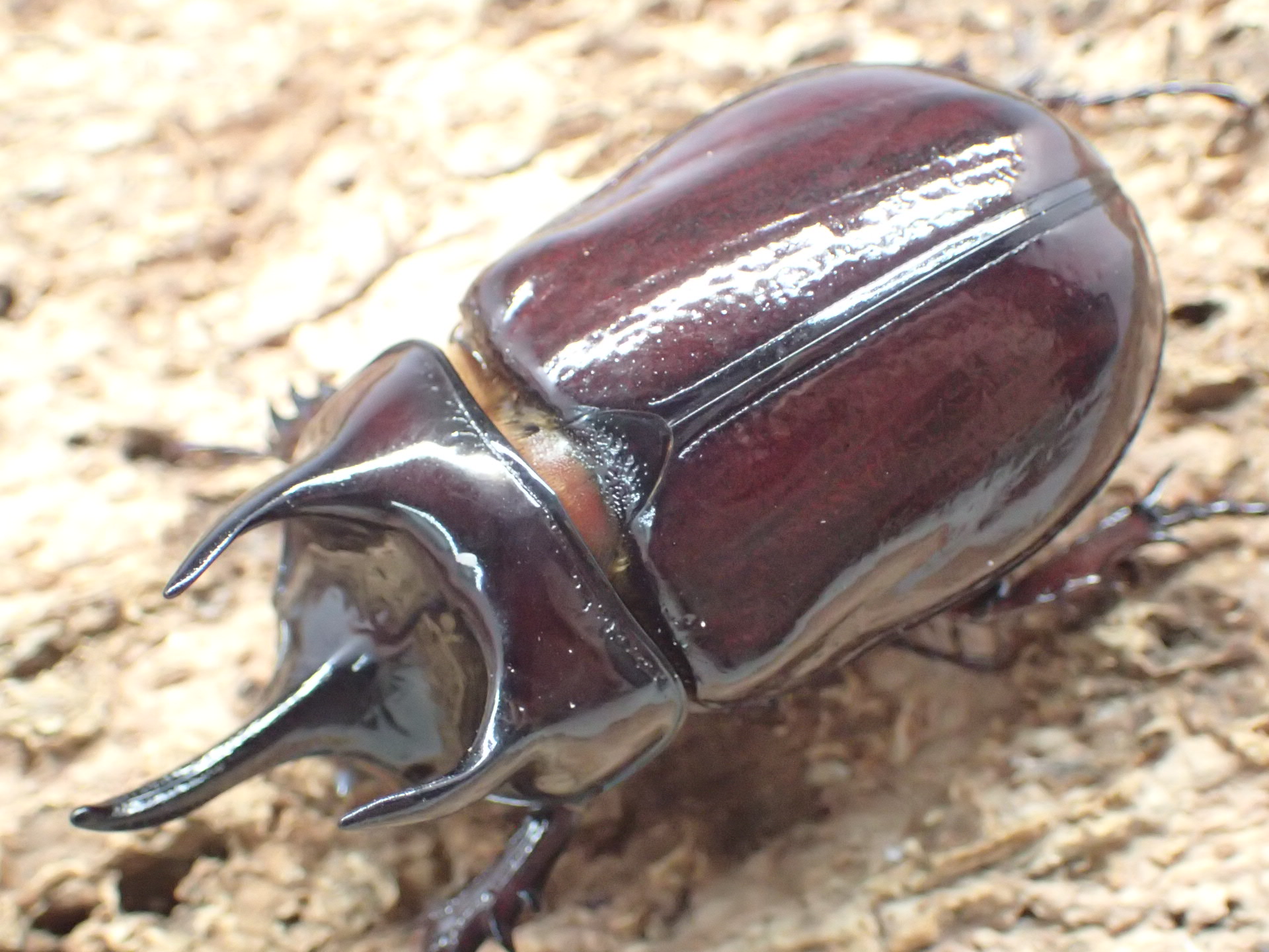 オスに頭角がなく、前胸の前方中央に一見、頭角のように見える胸角が1本、左右側方に1対の胸角があり、「ミツノ」状になる光沢の強いカブトムシです。