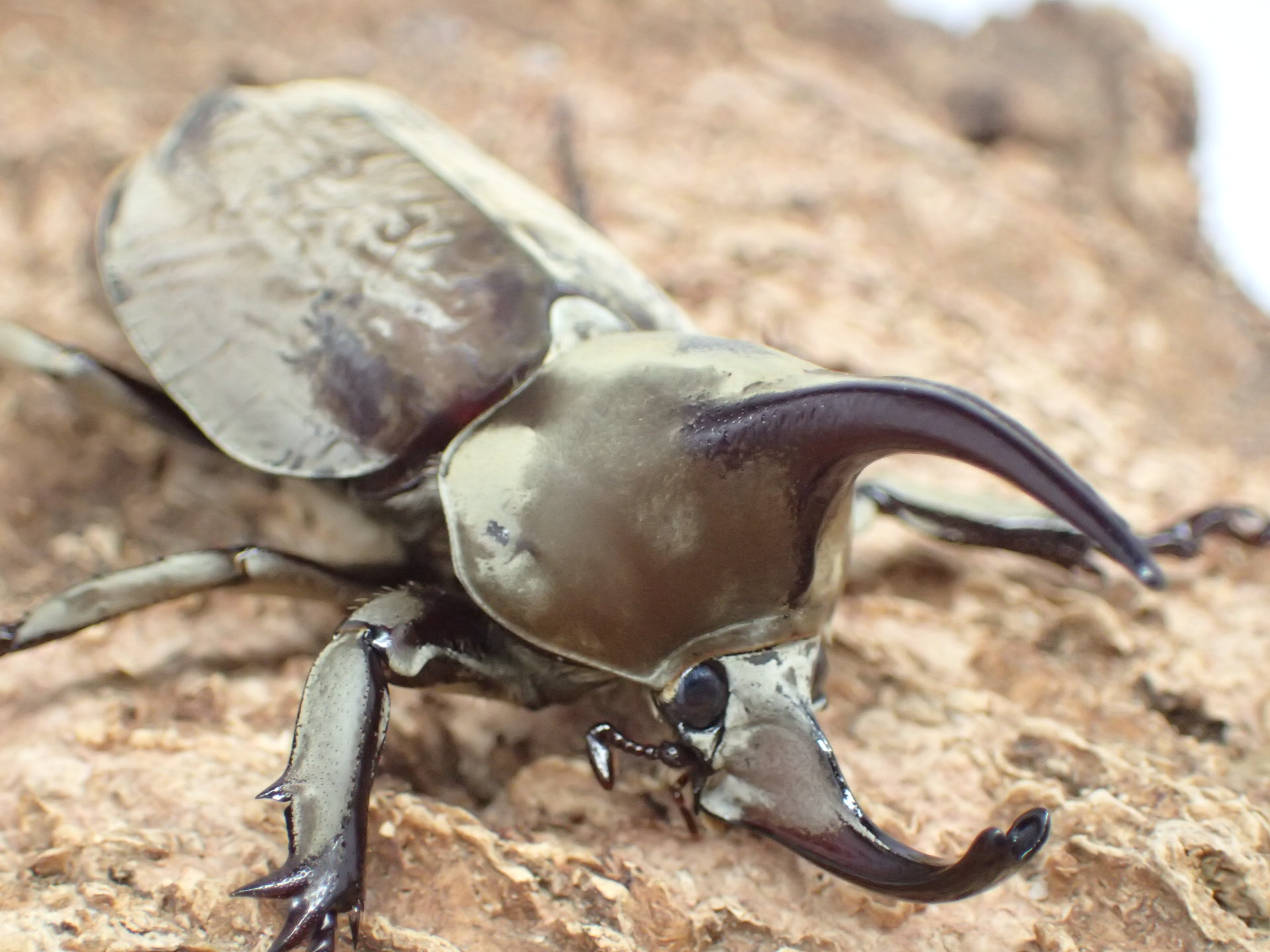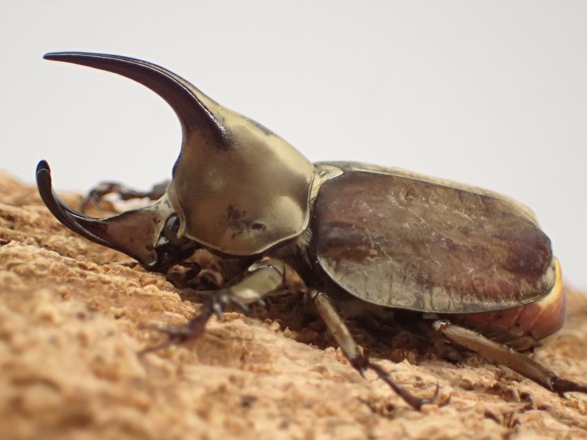 長い胸角と頭角がヘラクレスオオカブトを小型化したようなフォルムで、金色に輝くビロード状の美しい姿も相まって、非常に人気が高いヒナカブトです。