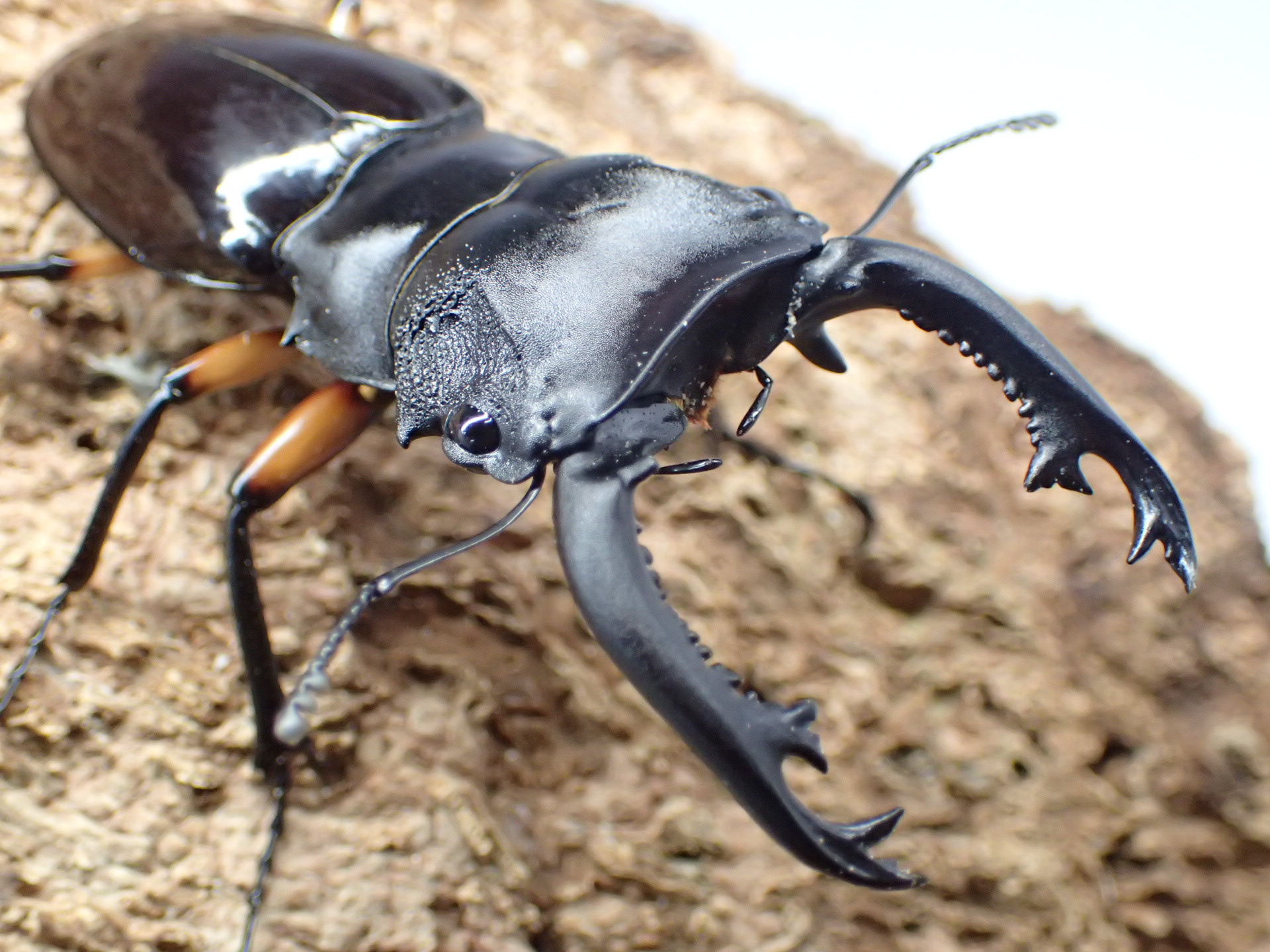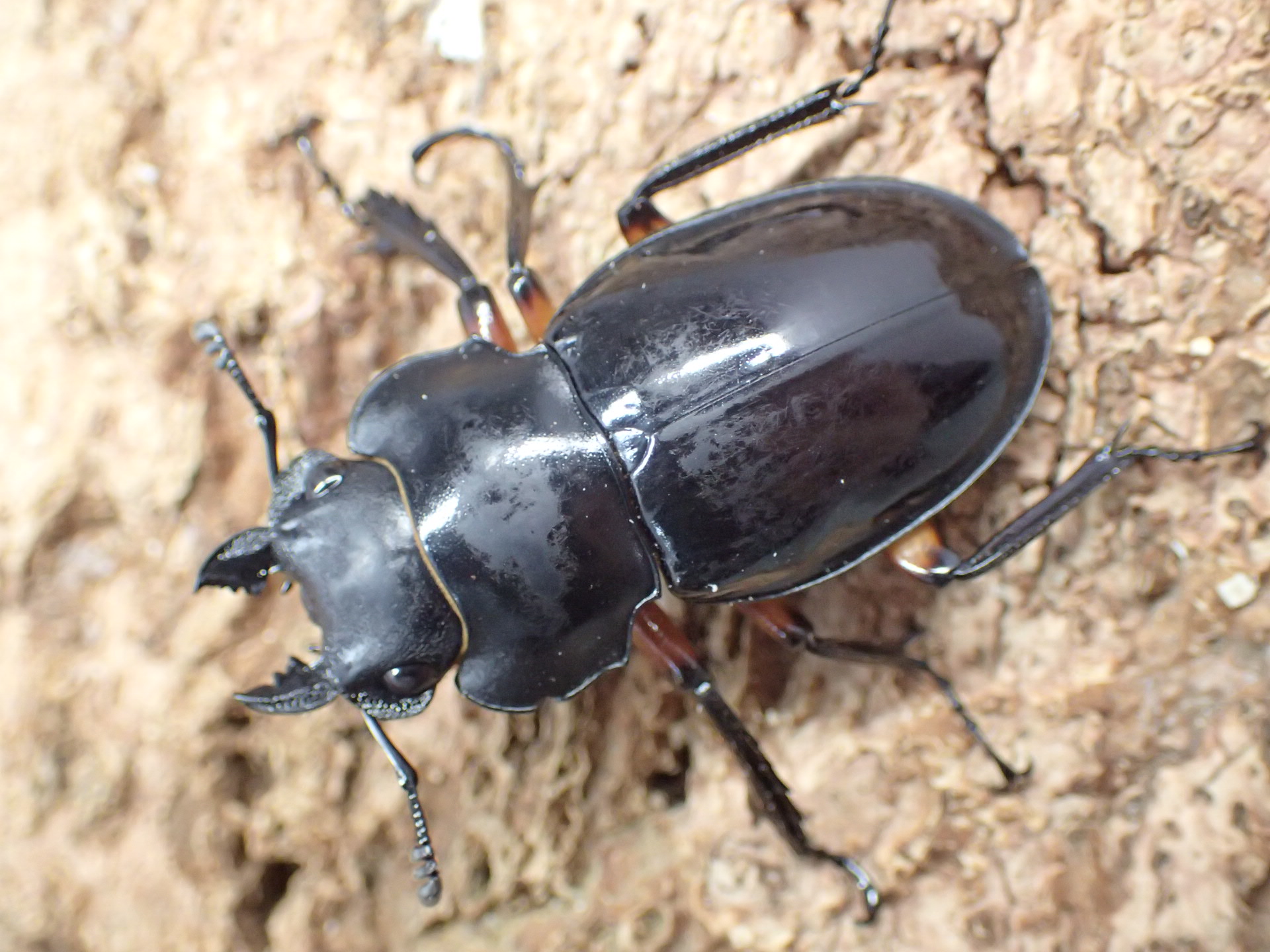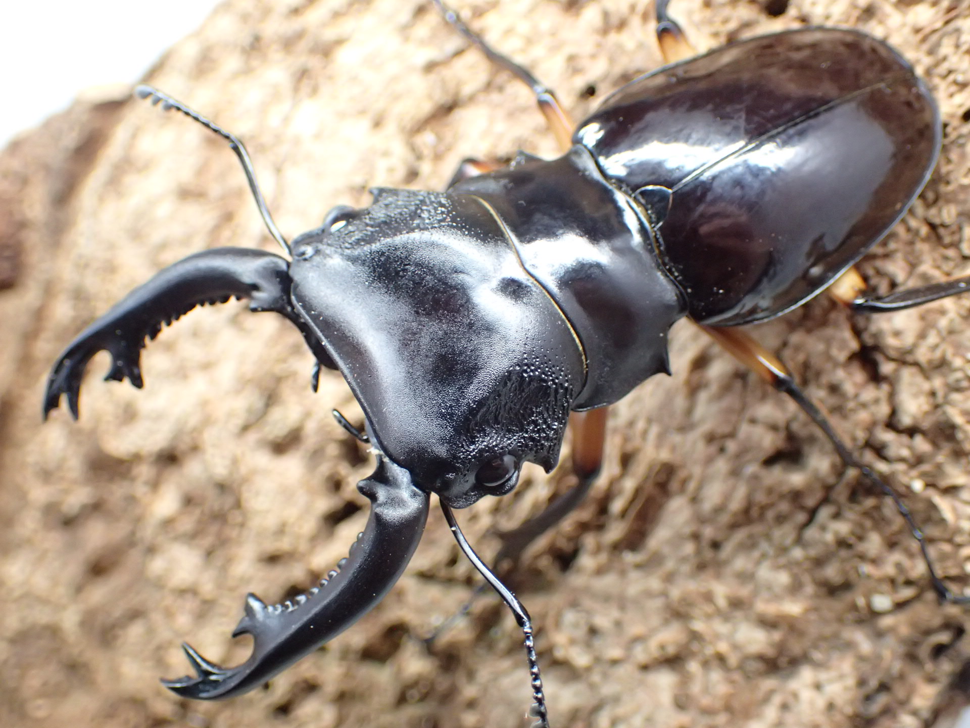 前胸背板と上翅に強い光沢をもち、全身の黒色に黄褐色~褐色の腿節が映えるツヤクワガタです。