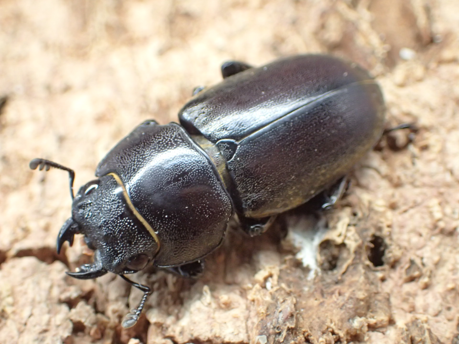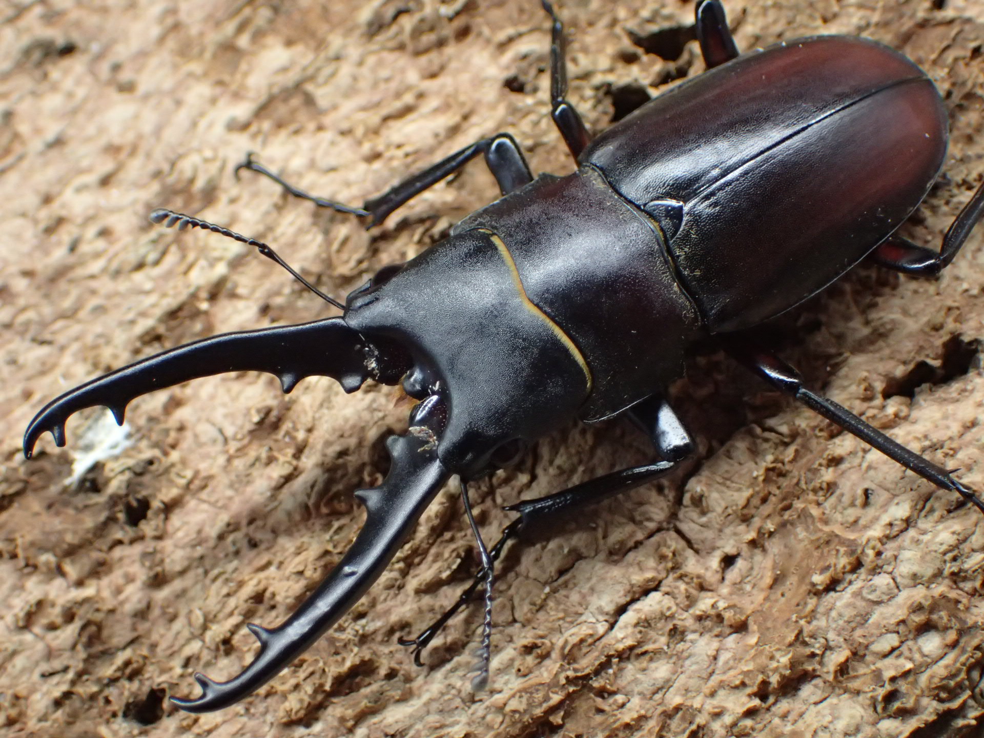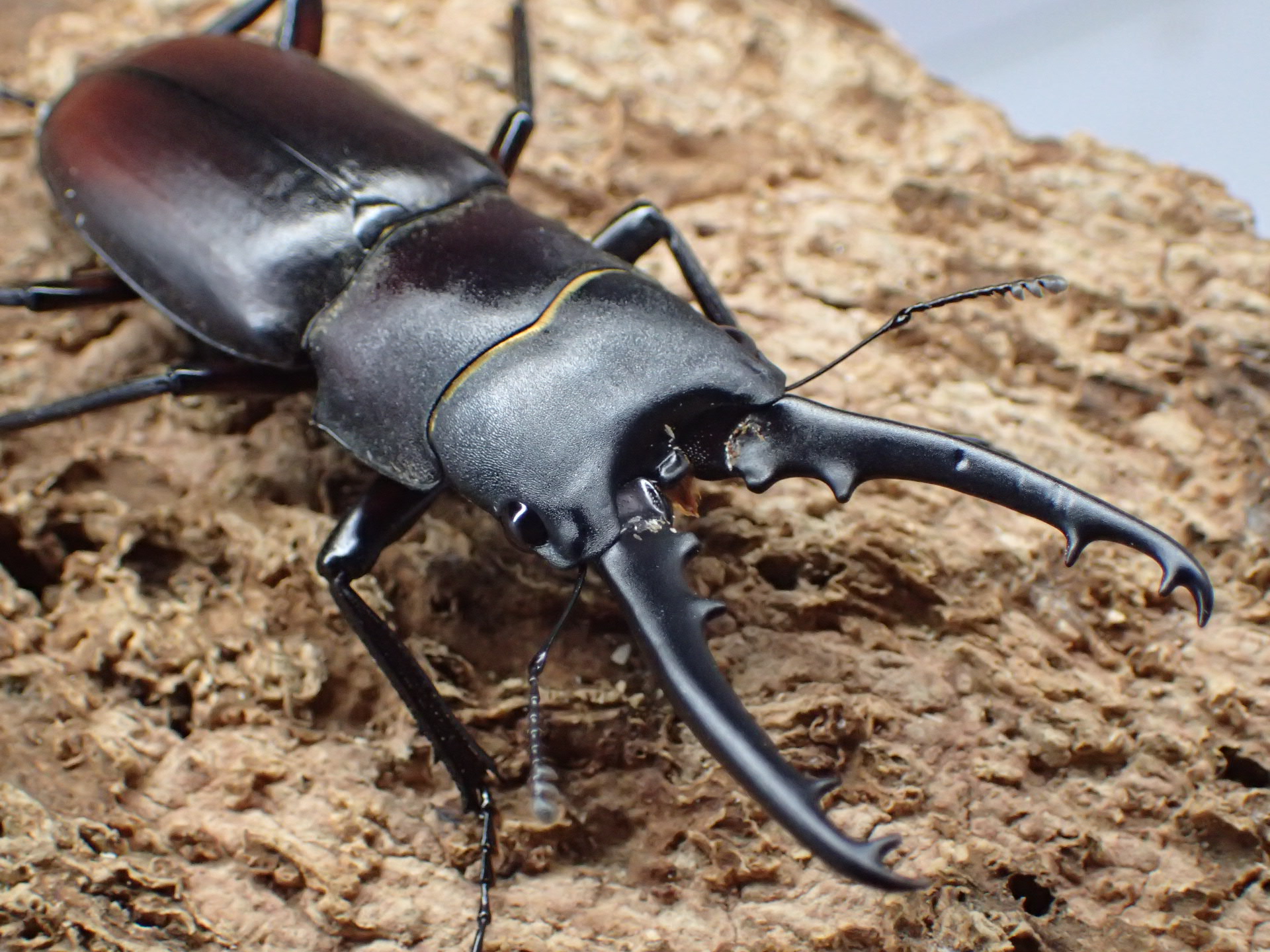オスの体は毛深く、大アゴは平たく長く、異様な印象を受ける大型のノコギリクワガタです。