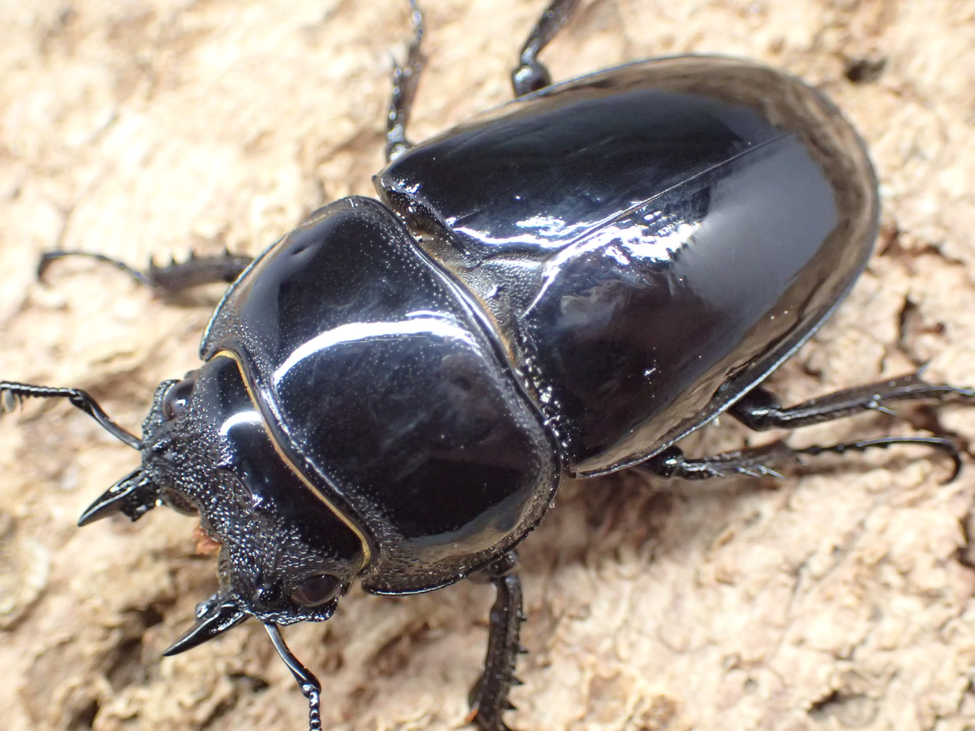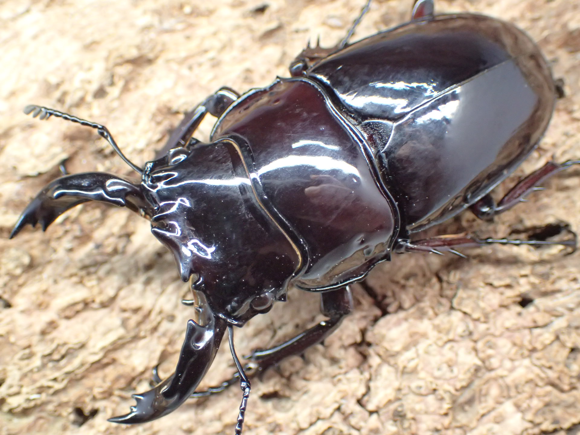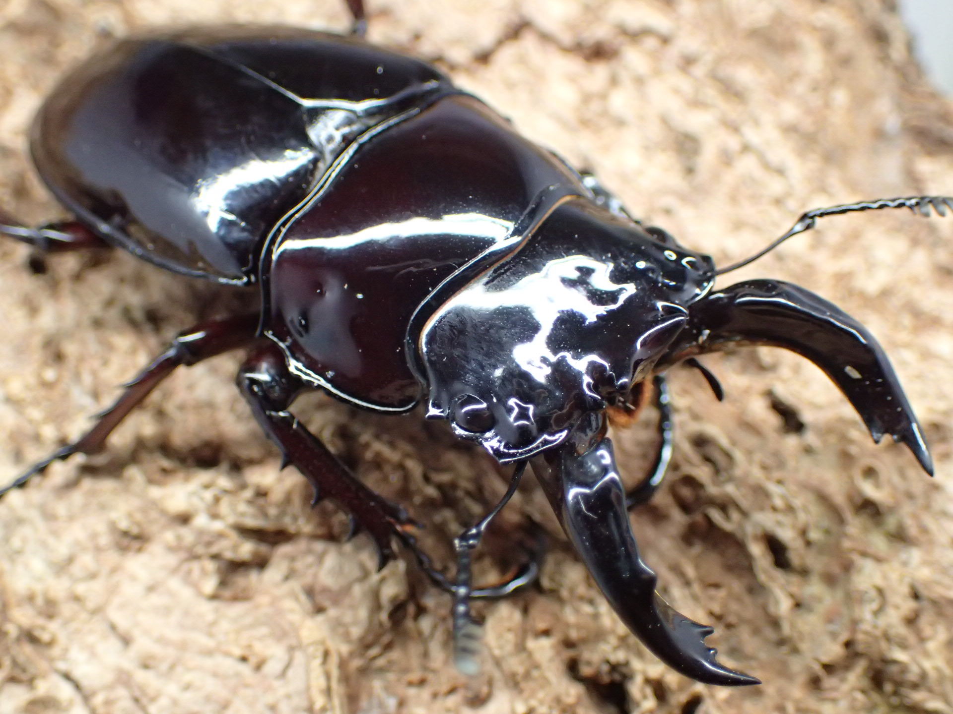 全身漆黒色でエナメルのような強い光沢をもち、タランドゥスオオツヤクワガタと並んでアフリカ最大級のクワガタです。