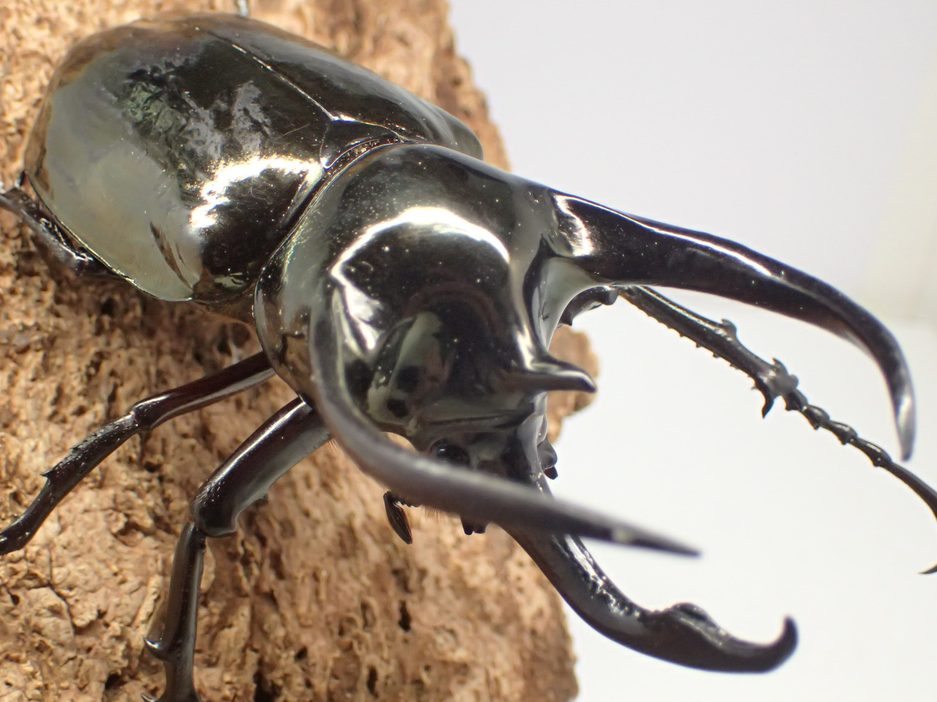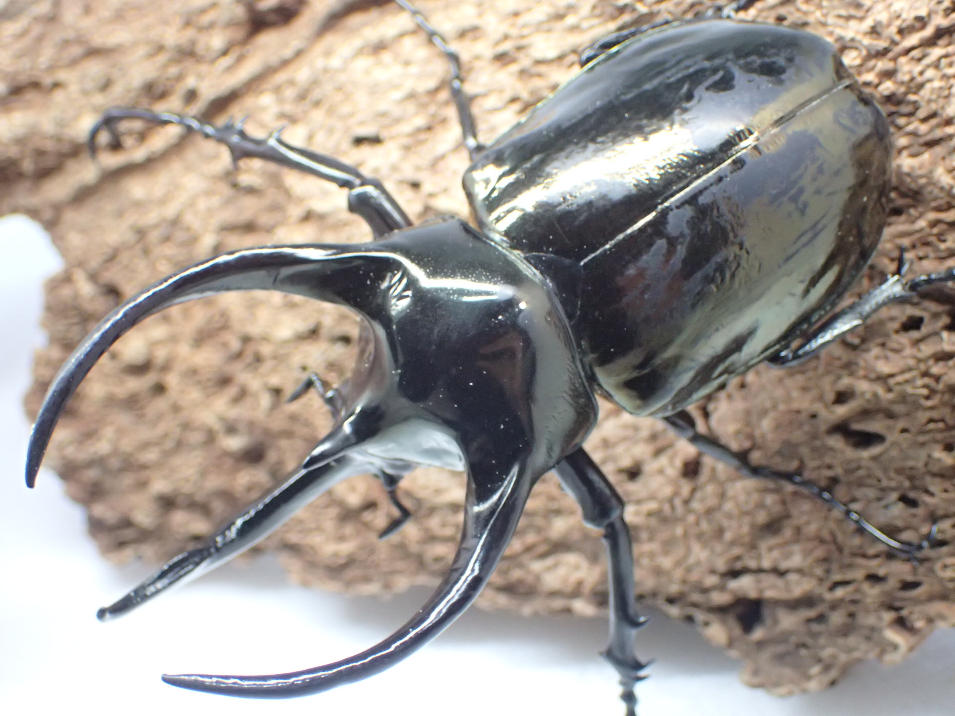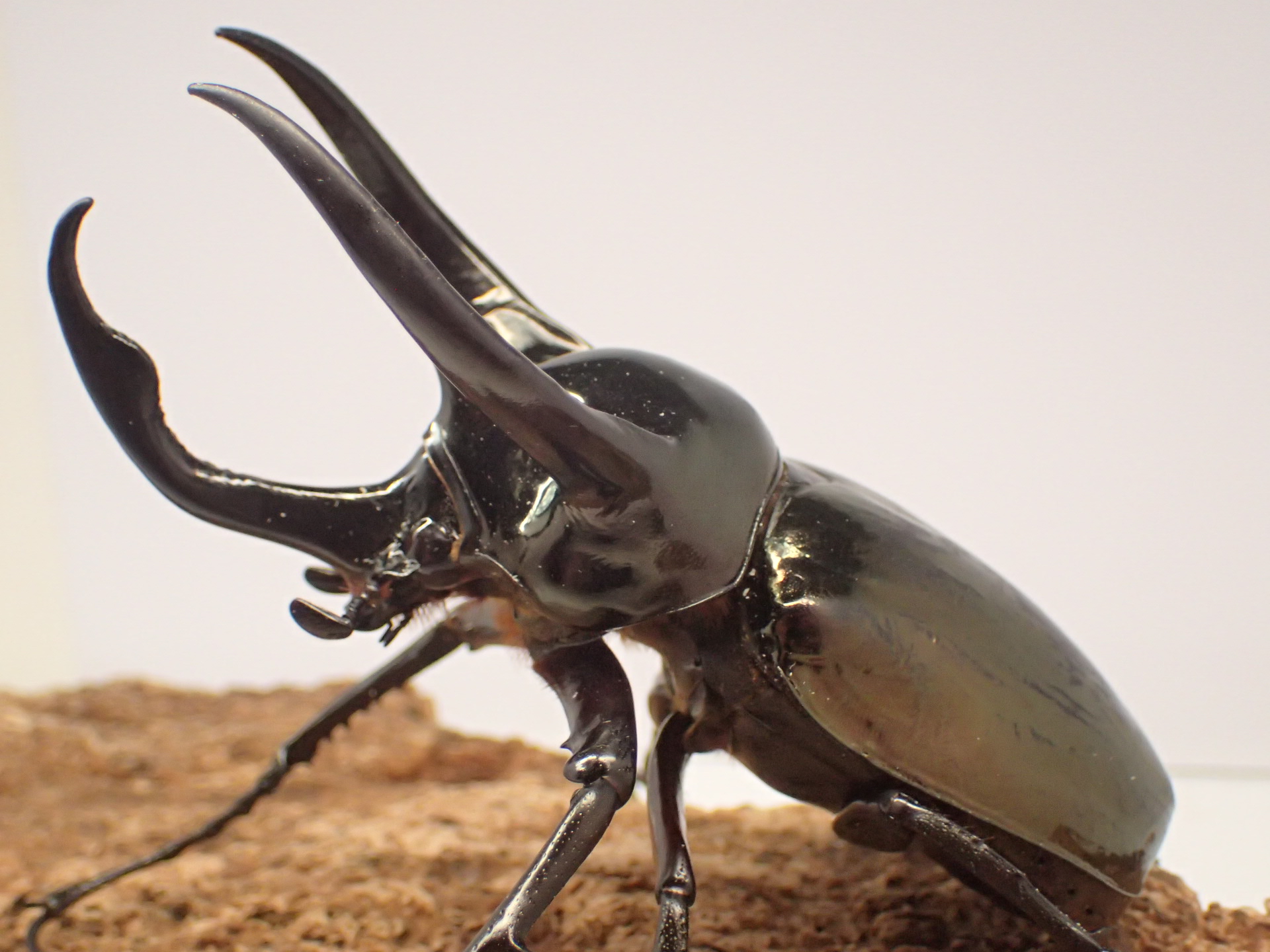 フィリピンに広く分布するフィリピンアトラスは、アトラスオオカブトの中で最大亜種で、頭角先端付近に三角形状の突起があり、前胸背板中央の突起は斜め上方を向いて大きくなります。