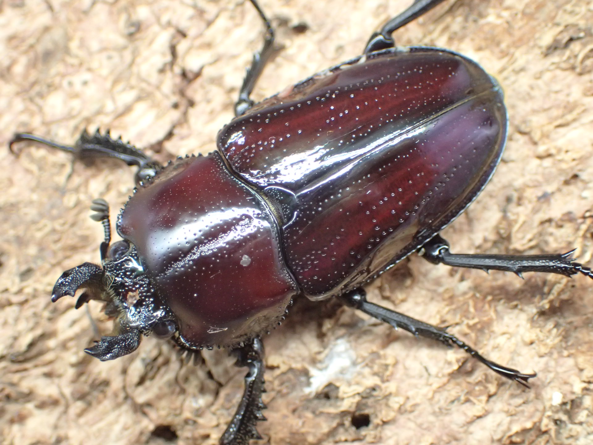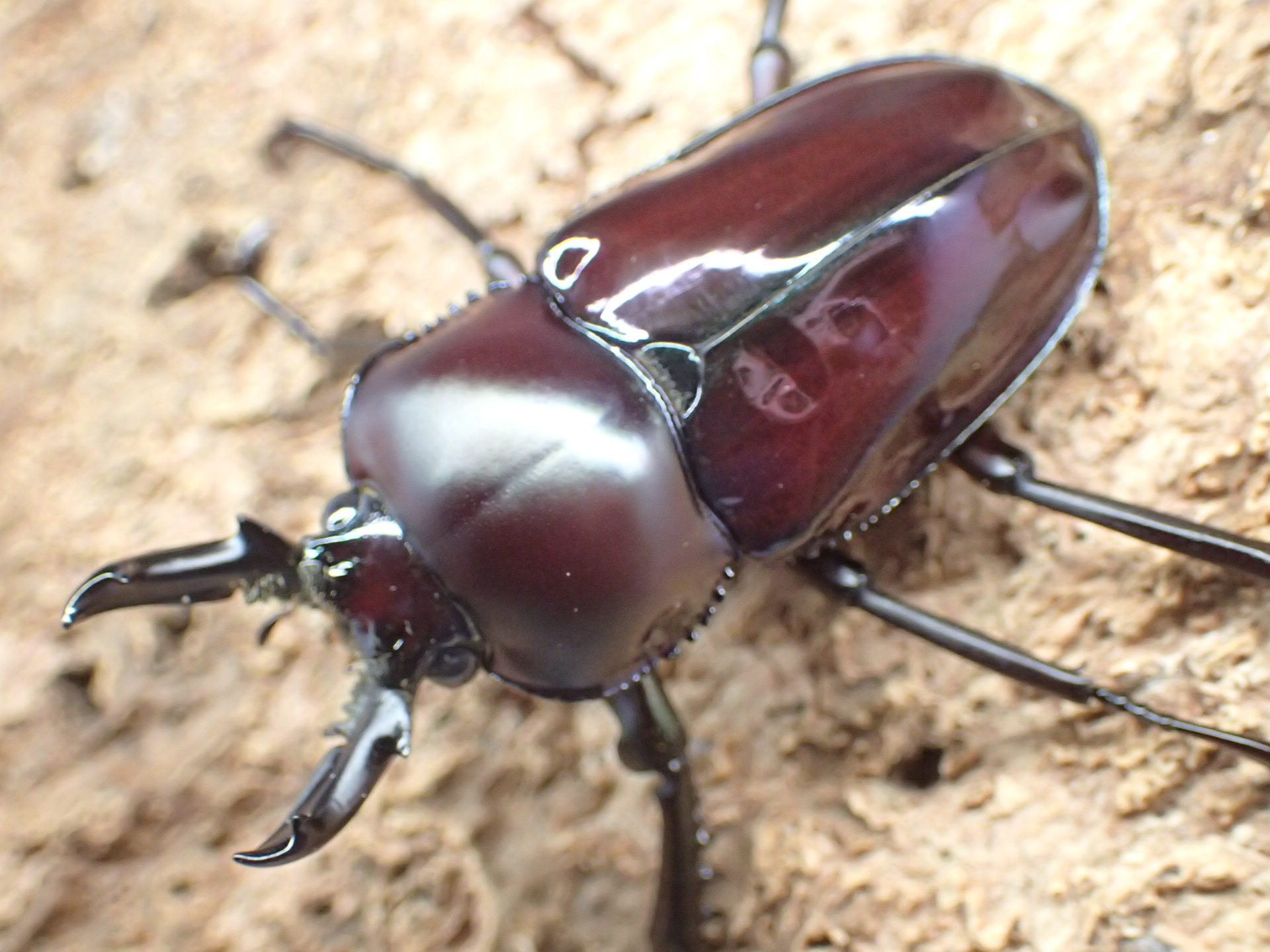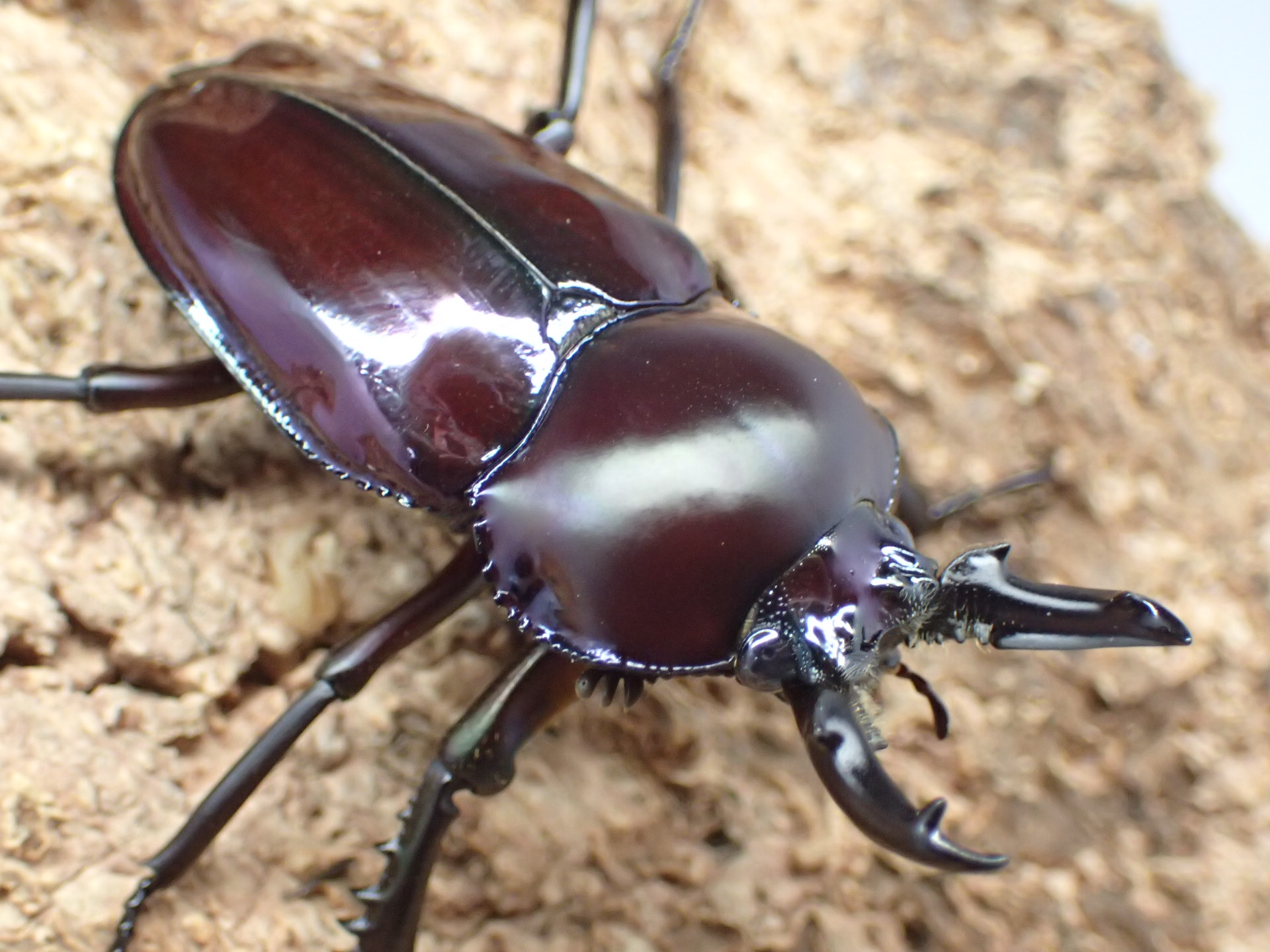 前胸背板は通常ツヤ消しですが、光沢を伴う個体も出現するなど、変異の多いクワガタです。
