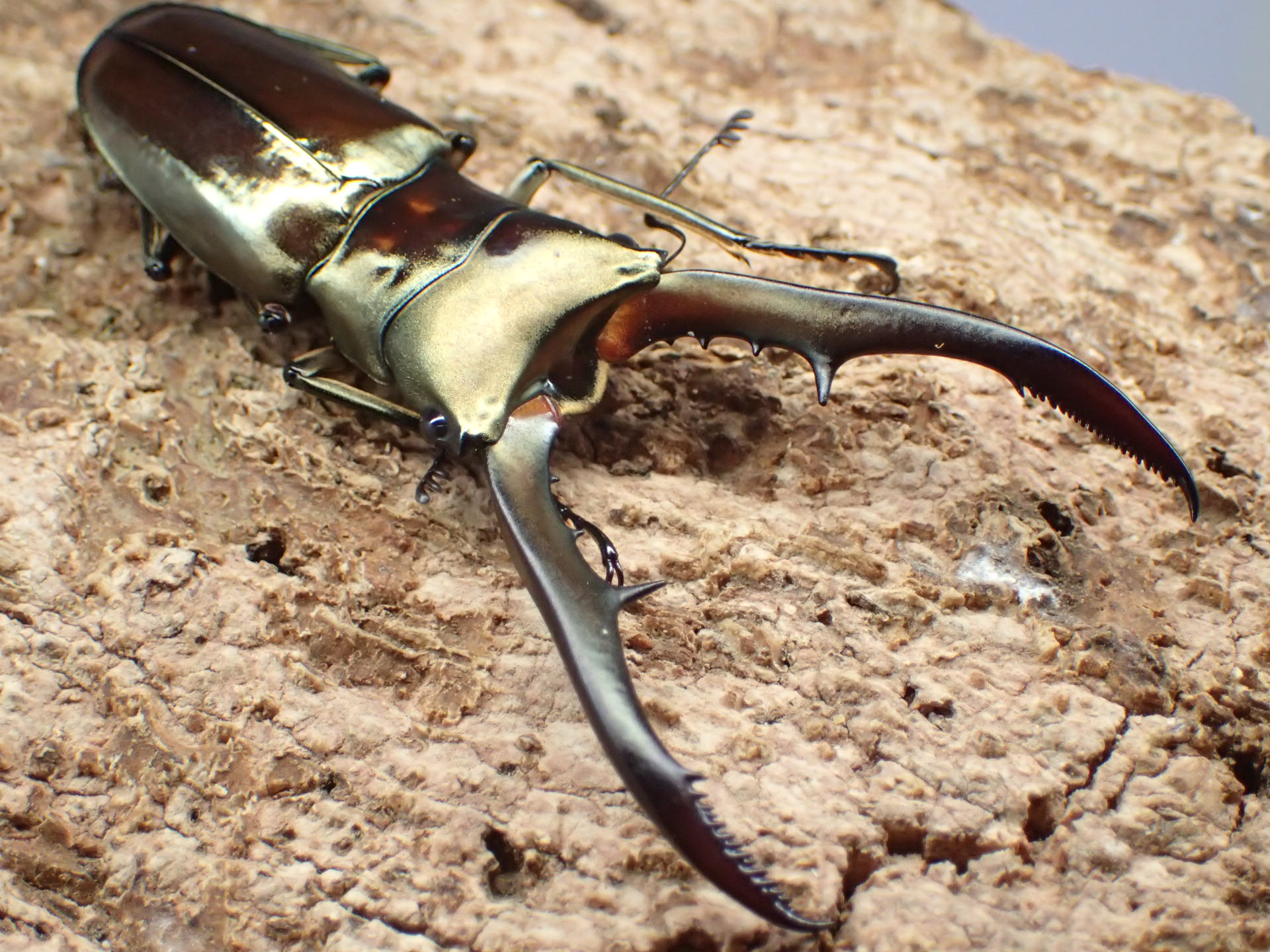 (大アゴが体より長くなる種類は世界のクワガタの中でもメタリフェルホソアカクワガタとコガシラクワガタの2種類のみと言われています。)