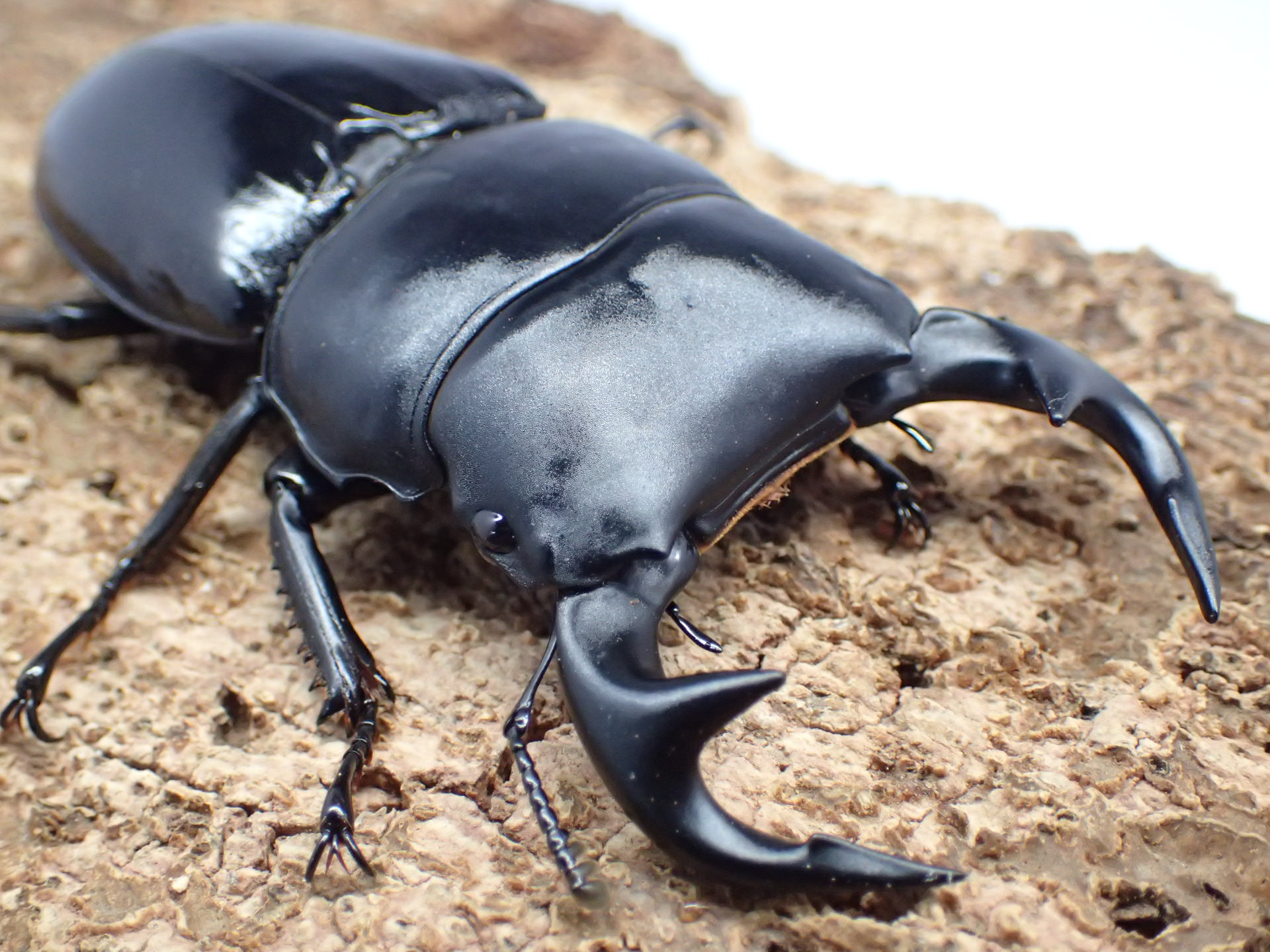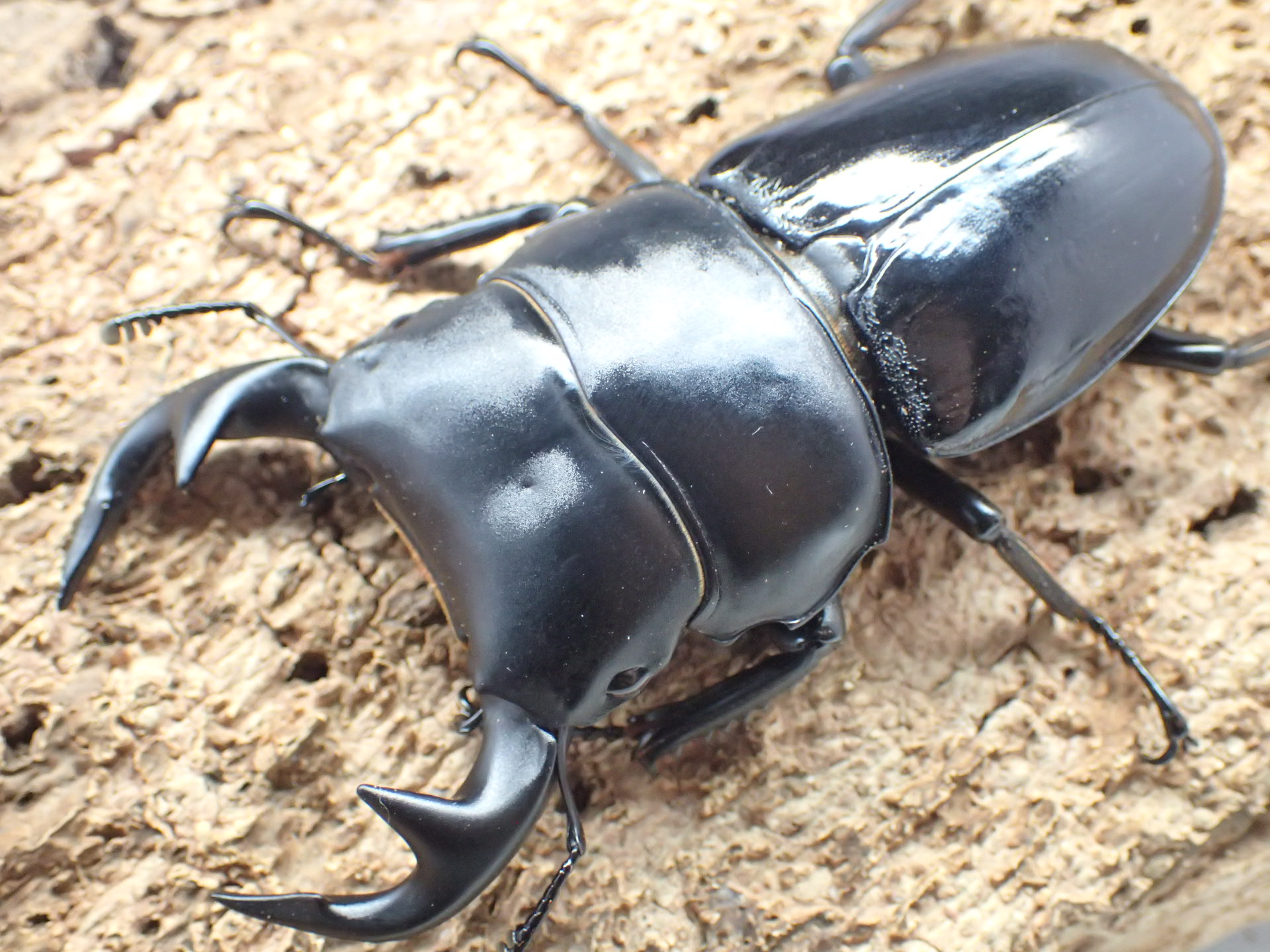 国産オオクワガタに似ていますが、体は幅広く大型で、90mmを超える個体の採集記録もあります。