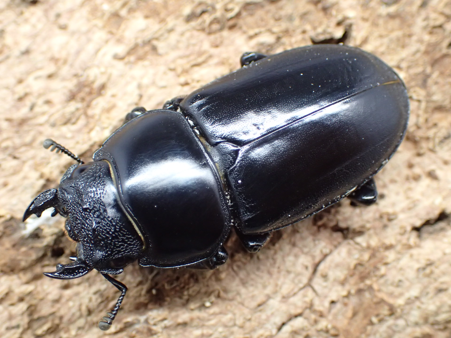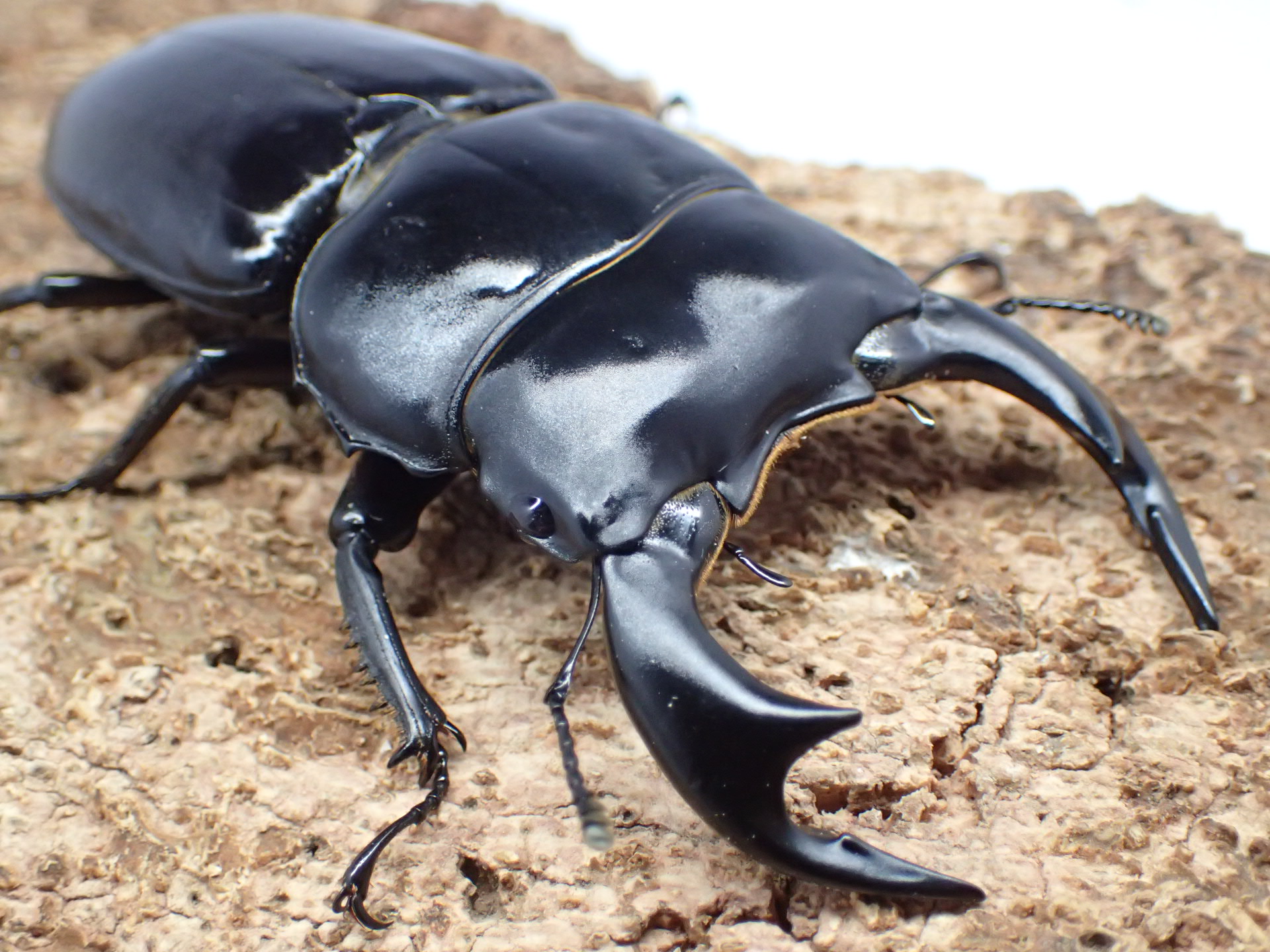 体が幅広く光沢があり、大アゴは太短く、「く」の字に屈曲します。