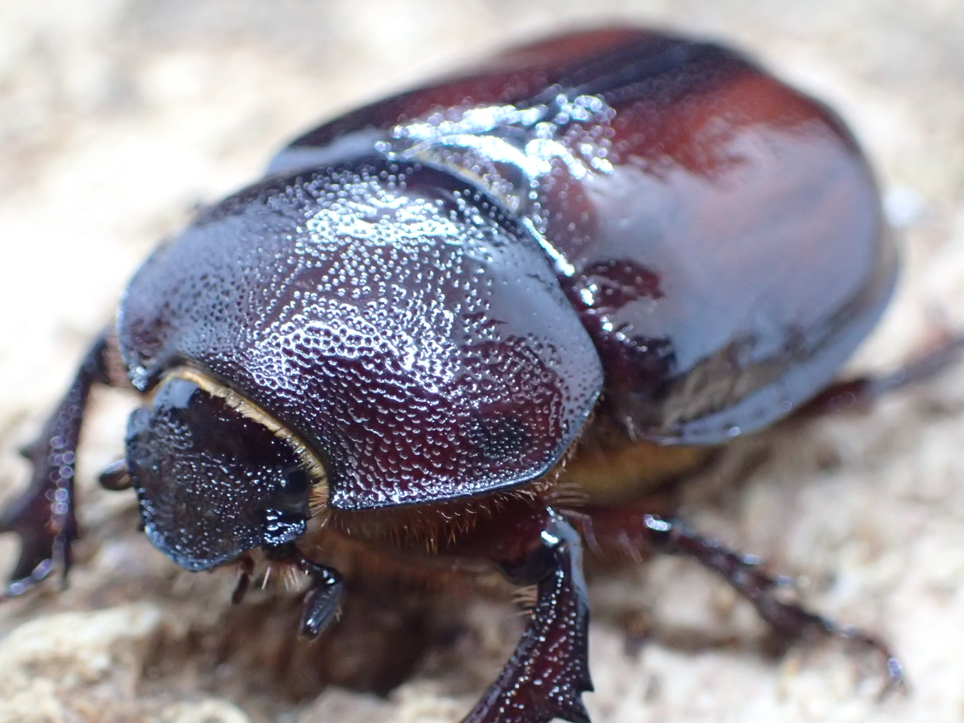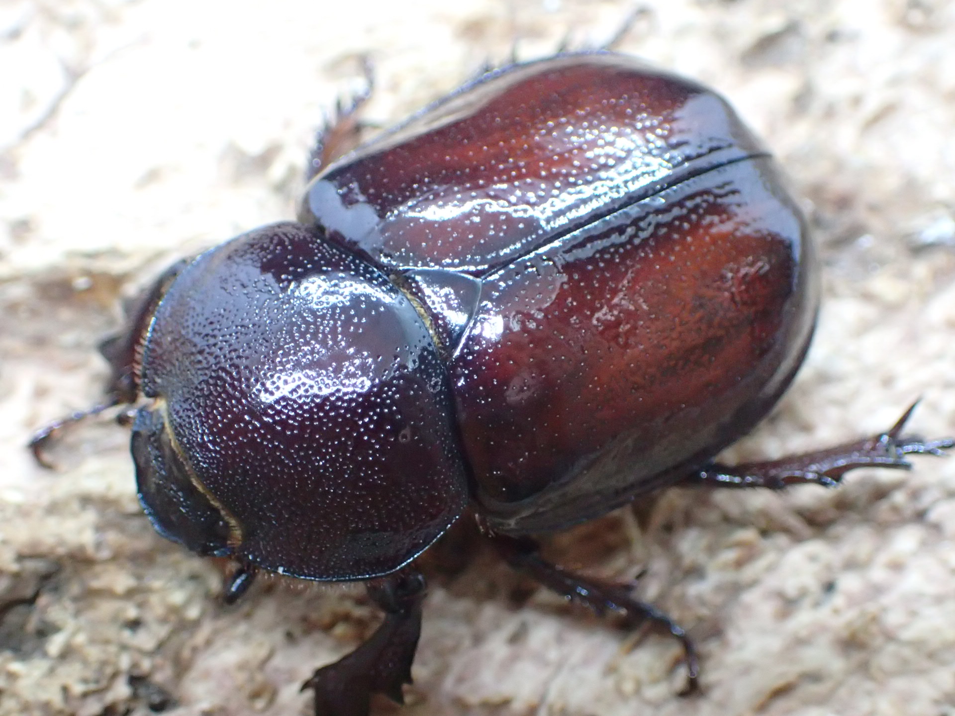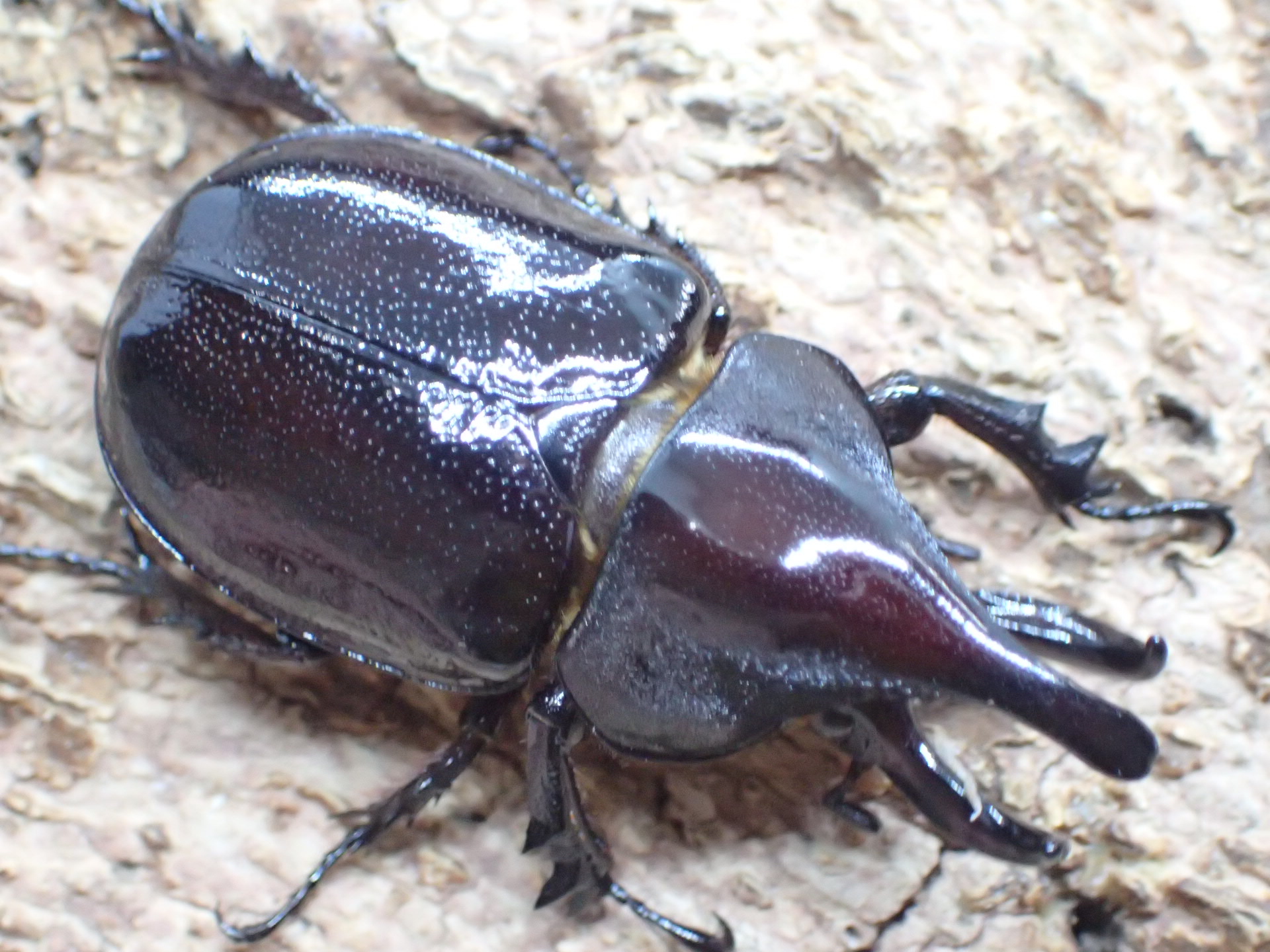体は黒~褐色で光沢が強く、頭角は長く前方に伸びて、胸角も大きく発達します。