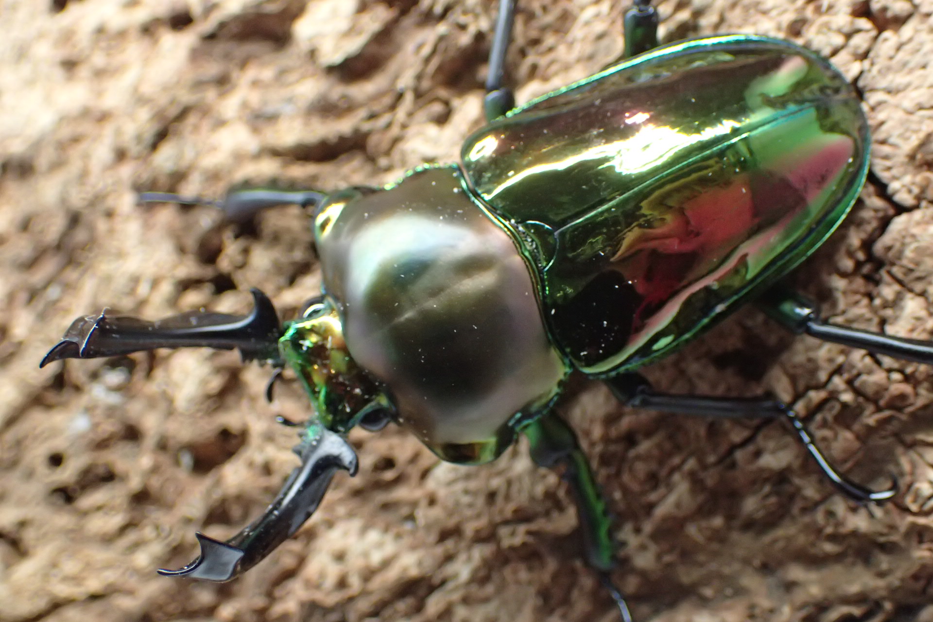 「世界で最も美しいクワガタ」として有名で、上翅には覗き込んだ自分の顔が映るほどの鏡のような強い金属光沢があり、赤や緑が入り混じる型から、緑色が強い型、赤色が強い個体など色彩変異があります。