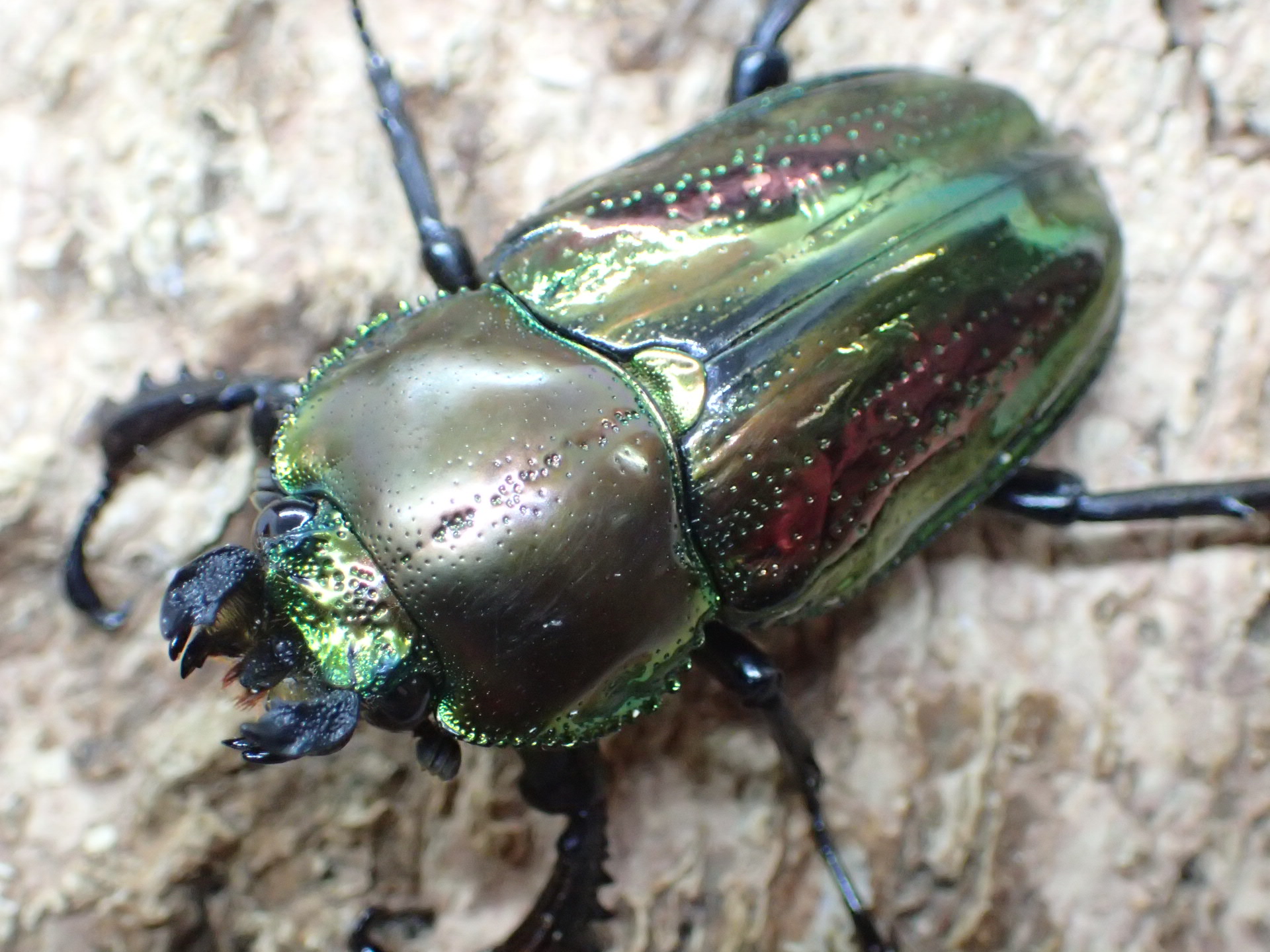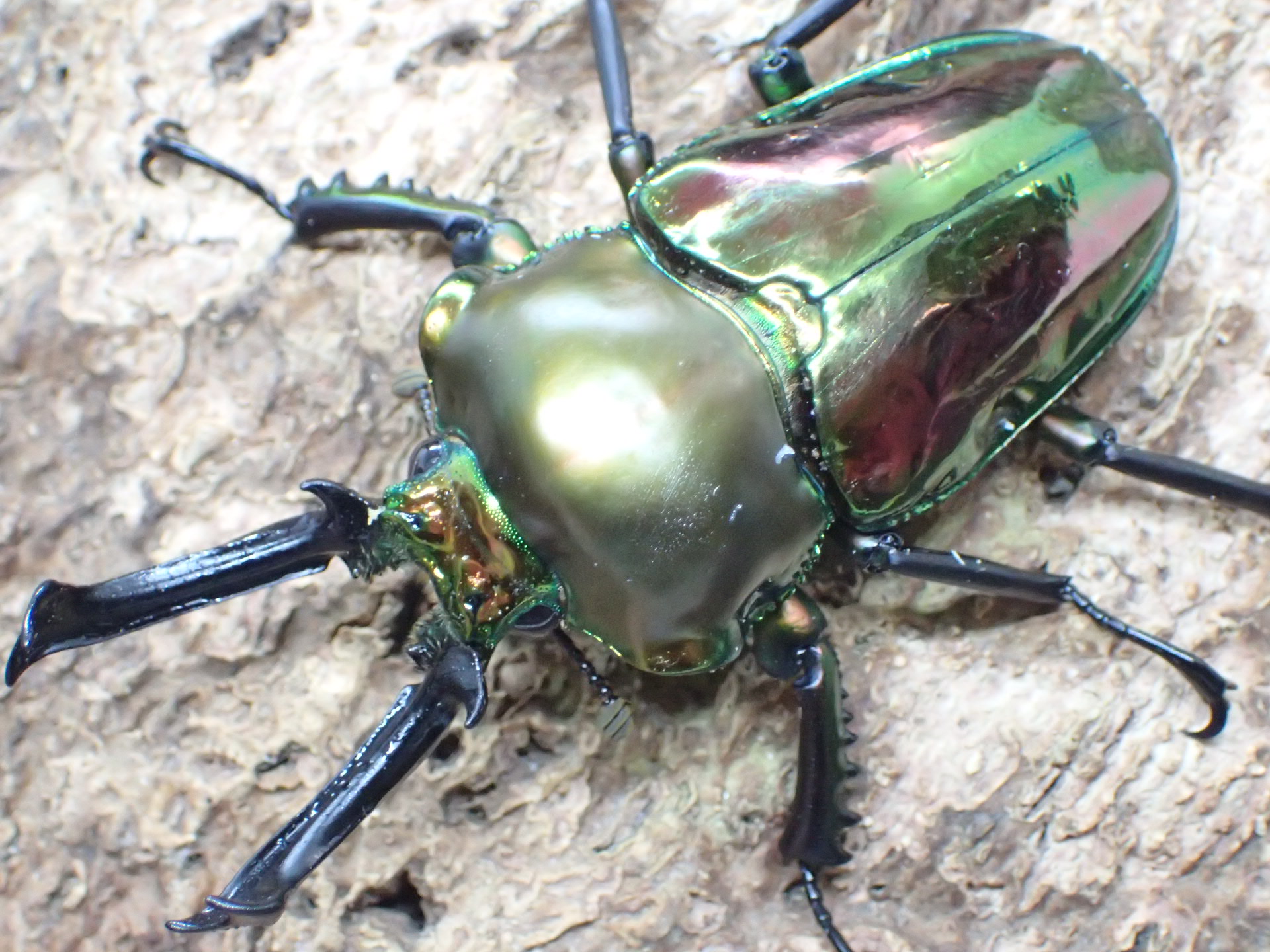 「世界で最も美しいクワガタ」として有名で、上翅には覗き込んだ自分の顔が映るほどの鏡のような強い金属光沢があり、赤や緑が入り混じる型から、緑色が強い型、赤色が強い個体など色彩変異があります。