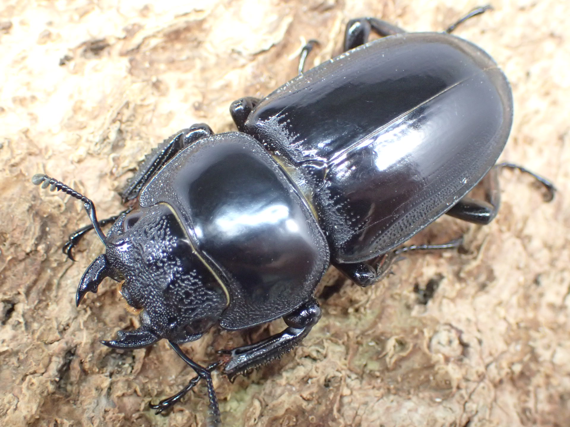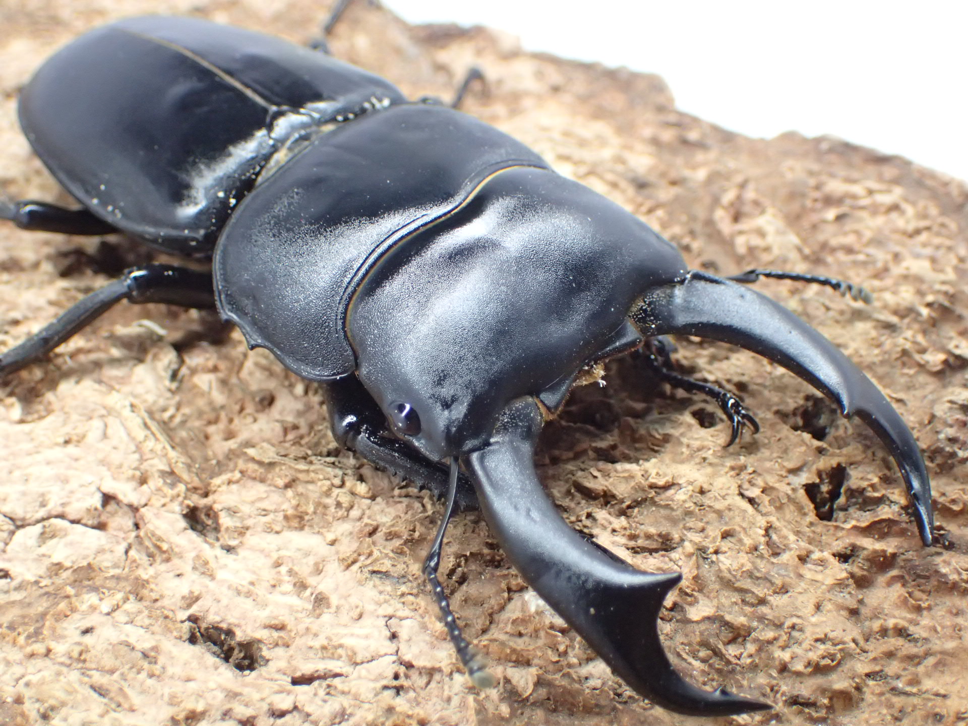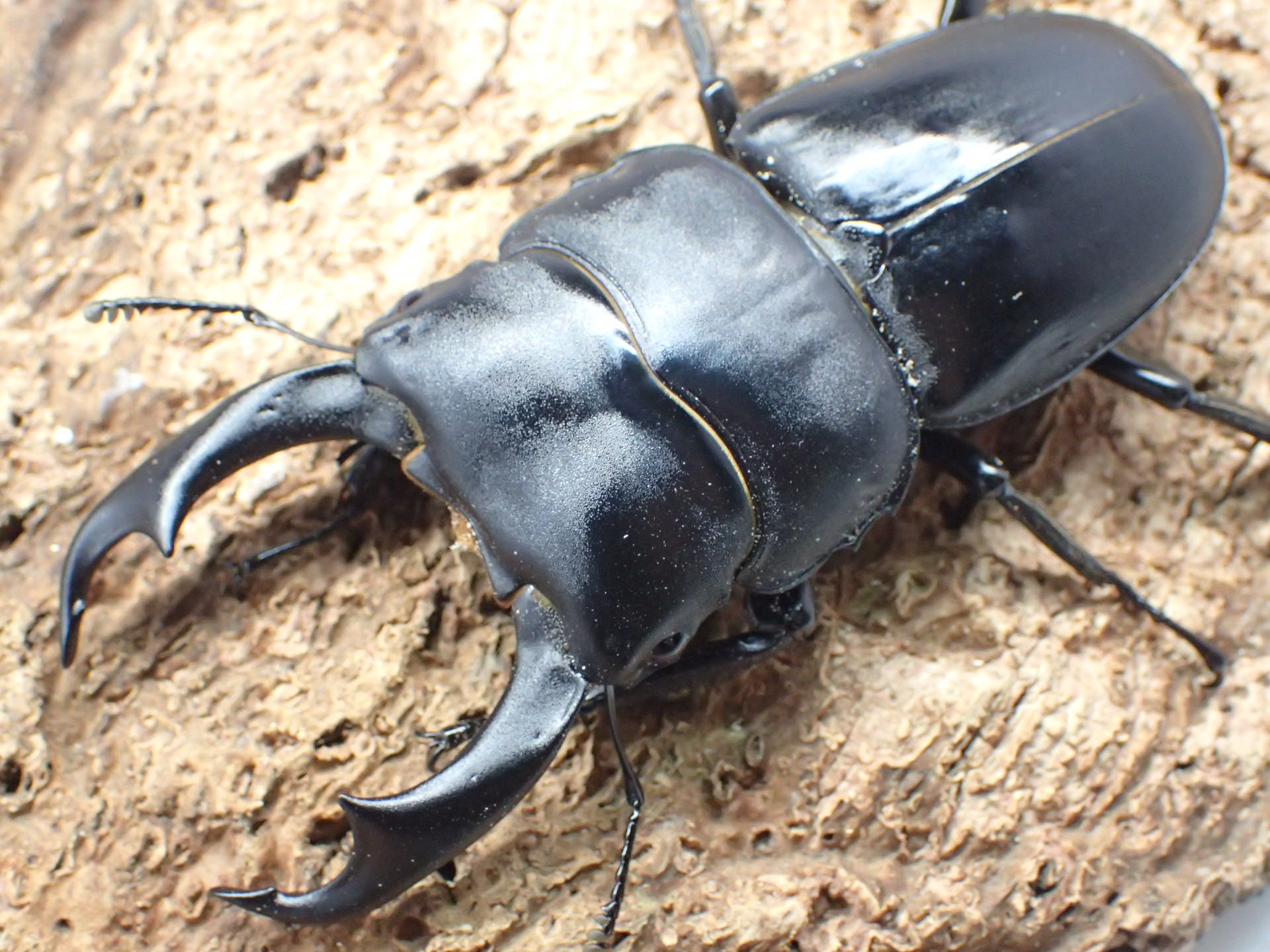 日本のコクワガタを巨大化させたようなフォルムですが、90㎜に迫る大型のクワガタで、アンタエウスオオクワガタに近いグループです。