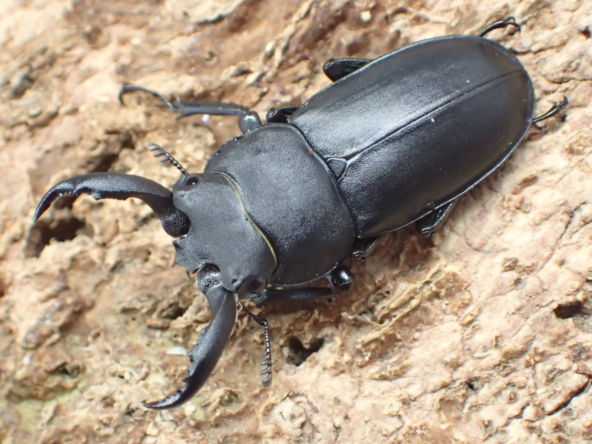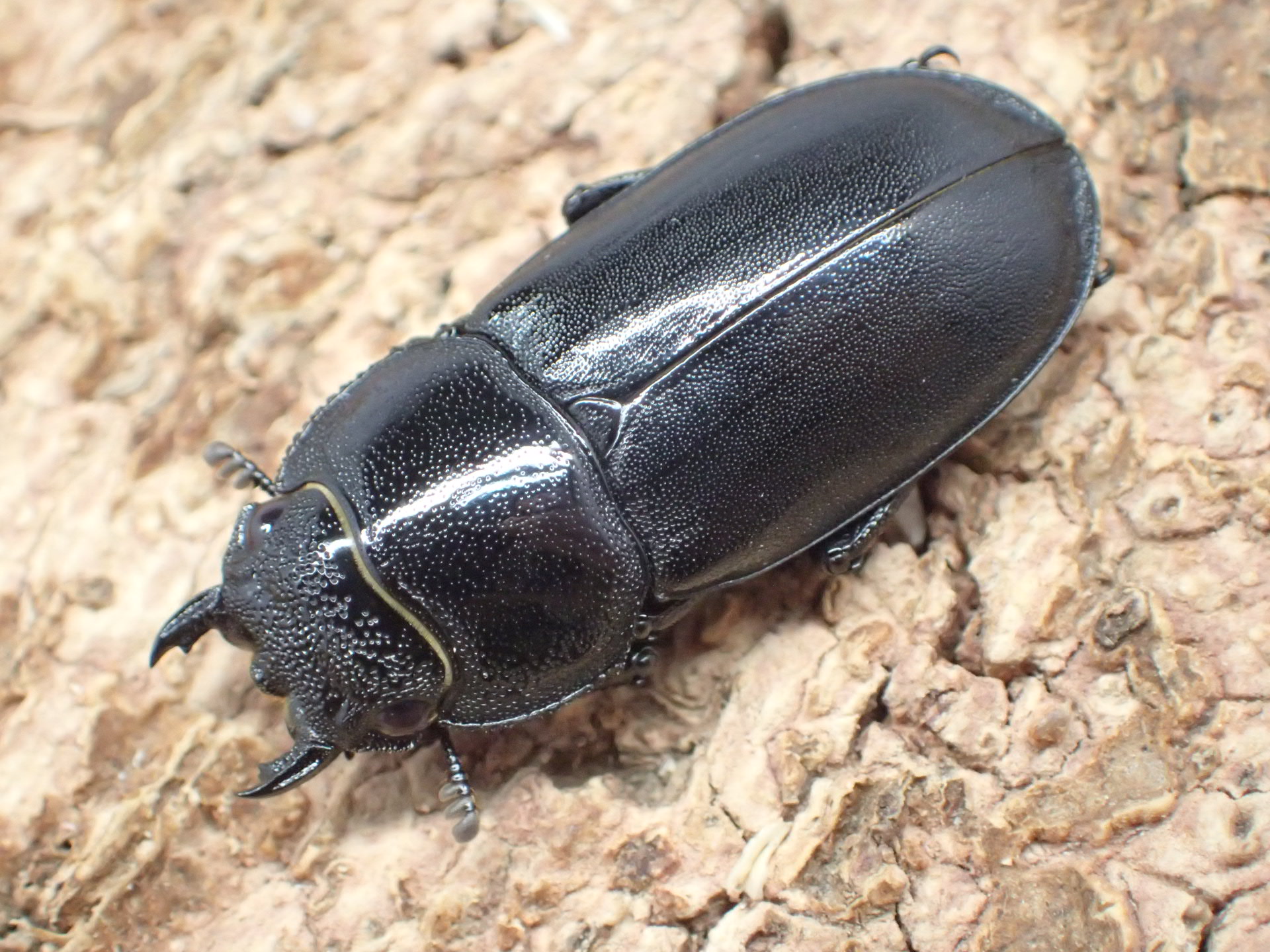体はツヤ消し状の黒色で、大アゴは基部で斜め前方を向いて上反して、角張って曲がって下方に湾曲しながら前方へ伸びて先端は大きく上下に二又に分かれます。