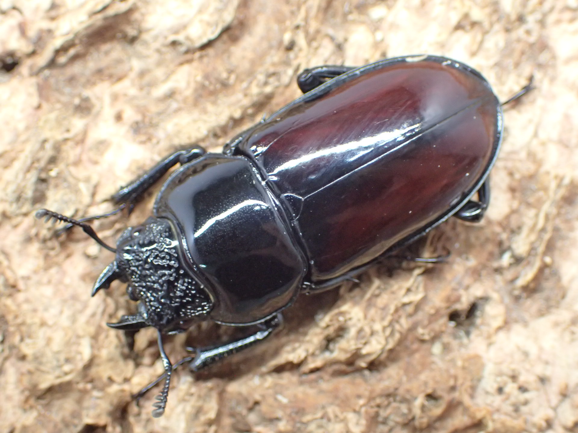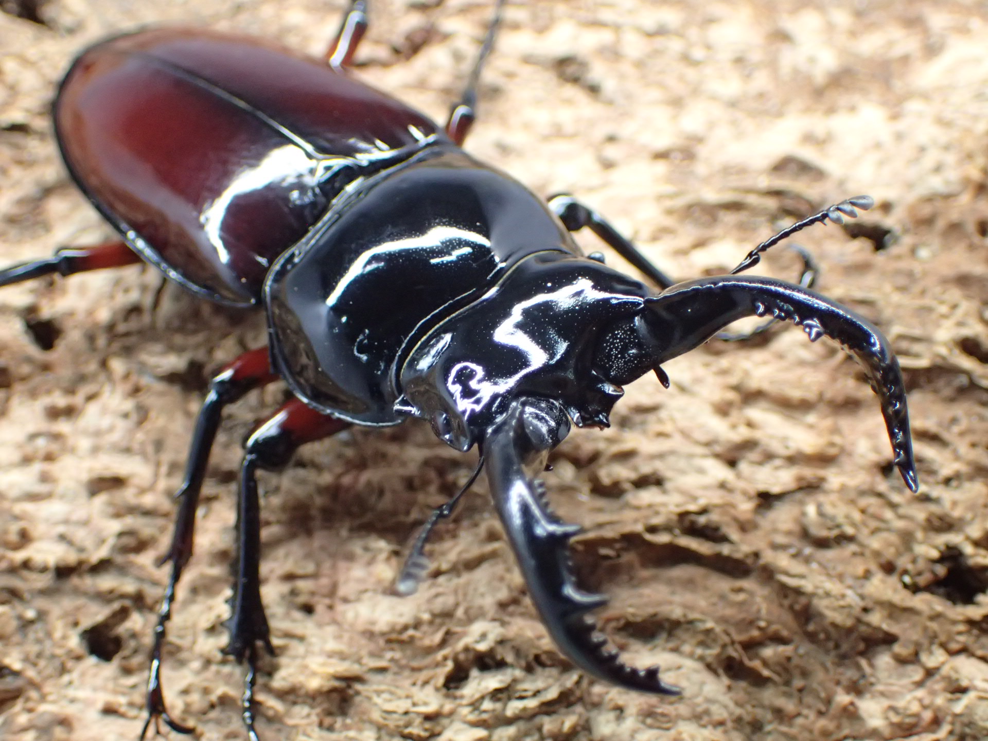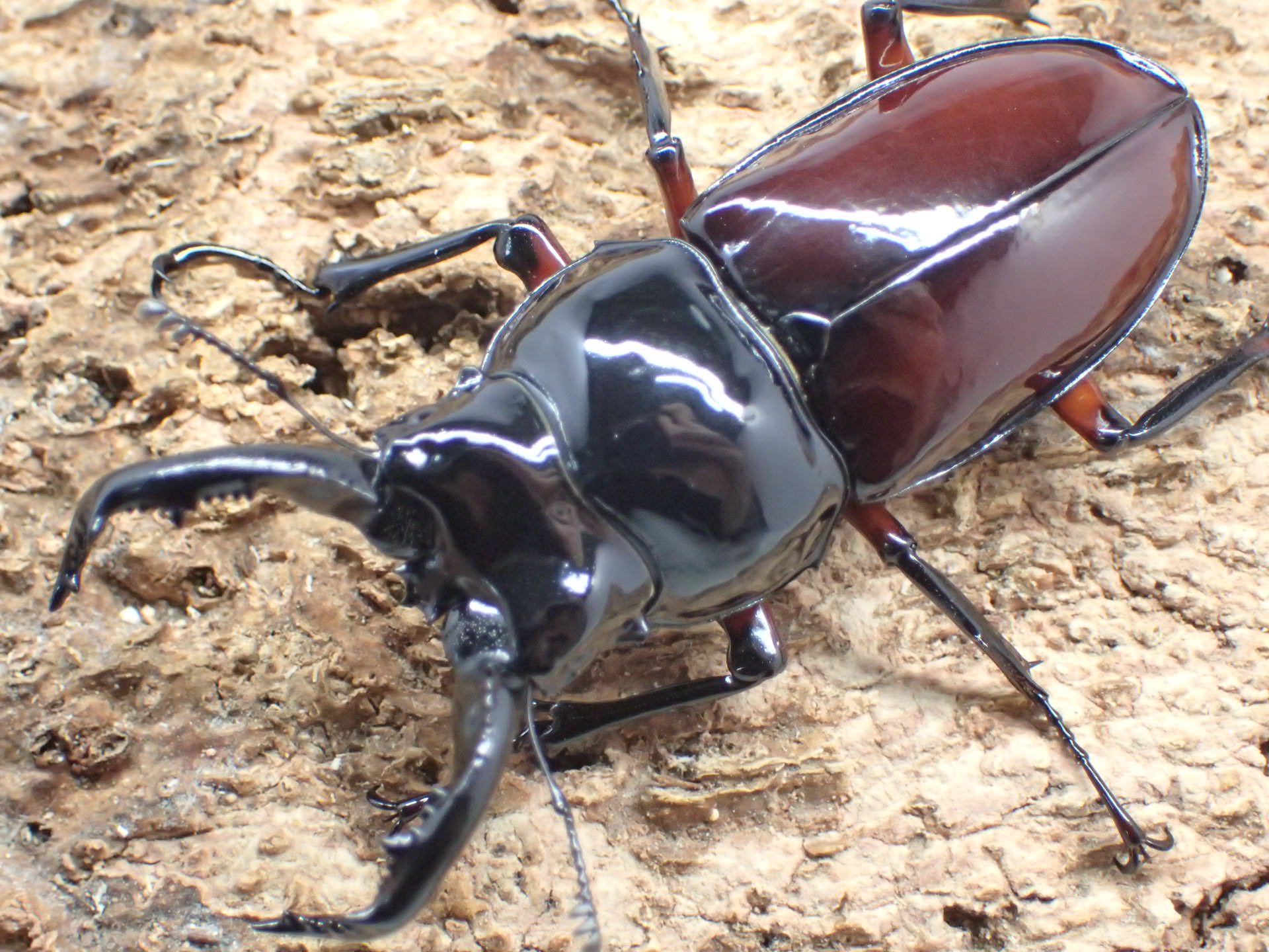 タランドゥスオオツヤクワガタやレギウスオオツヤクワガタにも劣らない、エナメルを塗ったような強い光沢をもち、赤褐色の上翅と漆黒の美しいクワガタです。