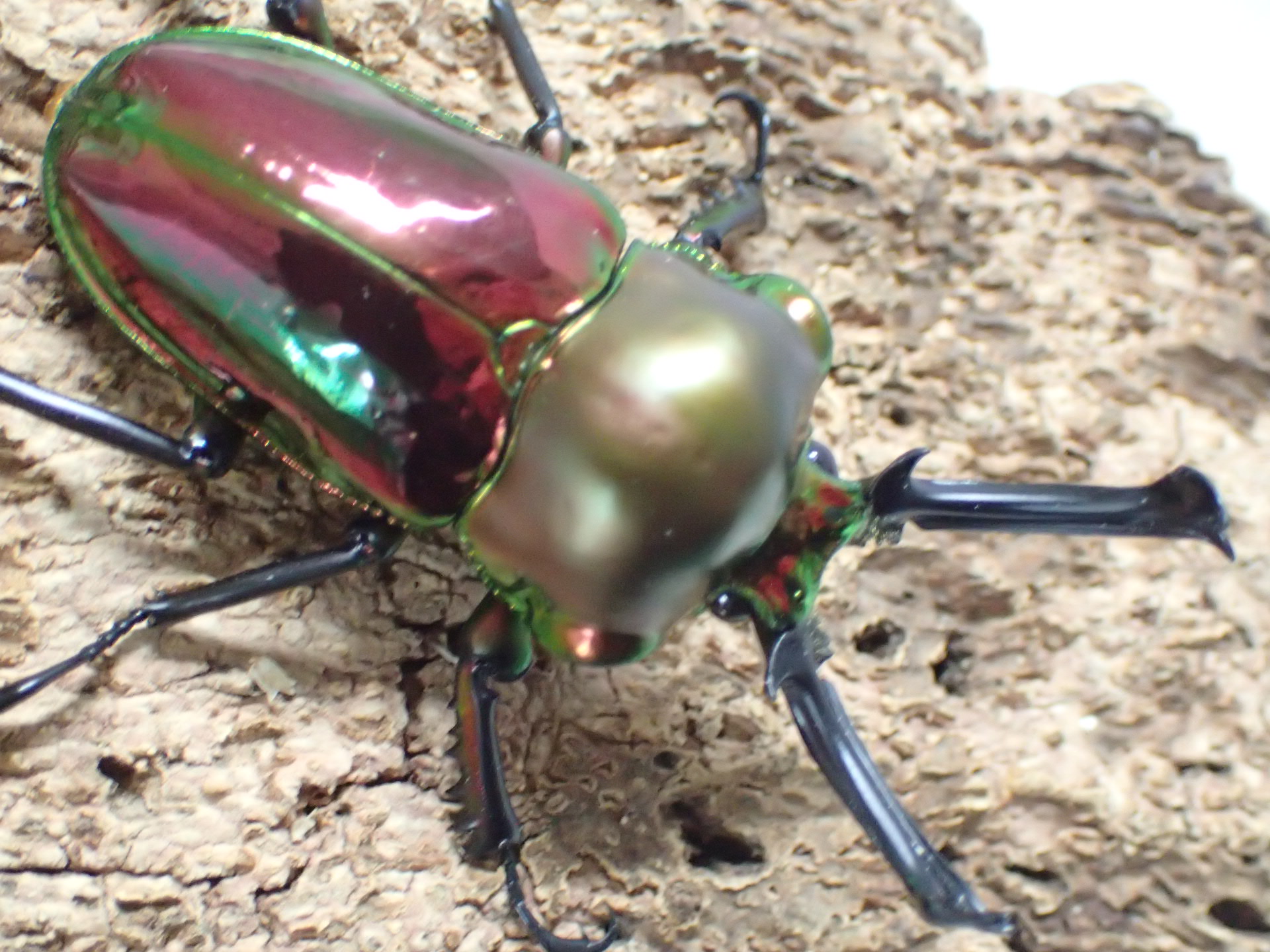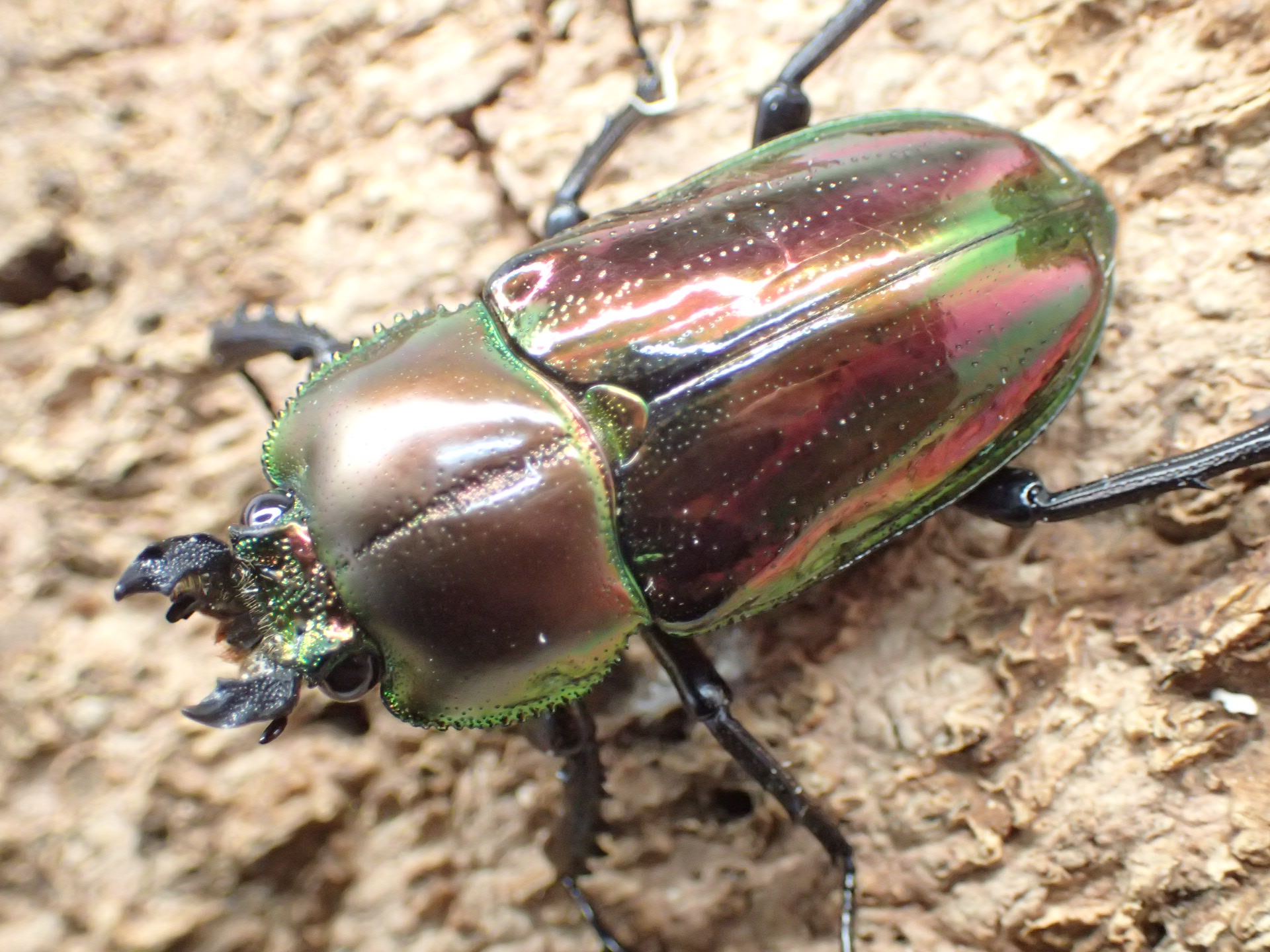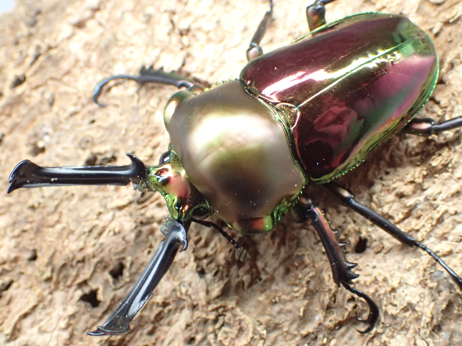 「世界で最も美しいクワガタ」として有名で、上翅には覗き込んだ自分の顔が映るほどの鏡のような強い金属光沢があり、赤や緑が入り混じる型から、緑色が強い型、赤色が強い個体など色彩変異があります。