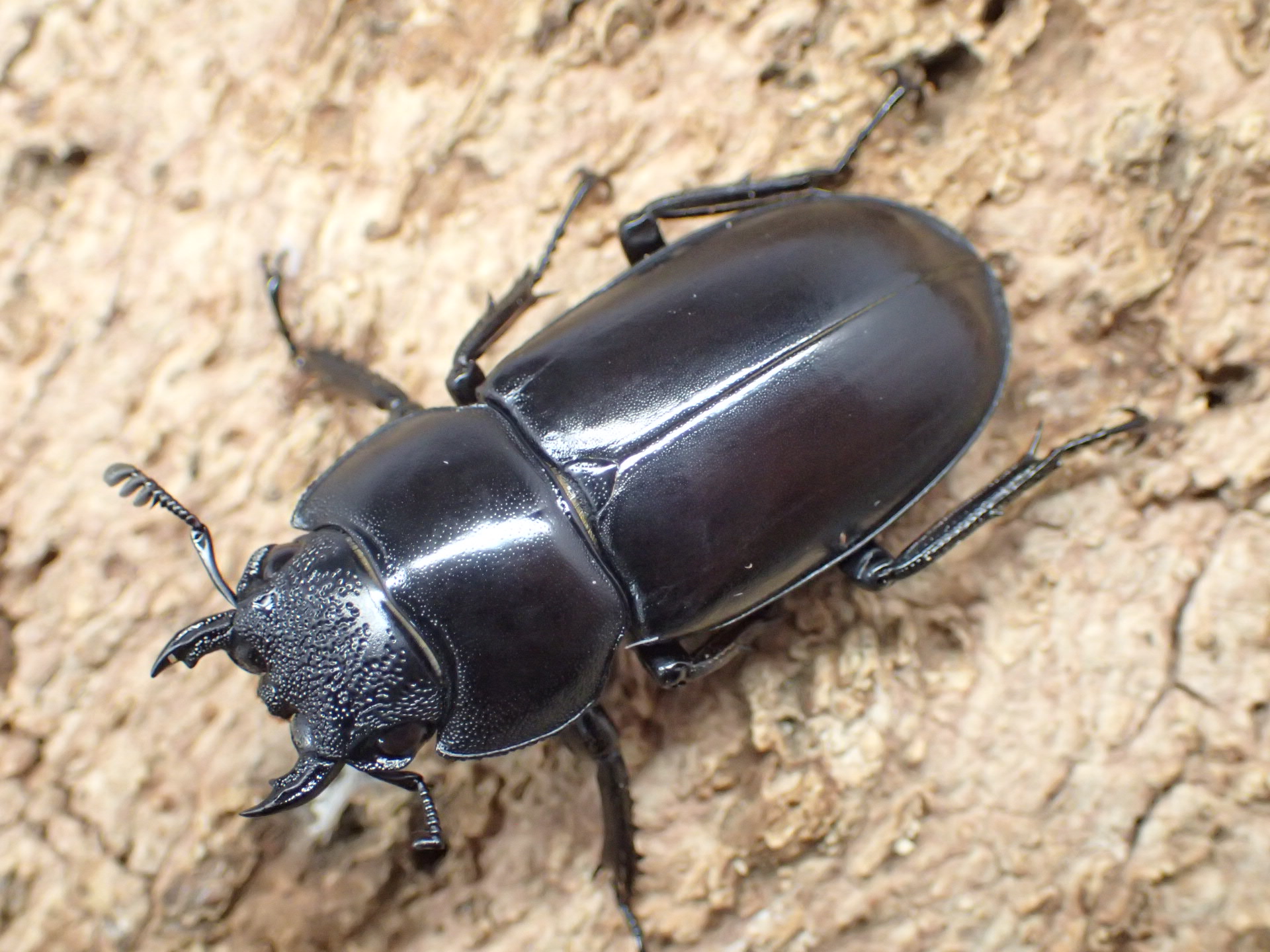 大アゴ、頭部、前胸背板、前脚はツヤ消しの黒色で、上翅、中脚、後脚はツヤ消しの暗褐色~黒褐色。