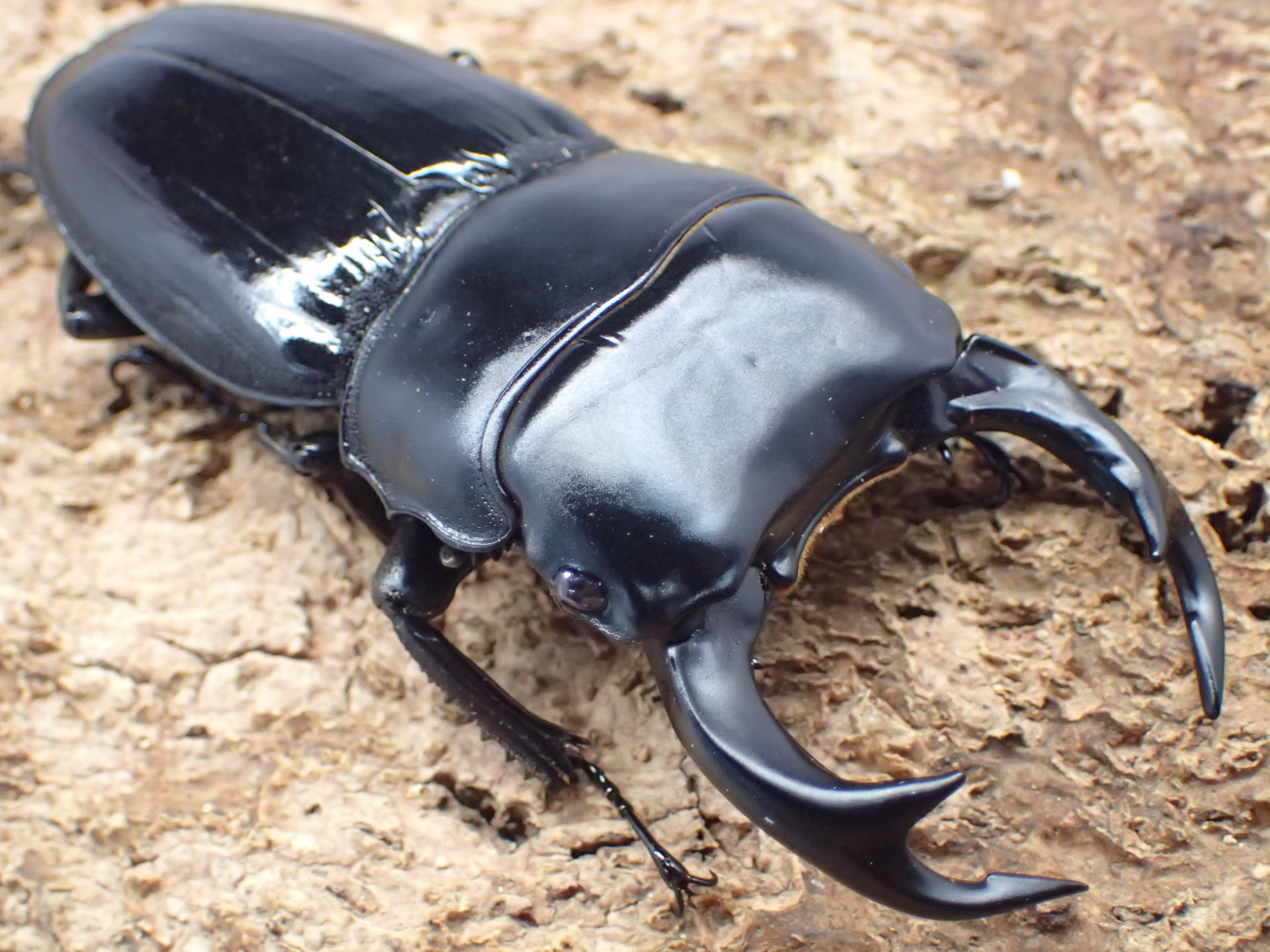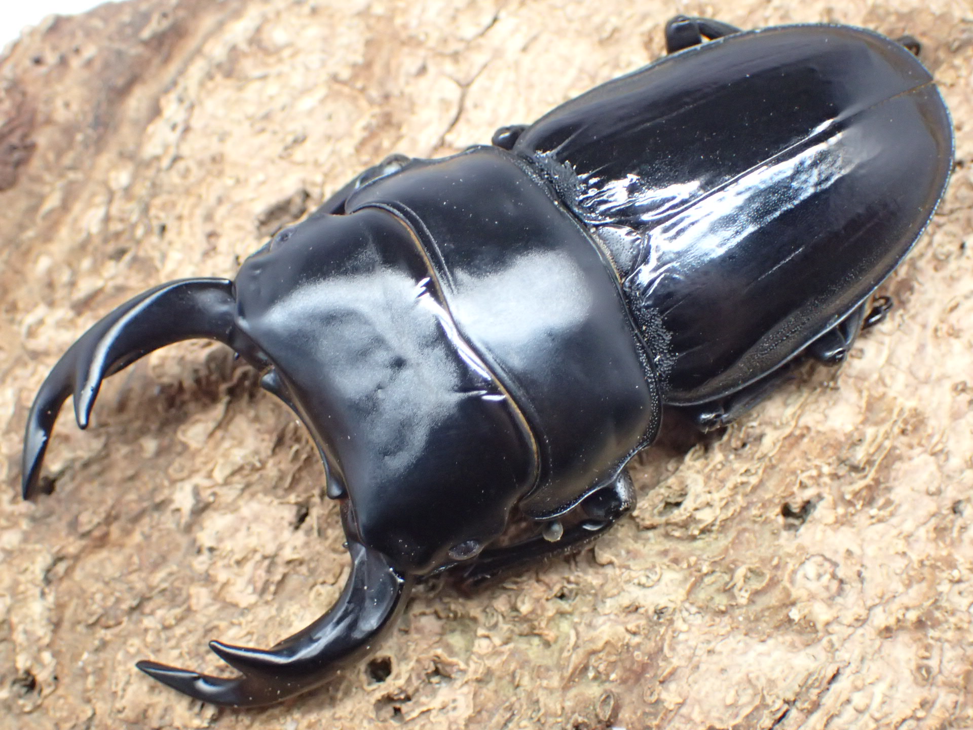 日本のオオクワガタに似ていますが、体がやや平たく光沢が強くなります。