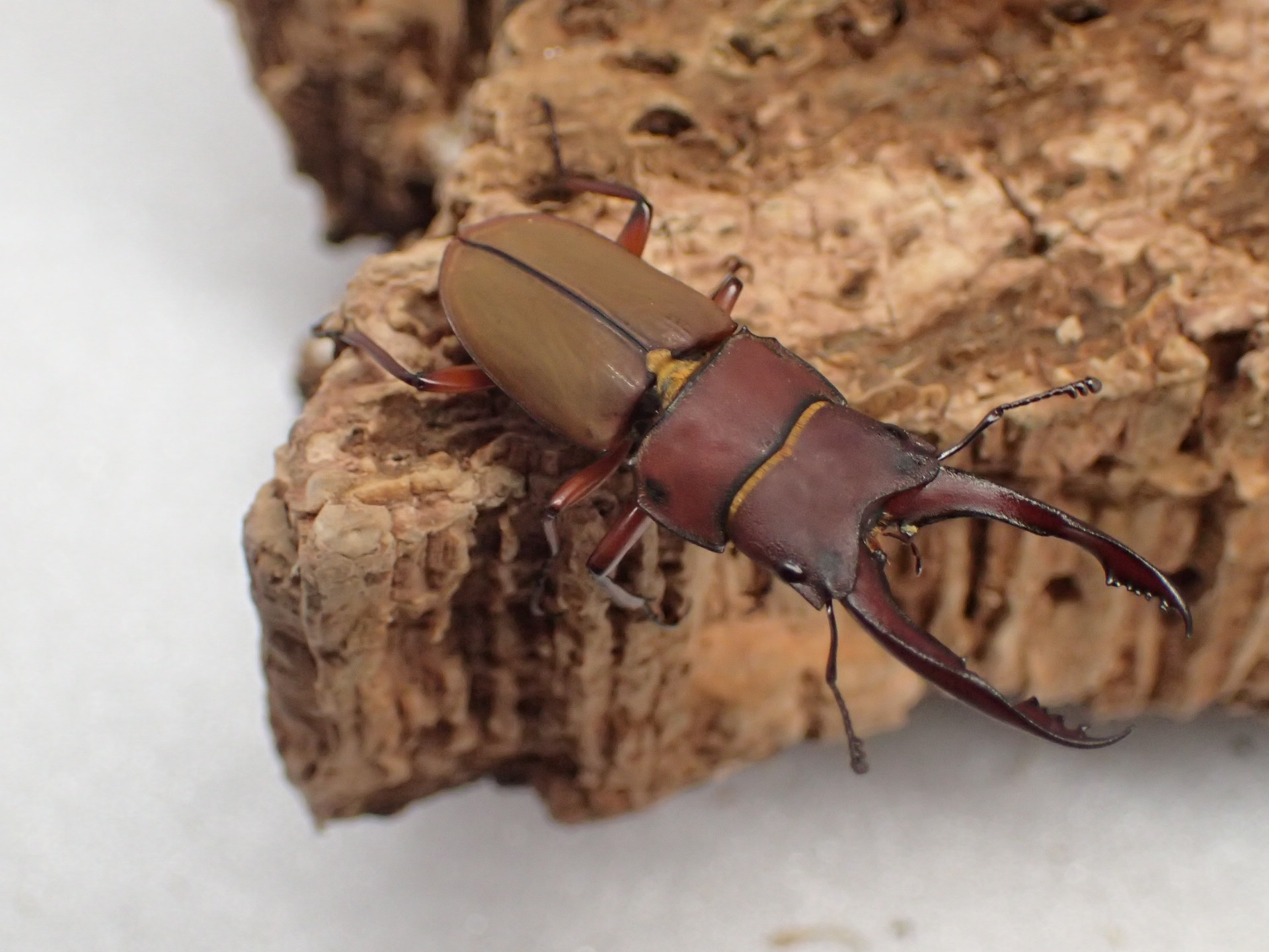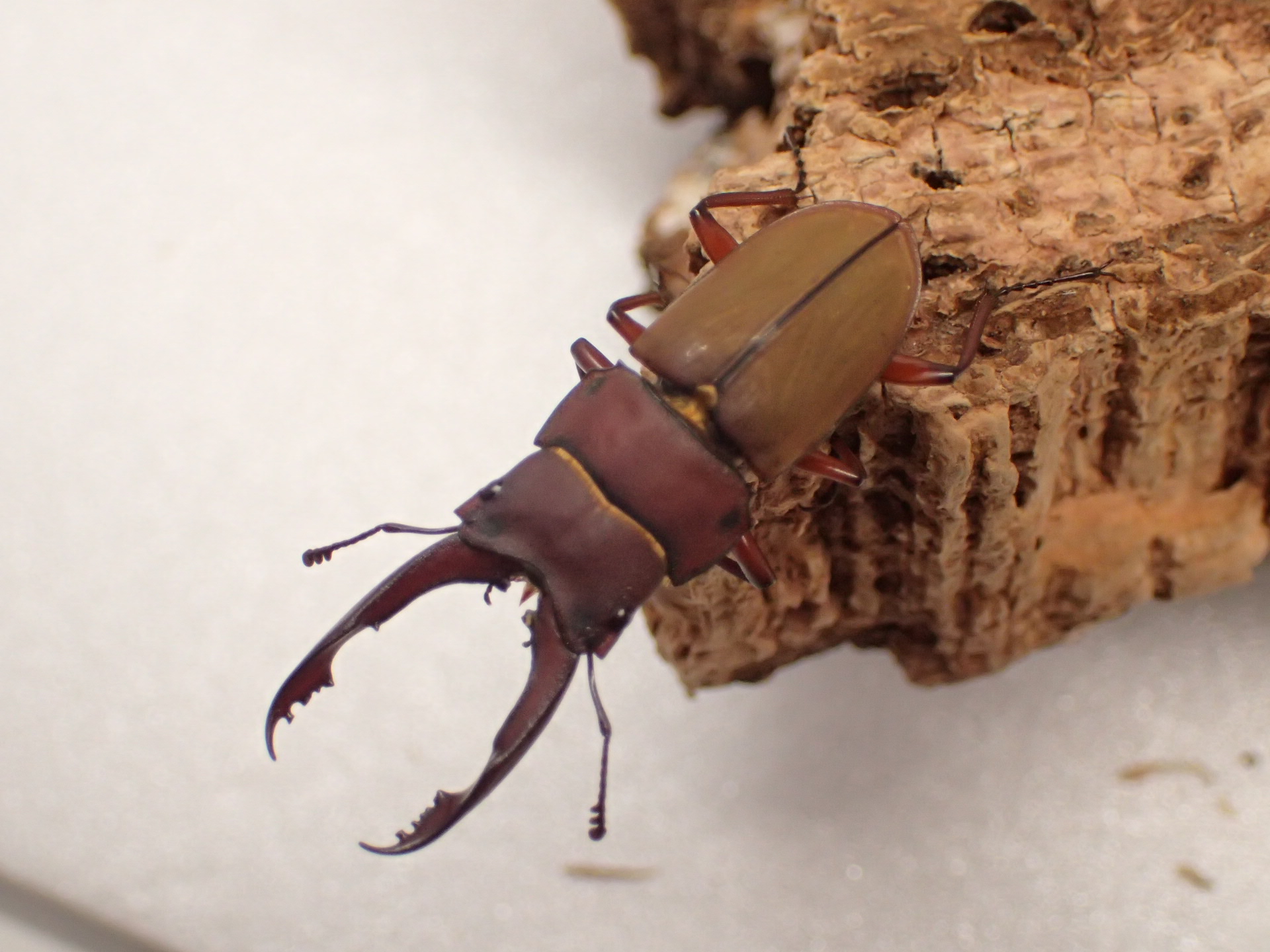 体はツヤ消し状で、大アゴ・頭部・前胸背板は赤色味がかった暗褐色で、上翅は黄褐色のきれいな色味のホソクワガタです。