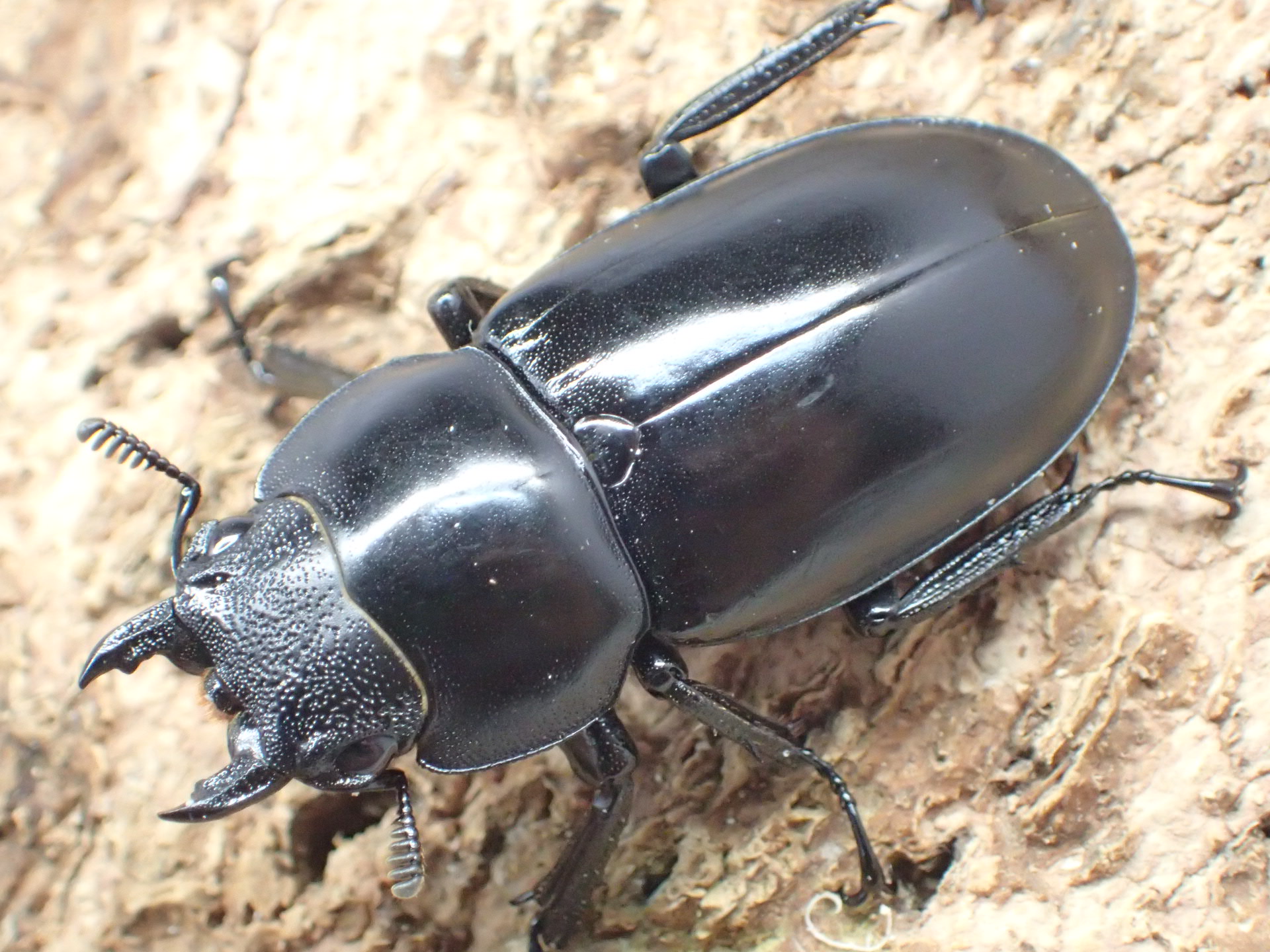 体と大アゴは細長く、頭部・前胸背板は黒褐色で、上翅は黒褐色~明るい褐色まで変異が見られます。